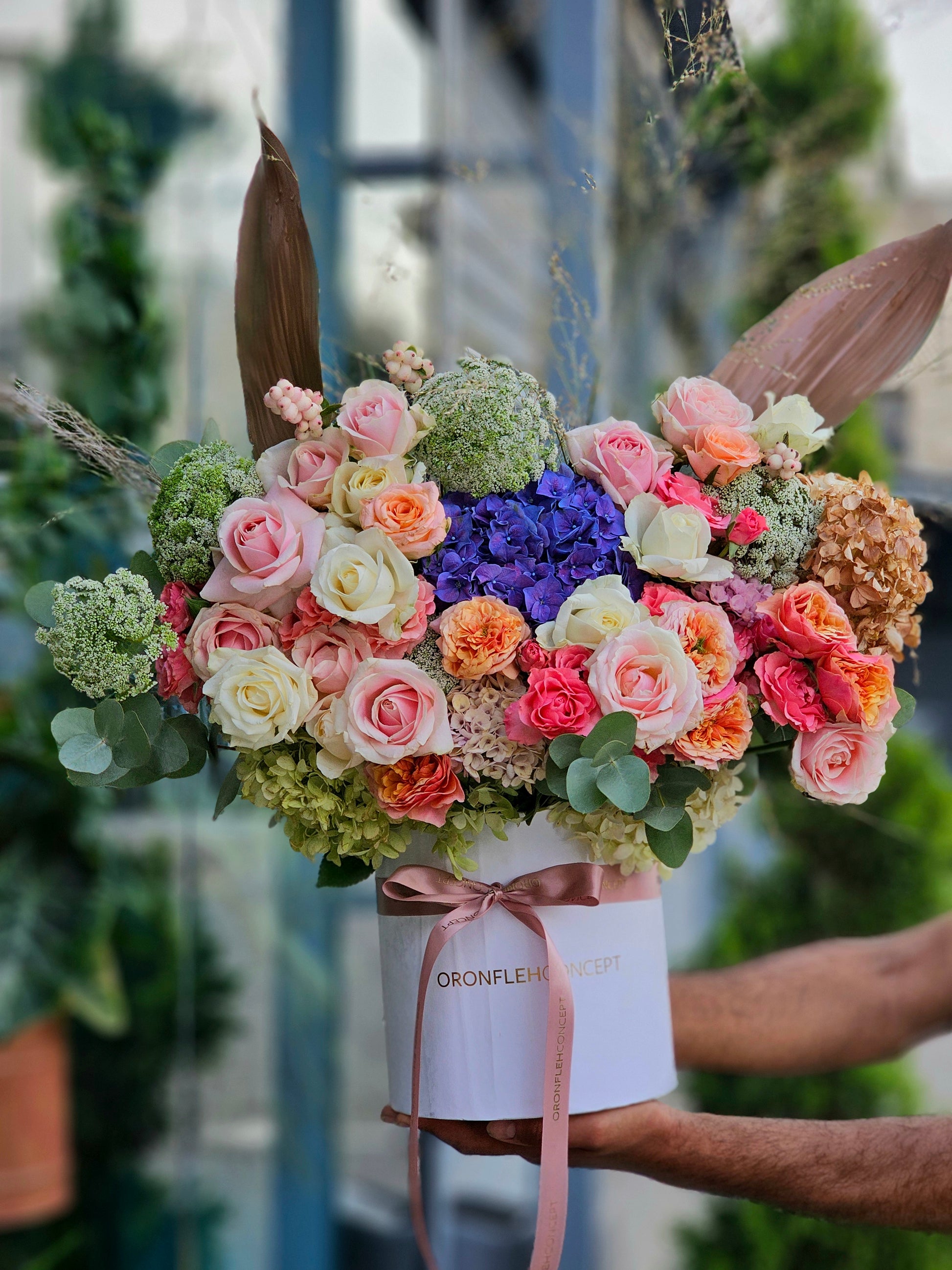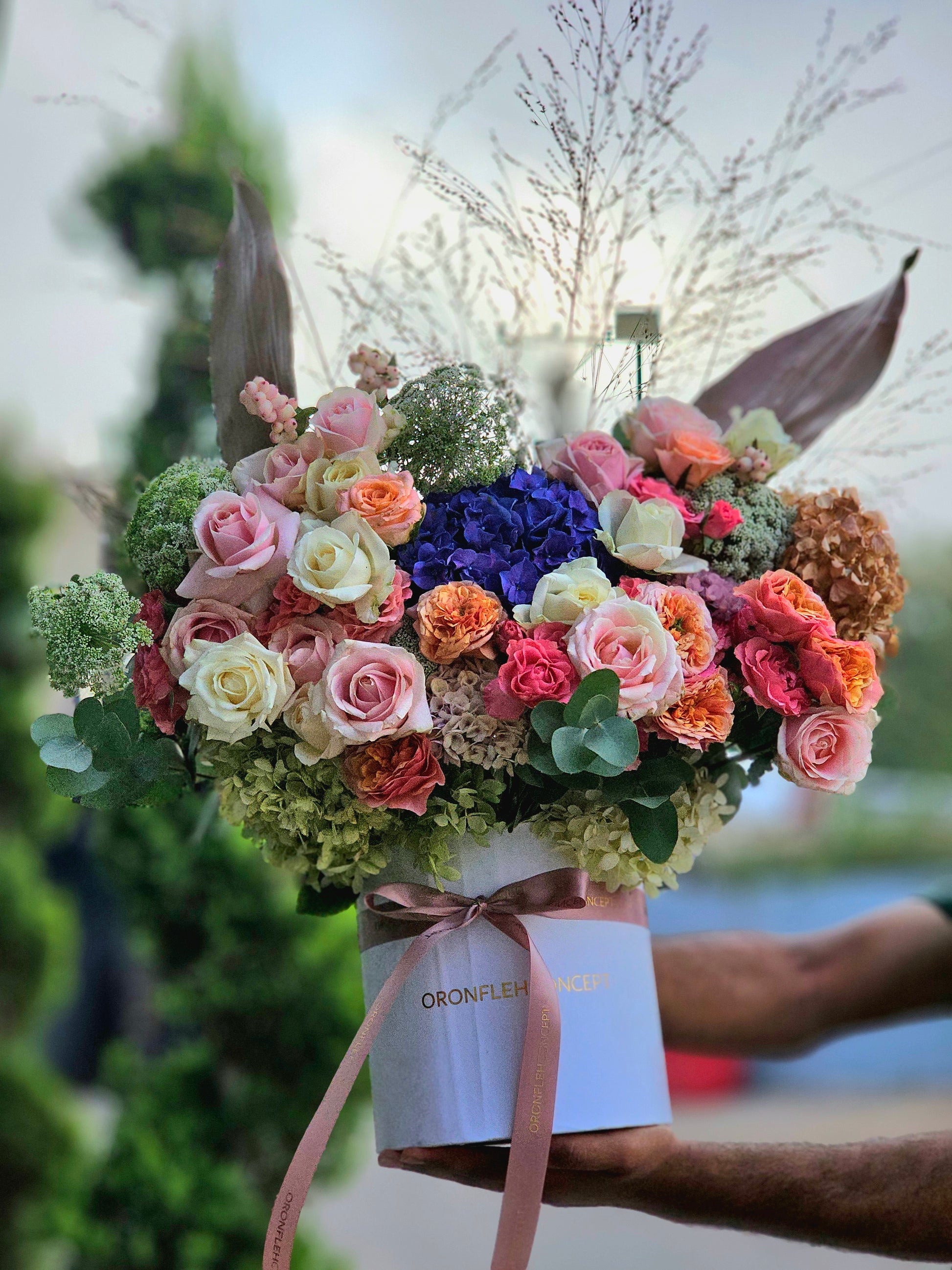 Colorful Flower Arrangement in our Oronfleh Concept box consisting of Roses, Hydrangeas, English Rose & eucalyptus .
