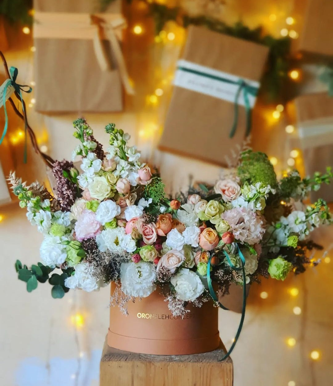 Colorful Flower Arrangement in our Oronfleh Concept box consisting of Roses, Baby Roses, estoma, English Rose,Wallflower & eucalyptus. .