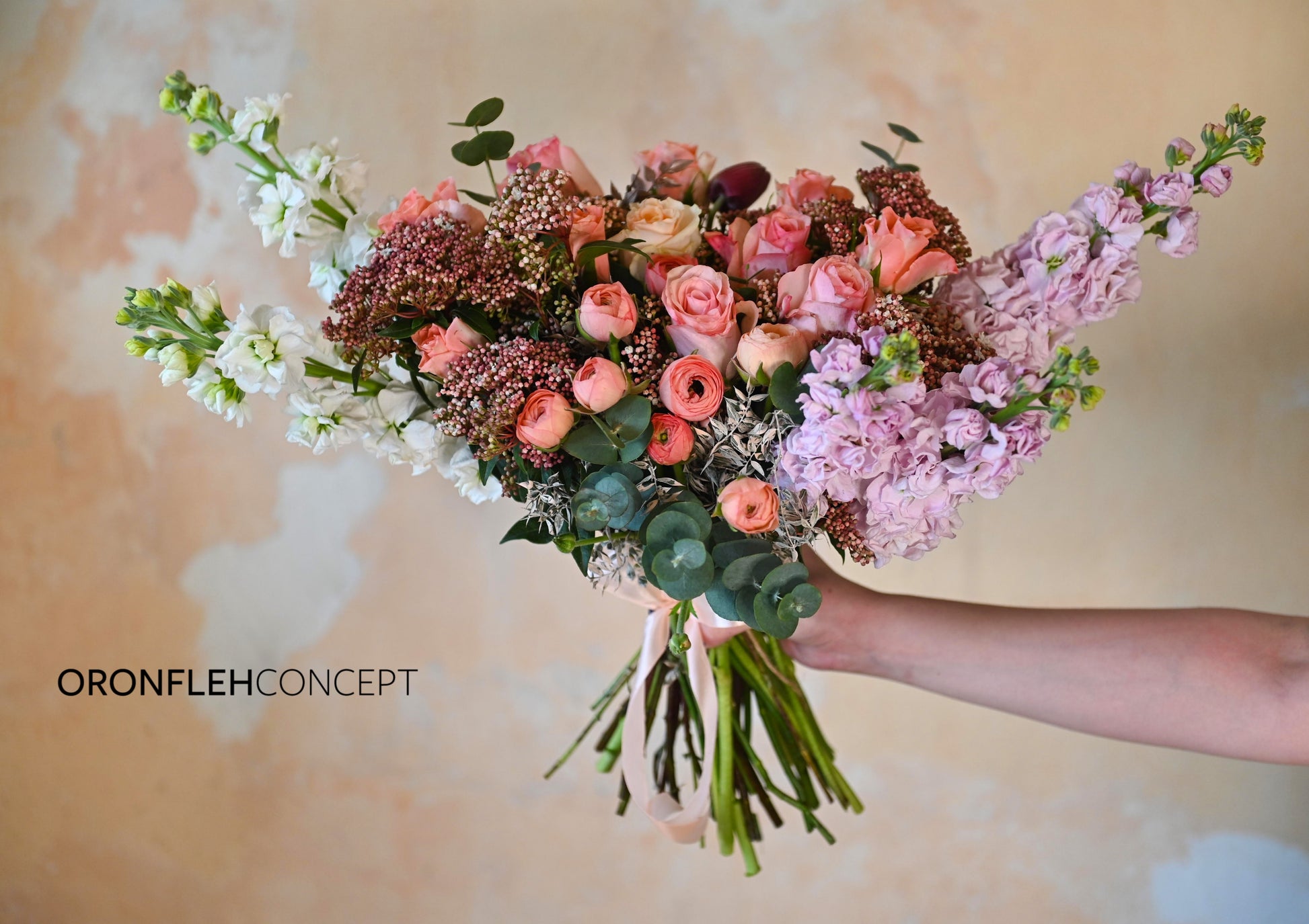 Our special bouquet consisting of Pink Roses, peach & pink Renunculus, Viburnum, eucalyptus & Wallflower .