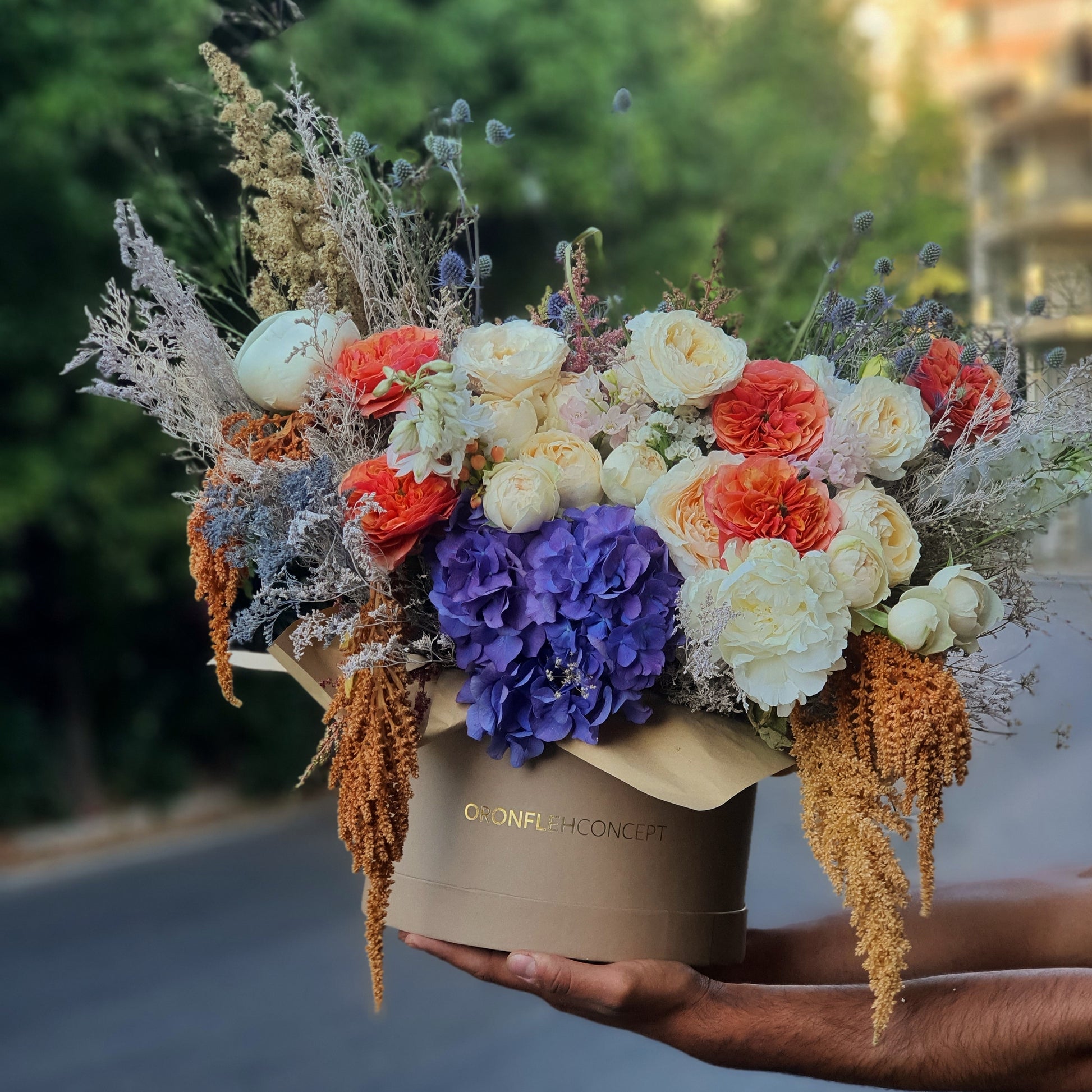 Colorful Flower Arrangement in our Oronfleh Concept box consisting of Roses, Hydrangea, English Roses, Peonies, Limonium & Eucalyptus.