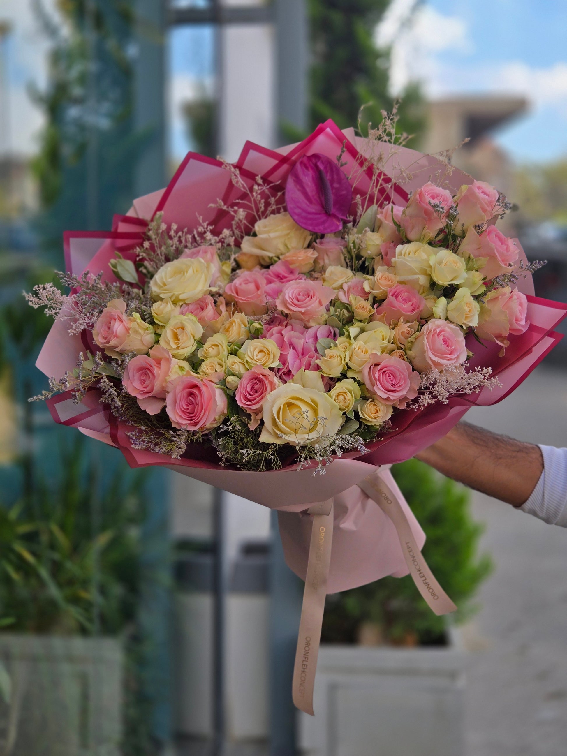 A charming bouquet of soft pink and creamy yellow roses, elegantly wrapped in rich shades of burgundy and blush. This romantic arrangement is perfect for celebrating love, joy, and unforgettable moments.