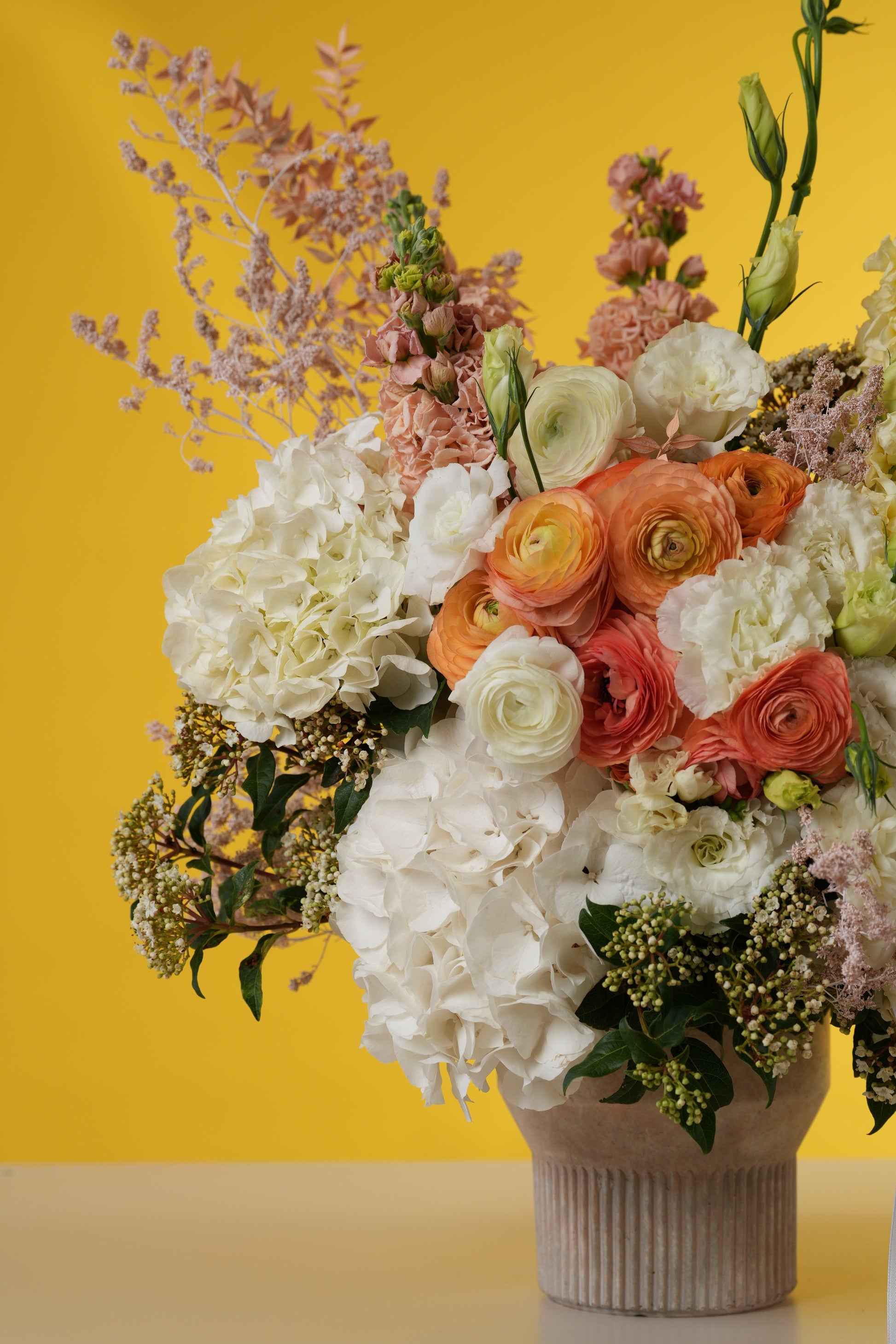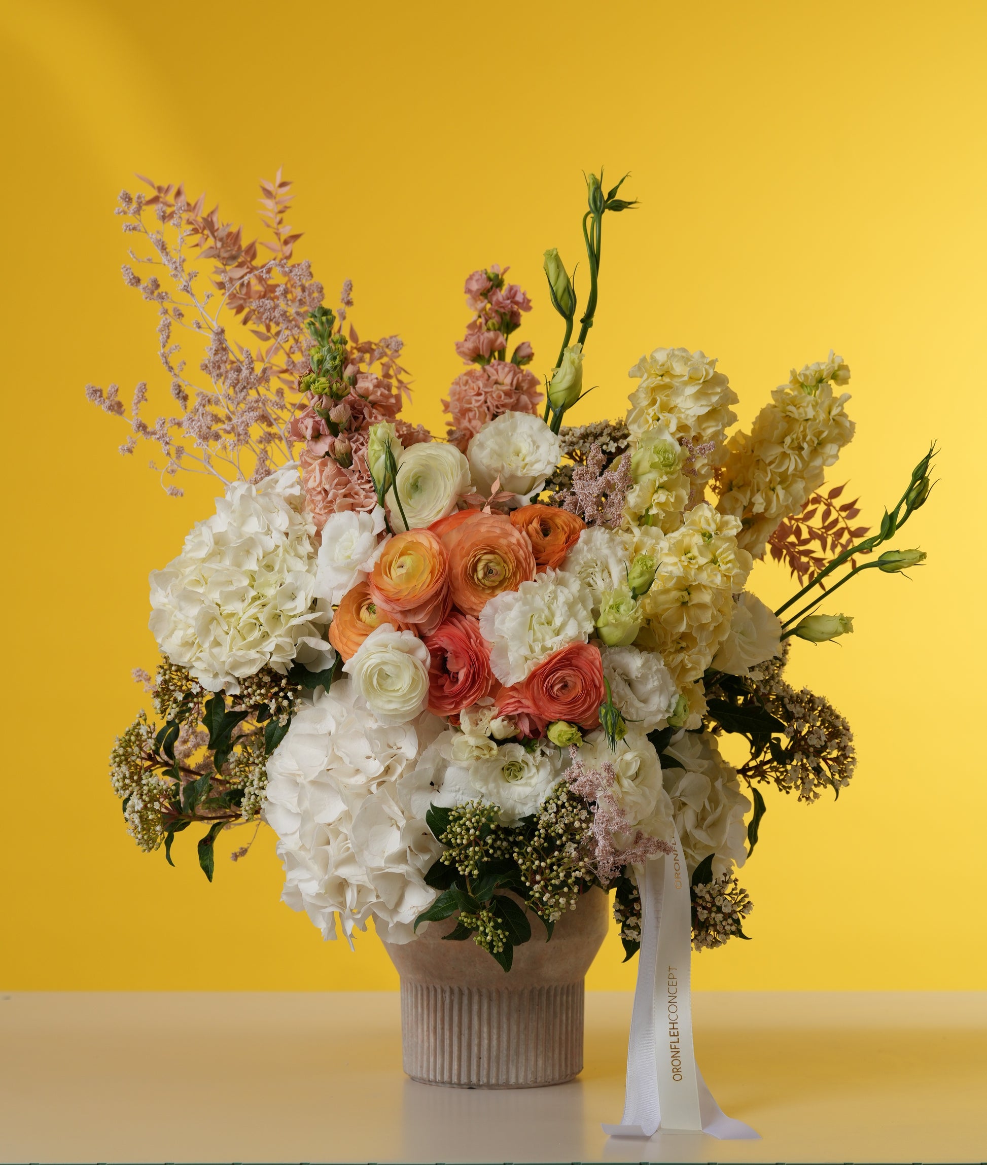 Designed for the mom who loves high-impact floral art, this piece is elevated by vertical stalks of peach stock and whimsical, airy fillers that create a sense of movement and height. It is anchored in a sophisticated, ribbed stone-ceramic pedestal vase and finished with a long, flowing white satin ribbon for a final touch of pure luxury.