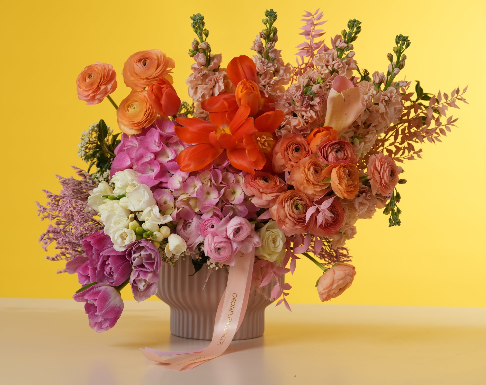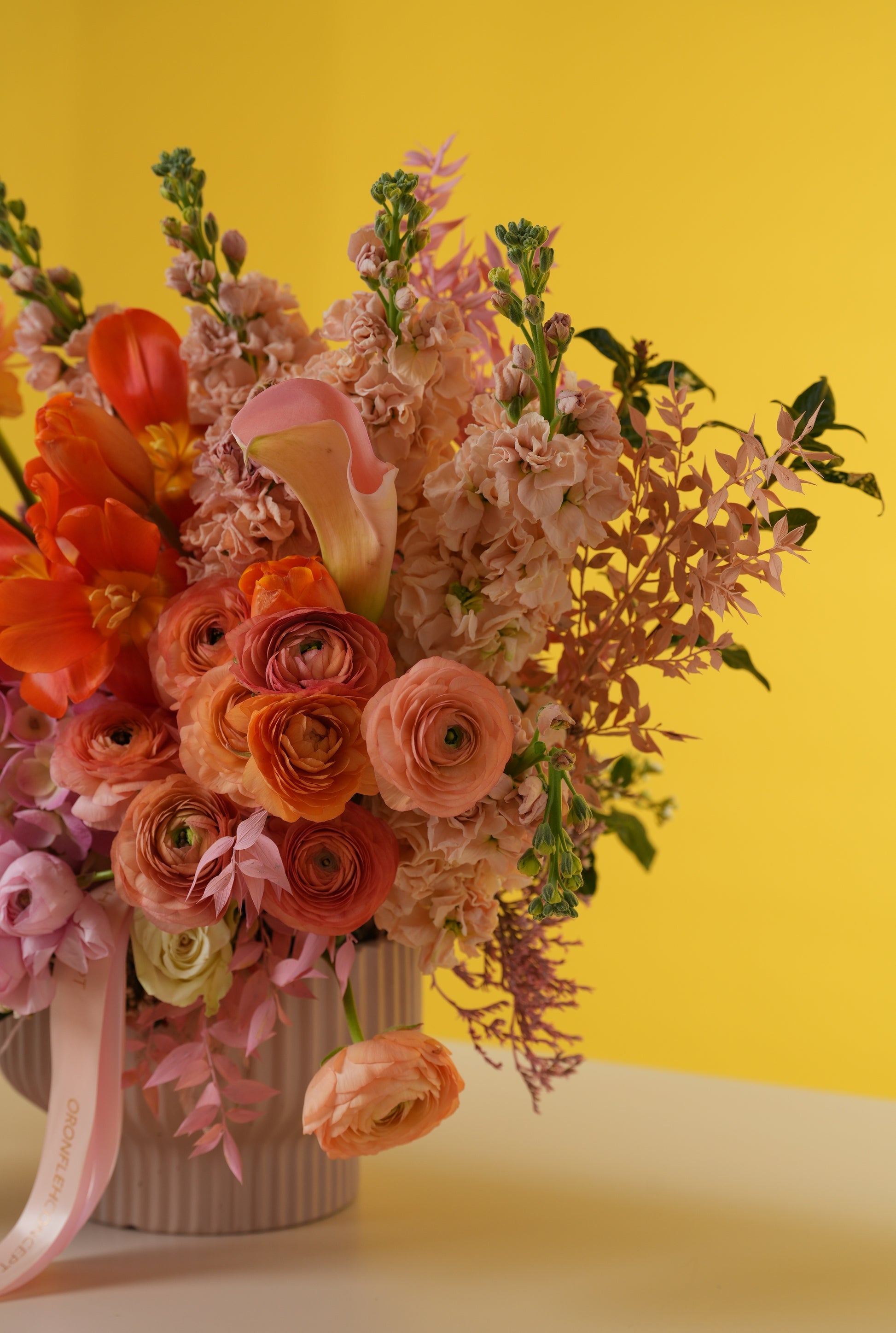 Set in a modern, ribbed ceramic pedestal vase in a soft neutral tone, this "Sunset Symphony" offers a rich variety of textures and heights that create a true 360-degree floral experience. Finished with a signature flowing blush ribbon, it is a high-impact gift designed to be the centerpiece of her celebrations.