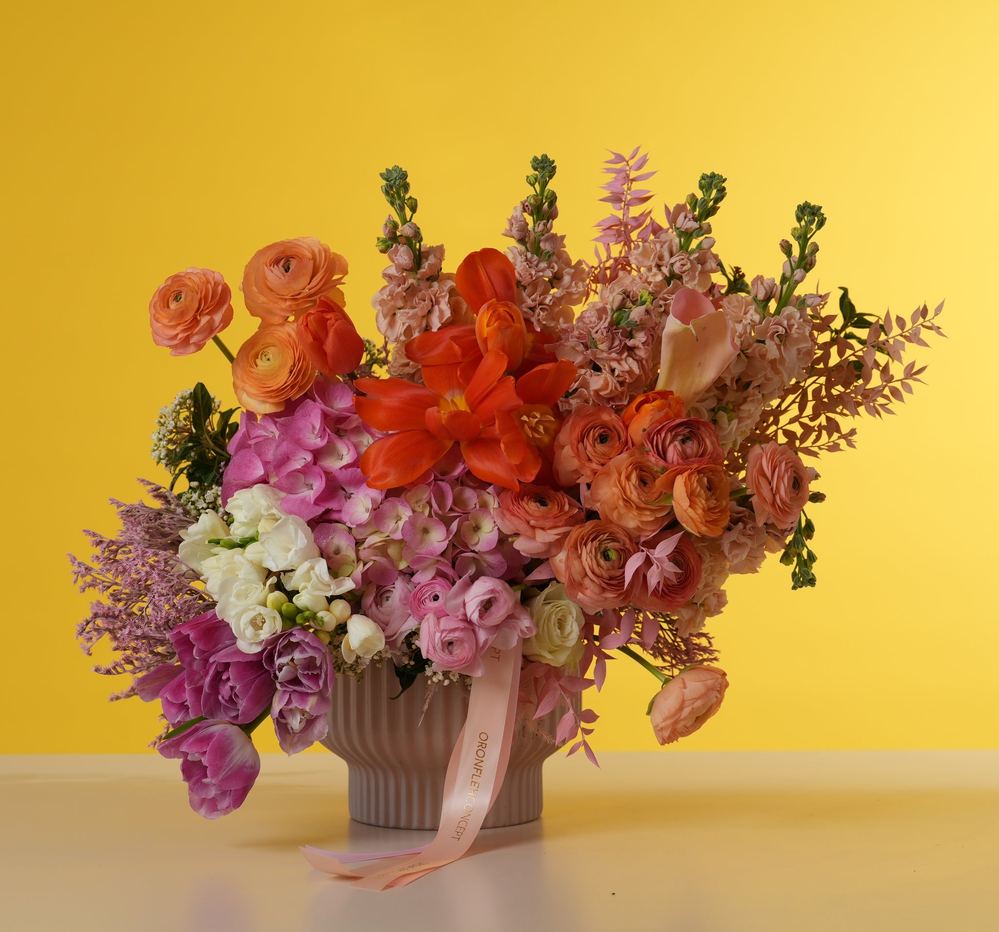 Breathtaking and abundant, this arrangement is a vivid tribute to the strength and beauty of motherhood. A stunning focal point of fiery orange tulips and honey-hued ranunculus is framed by a lush tapestry of pink hydrangeas, lavender stocks, and delicate pastel blooms.