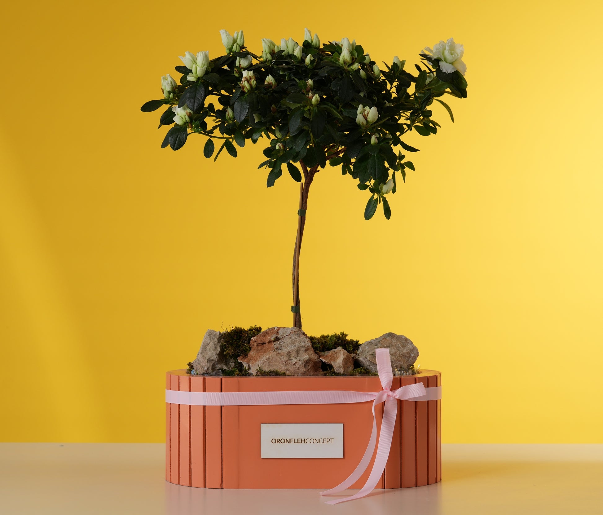 Artfully presented in a unique, ribbed terracotta-toned planter, the base is landscaped with natural stone and moss for a serene, mini-garden aesthetic. Finished with a soft pink satin bow, it’s a timeless and thoughtful gift for the mom who finds joy in watching things grow.