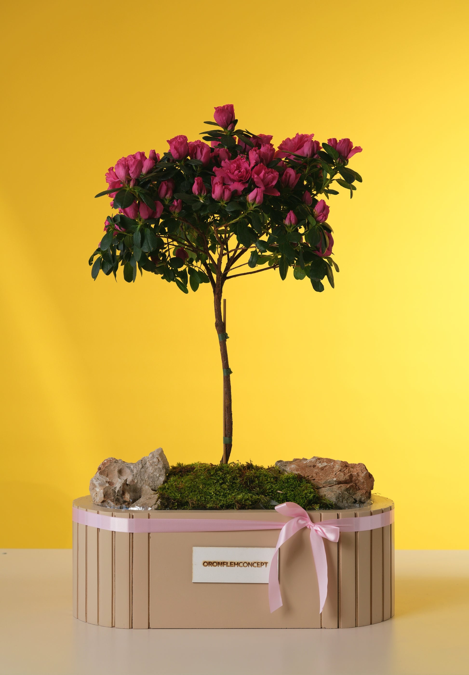 The arrangement is masterfully landscaped in a designer ribbed beige planter, accented with natural rocks and preserved moss for a serene, Zen-garden aesthetic. Finished with a delicate pink satin bow, it is a lasting tribute to her beauty that will continue to bloom long after the celebrations are over.