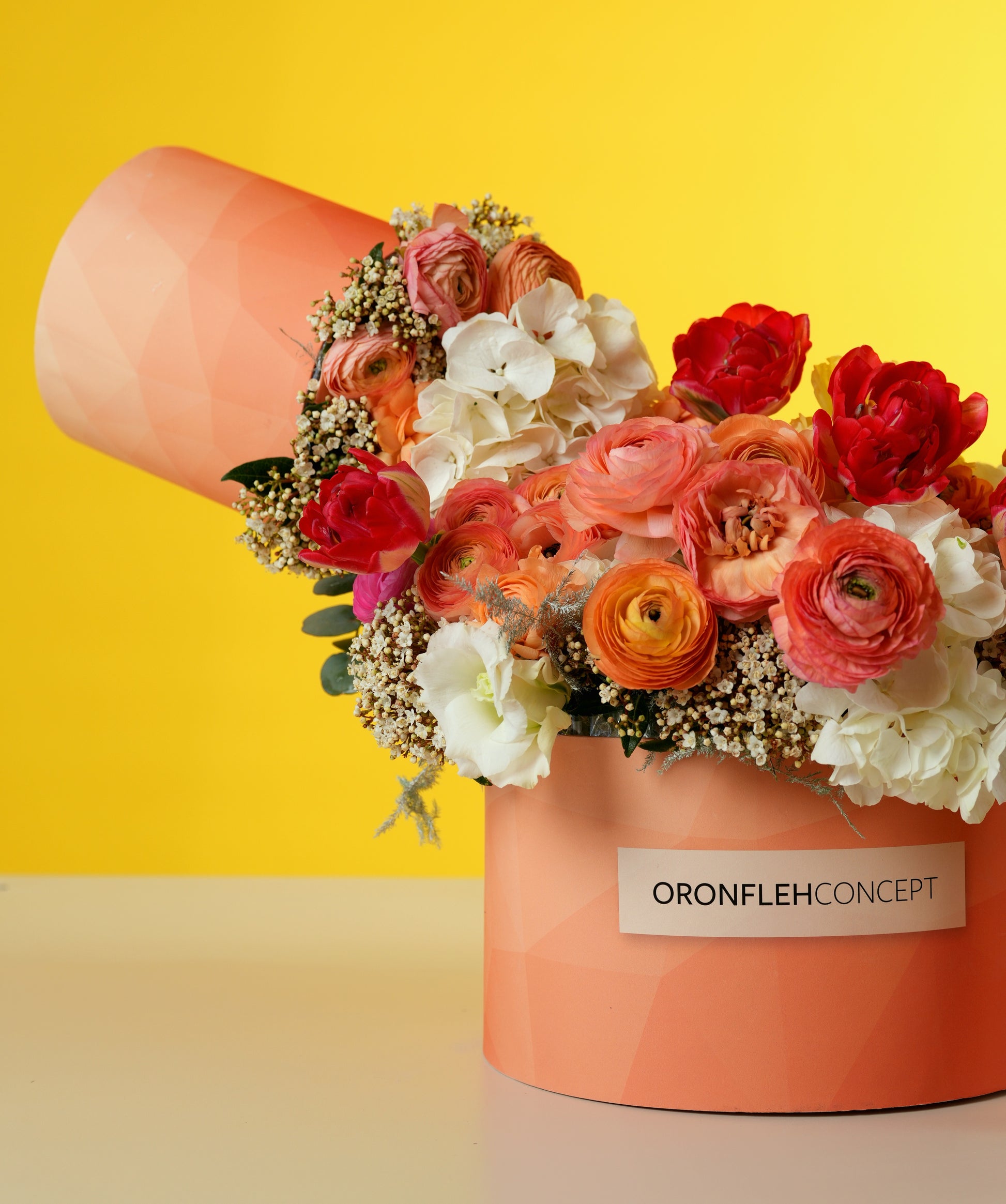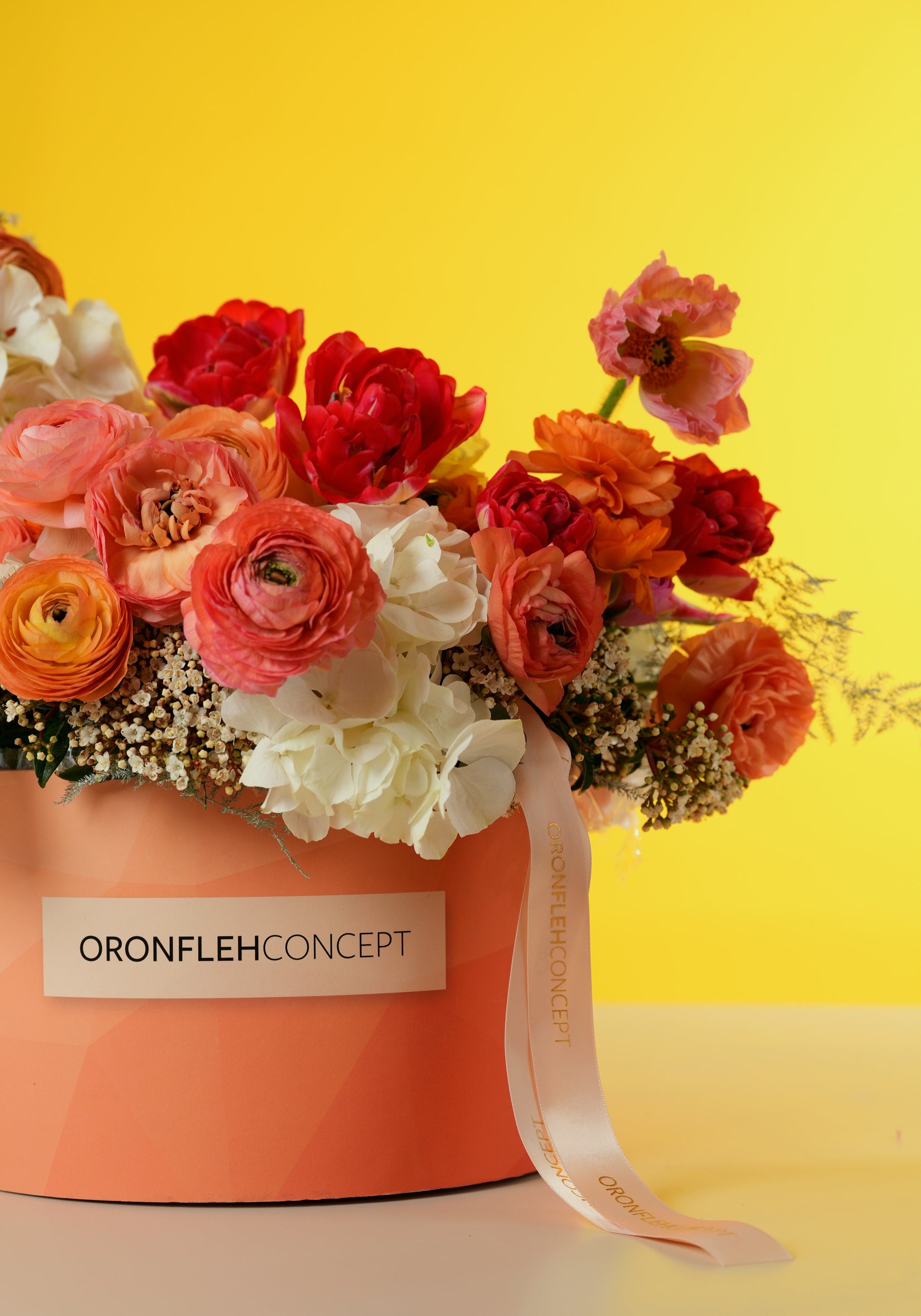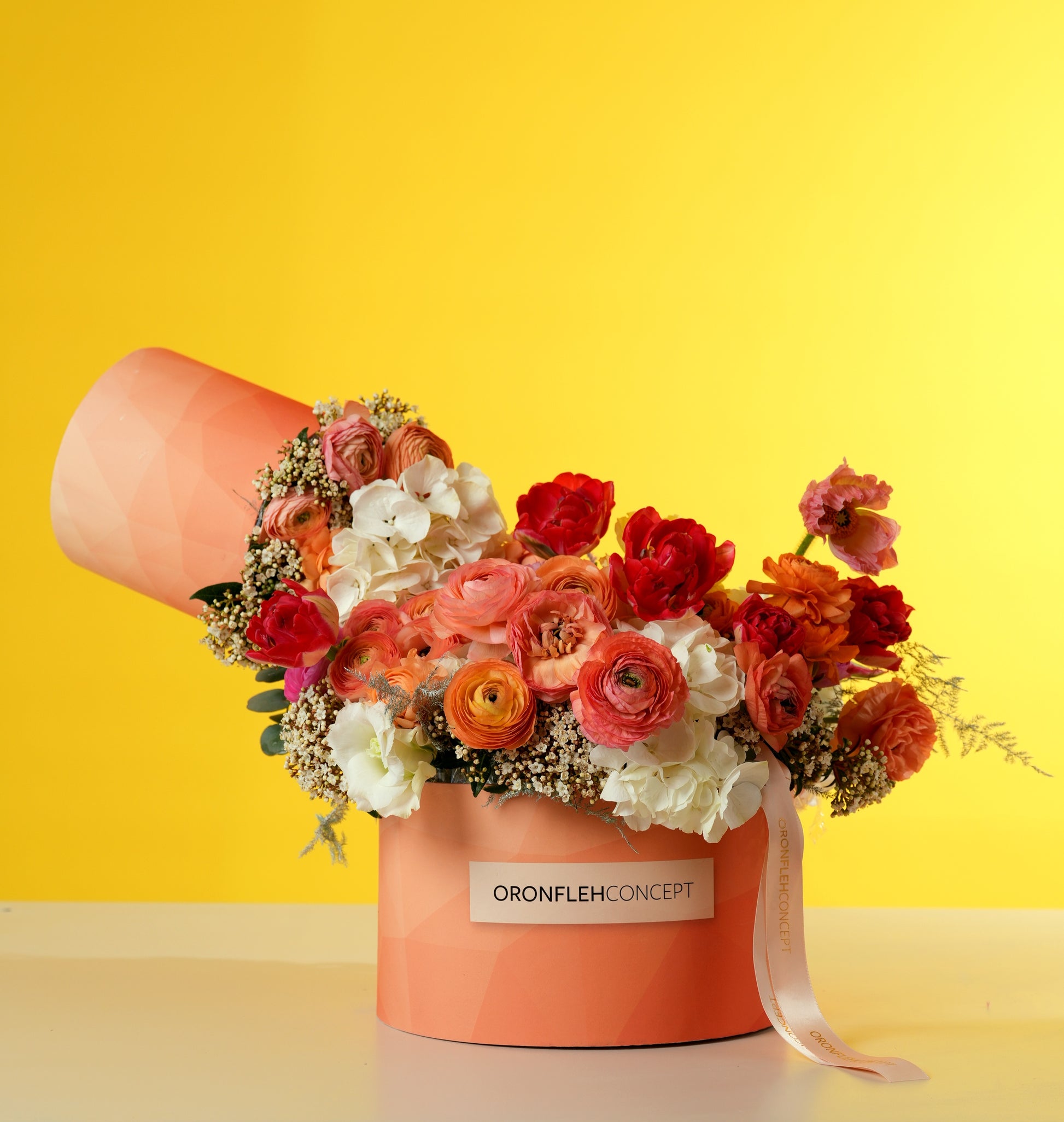 Gift her a burst of sunshine and warmth with this modern, chic floral box. Bursting with vibrant ranunculus, romantic coral roses, and fluffy white hydrangeas, this arrangement is designed to feel like a blooming spring garden tucked inside a luxury keepsake.