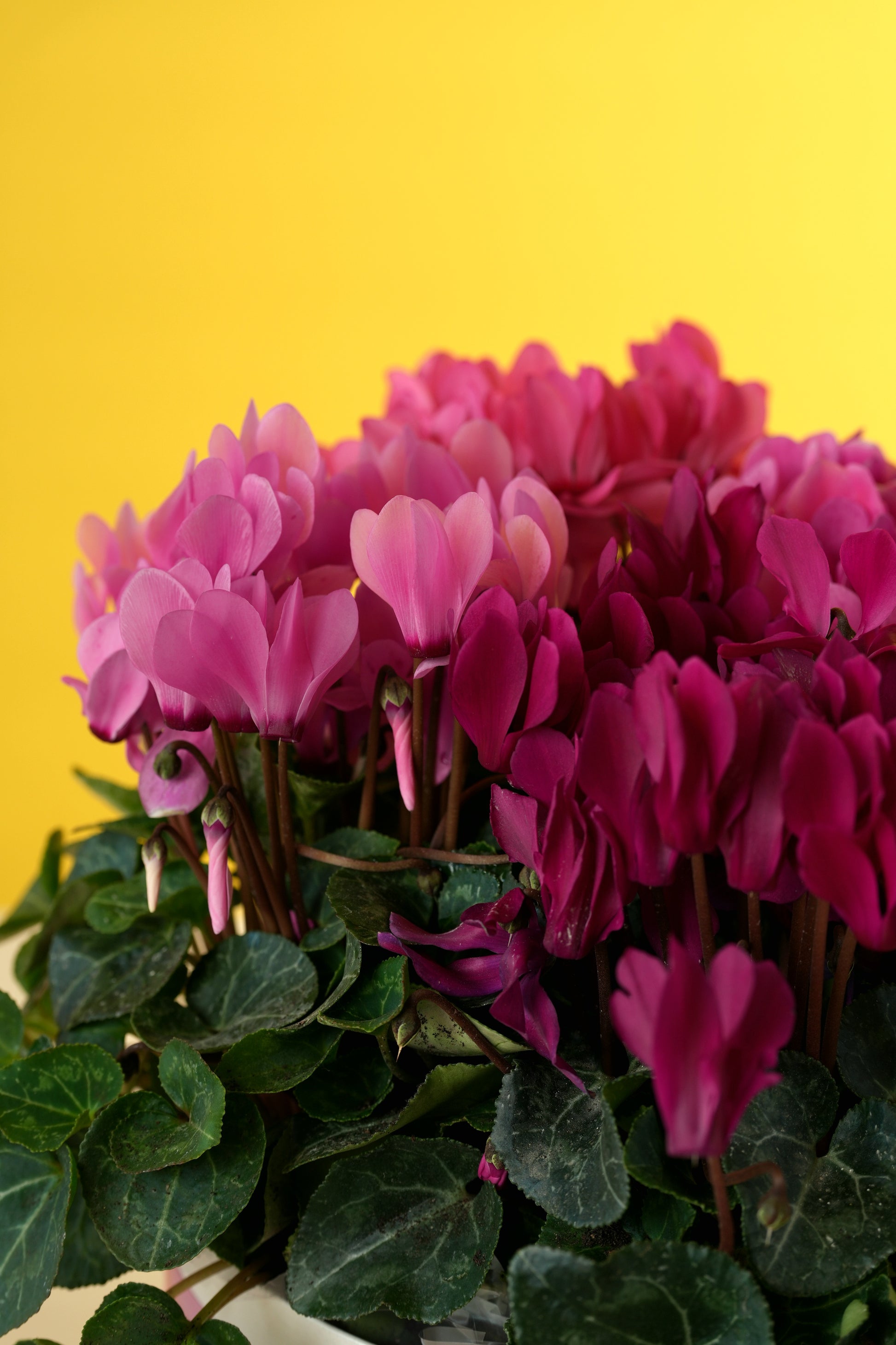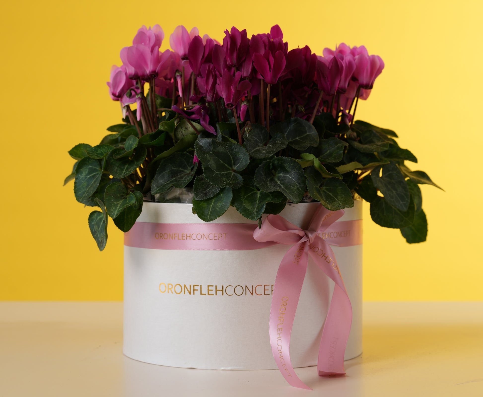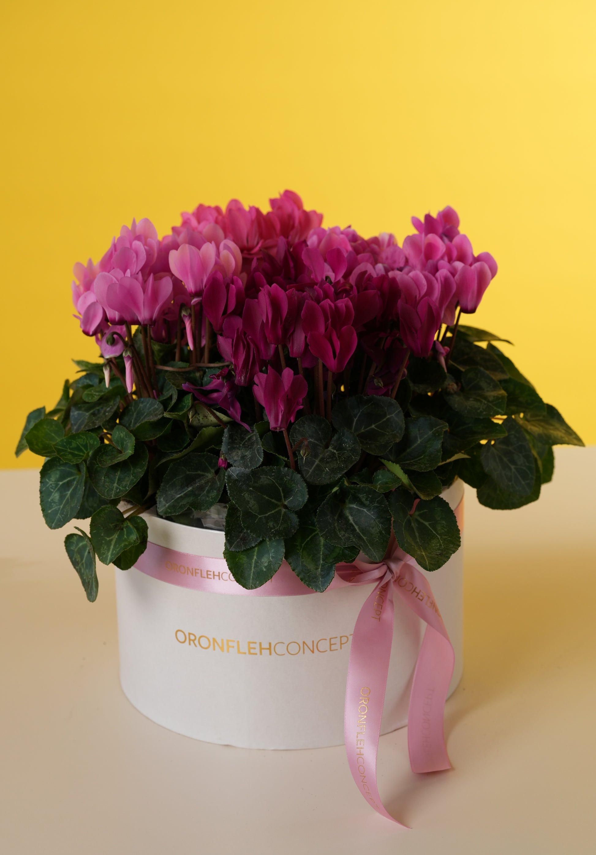 This lush arrangement features vibrant, magenta-toned Cyclamen, known for their unique butterfly-like petals and heart-shaped silver-marbled foliage. Nestled in a signature white hat-box and tied with a delicate satin ribbon, this living gift offers a continuous display of color that stays fresh and beautiful much longer.