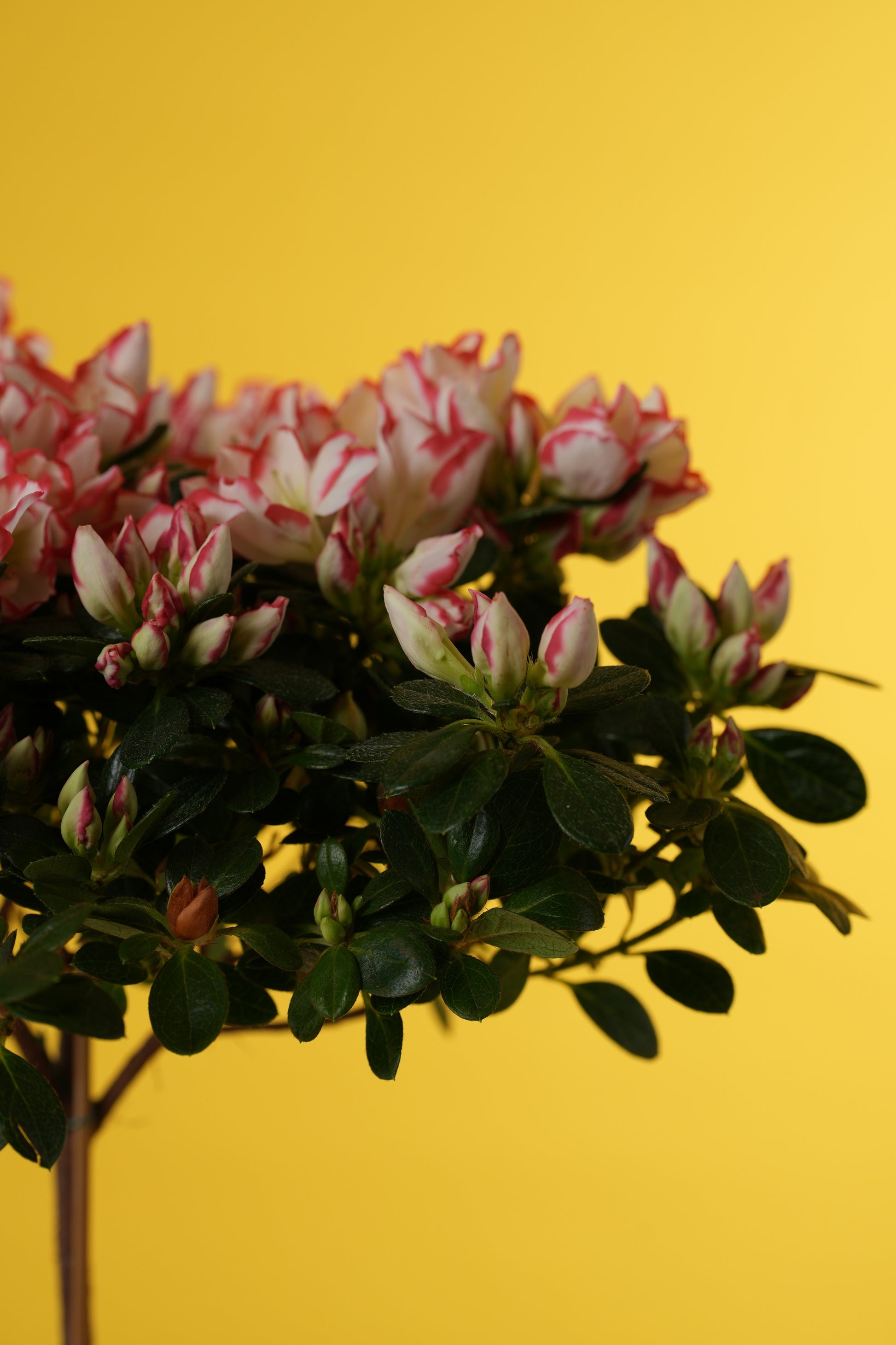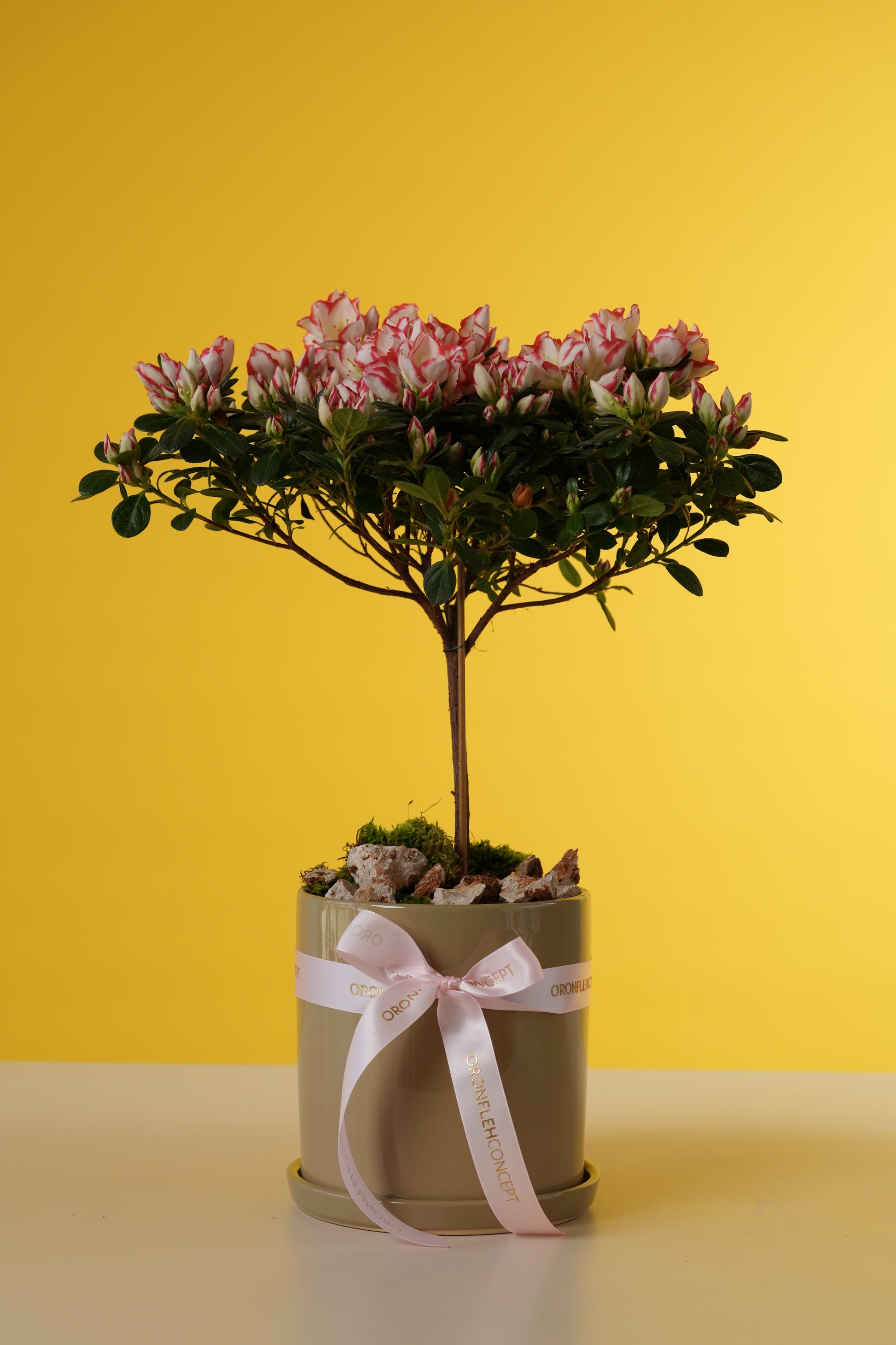 A delicate bloom tree adorned with soft white petals kissed with blush pink edges, gracefully rising above lush greenery. Set in a sleek modern pot and finished with an elegant ribbon, this piece brings a sense of serenity, charm, and refined natural beauty to any space.