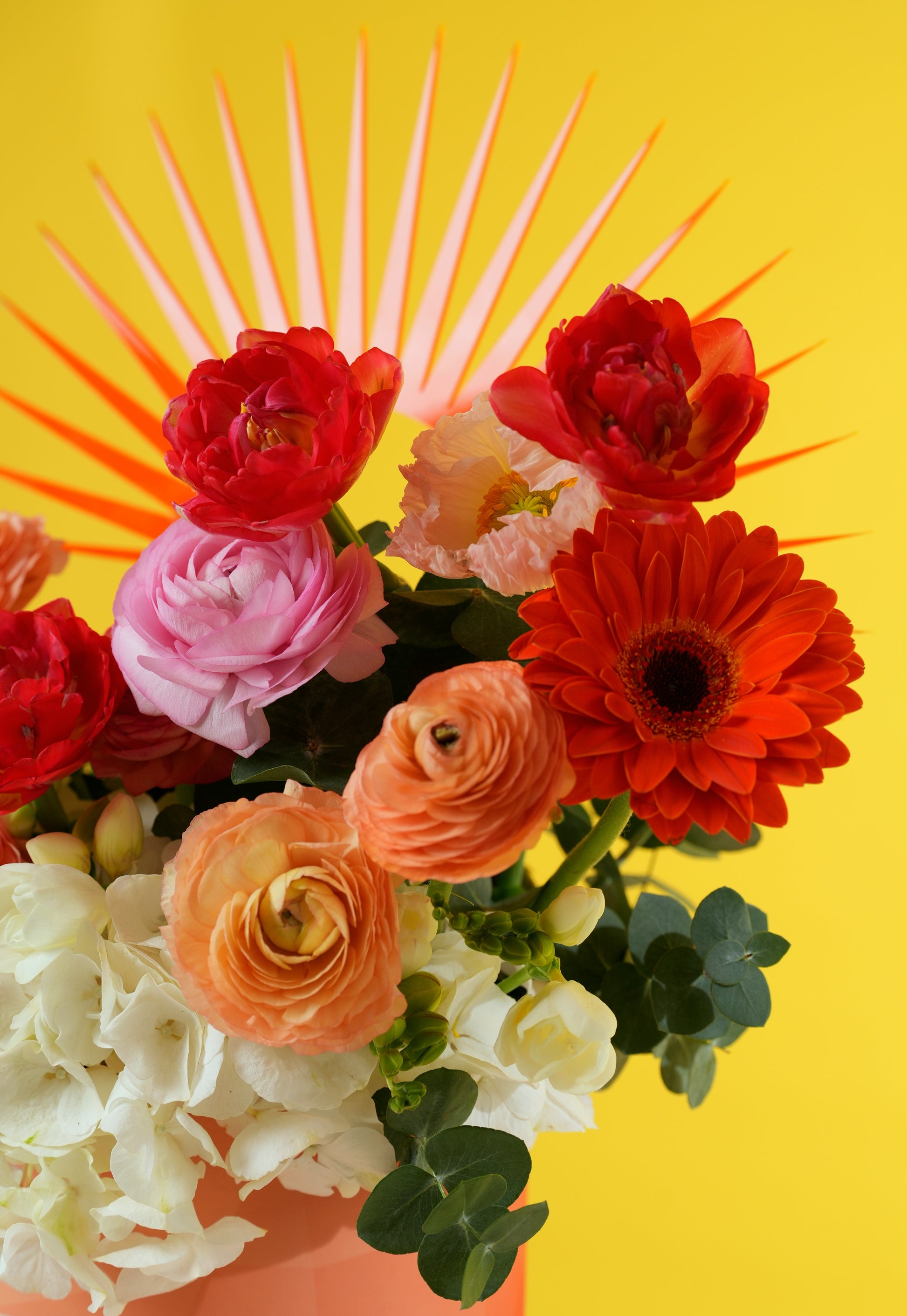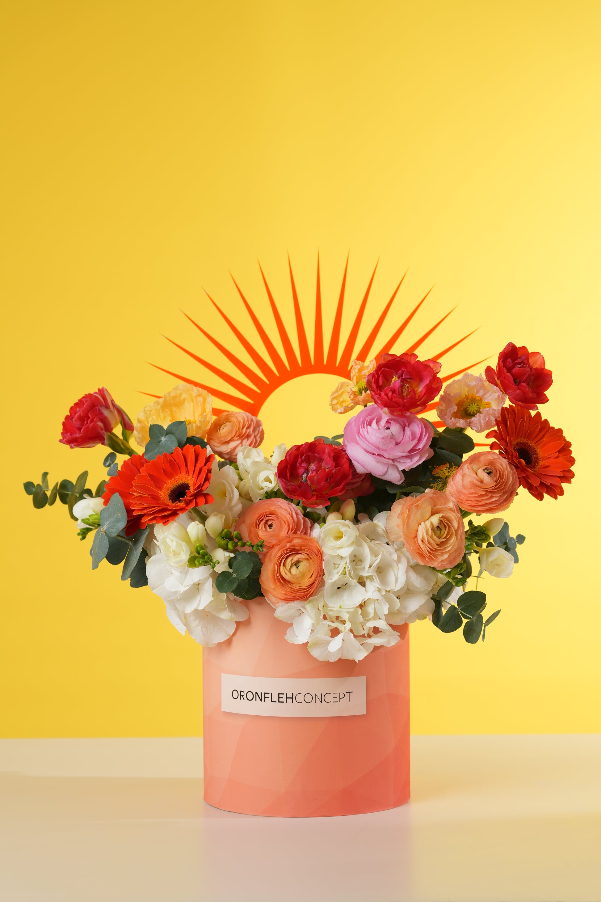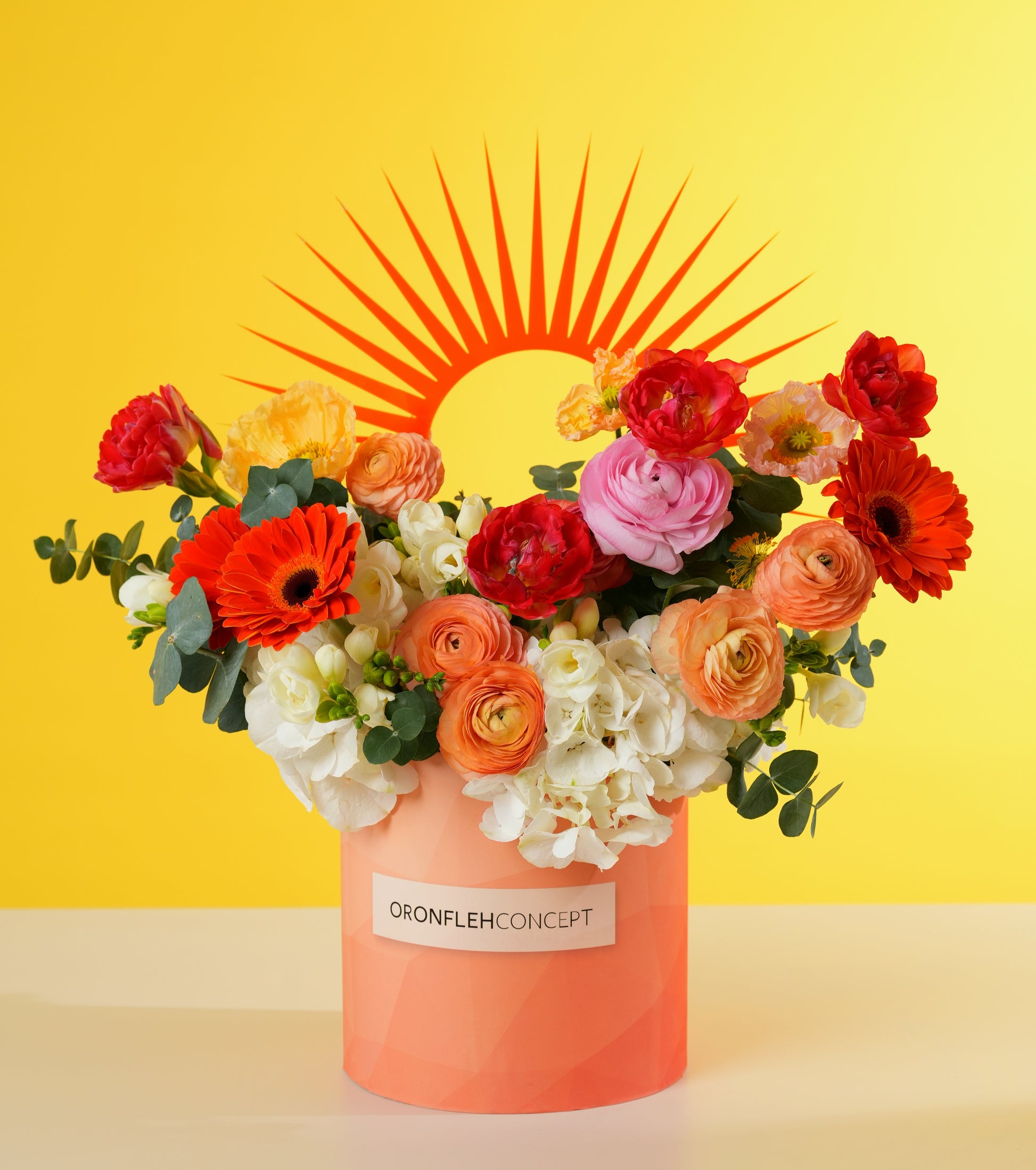 A rich tapestry of fiery orange gerberas, deep red tulips, and layered ranunculus in shades of peach and pink is softened by a base of crisp white hydrangeas and fresh eucalyptus. Housed in a signature geometric peach box, it’s a modern masterpiece that commands attention.