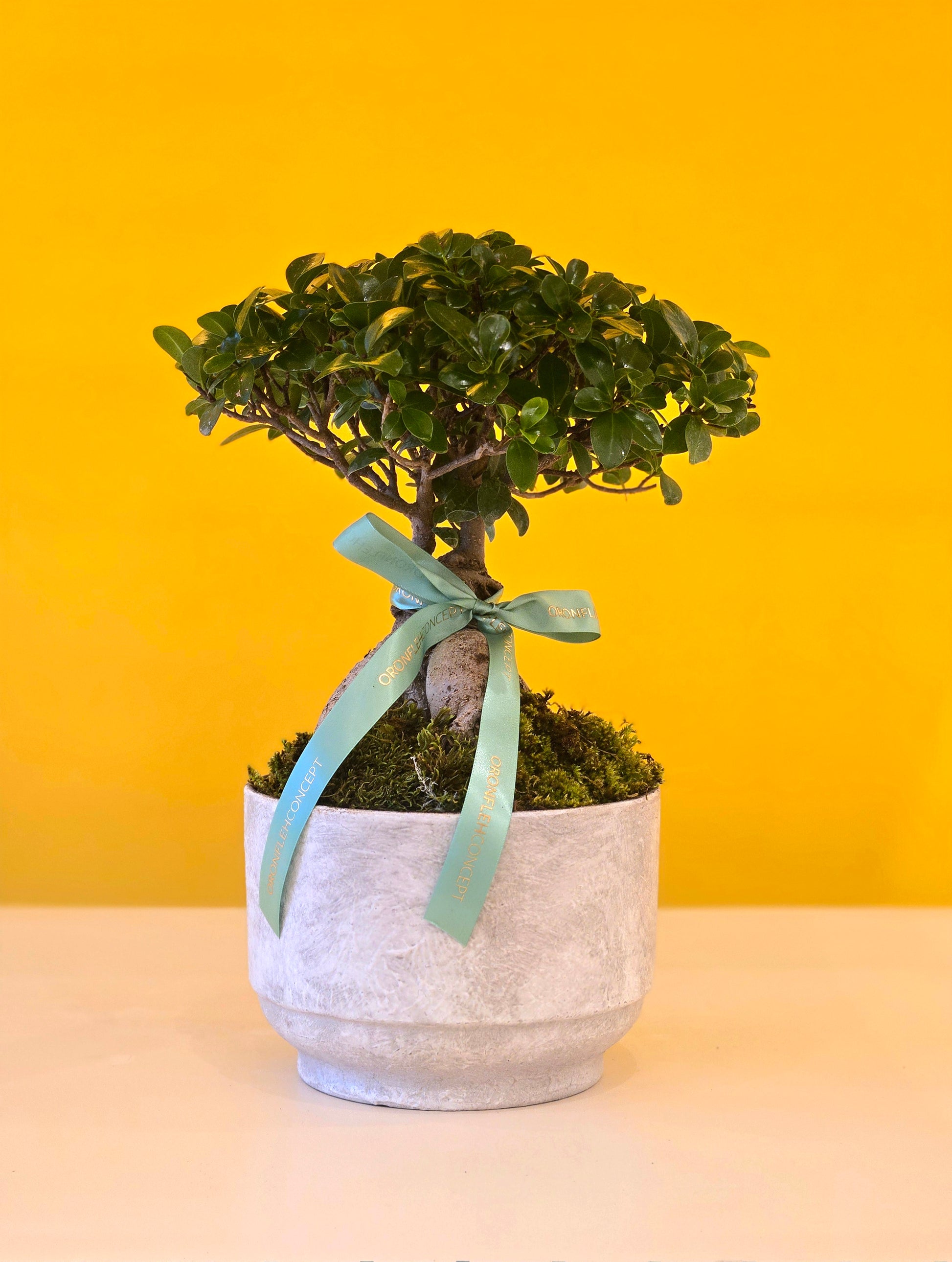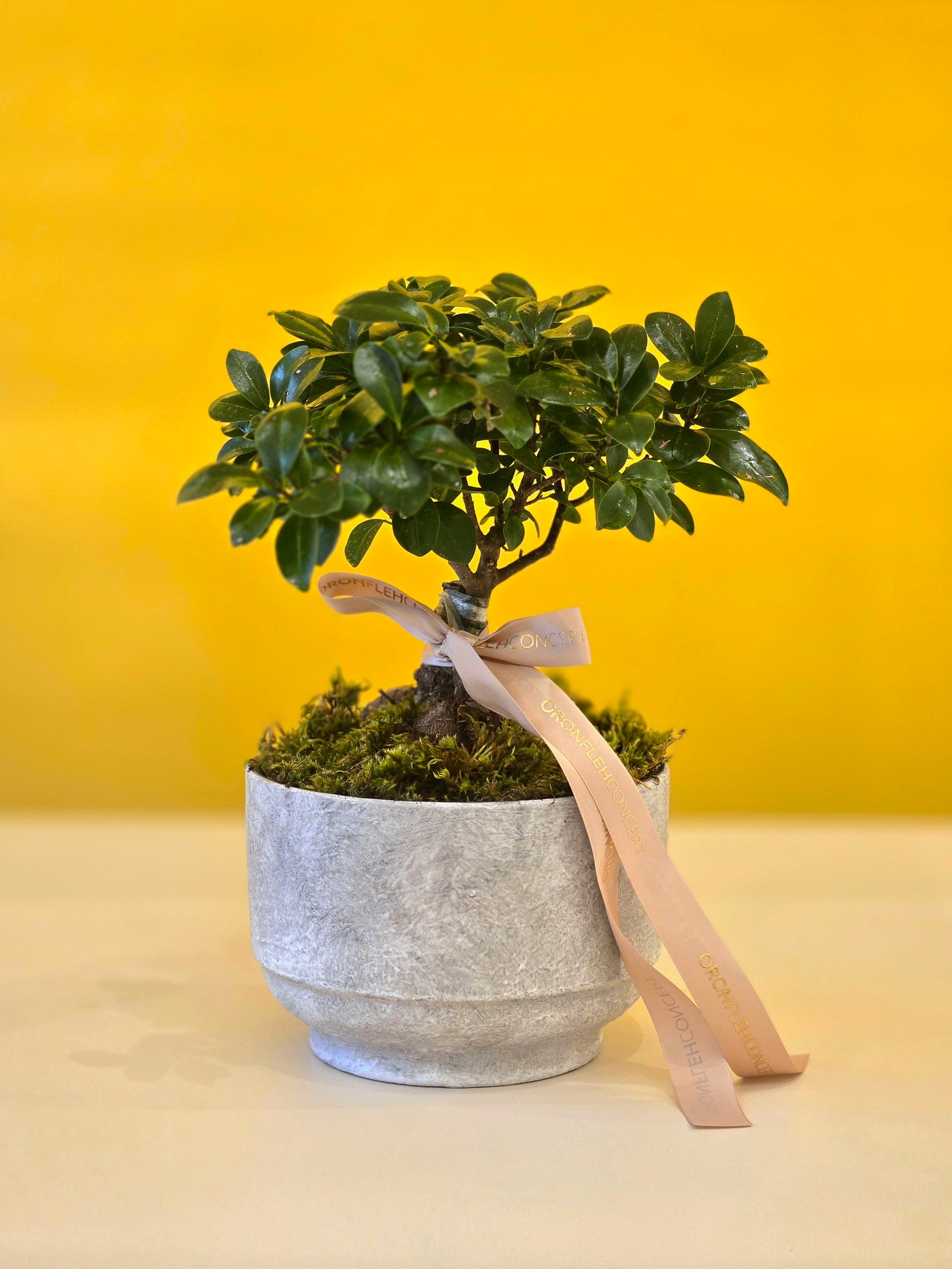 A beautifully sculpted bonsai tree, symbolizing harmony, balance, and timeless elegance. Set in a minimalist stone pot and finished with a soft ribbon detail, this living piece brings a serene and refined touch to any space—perfect for meaningful gifting or peaceful décor.