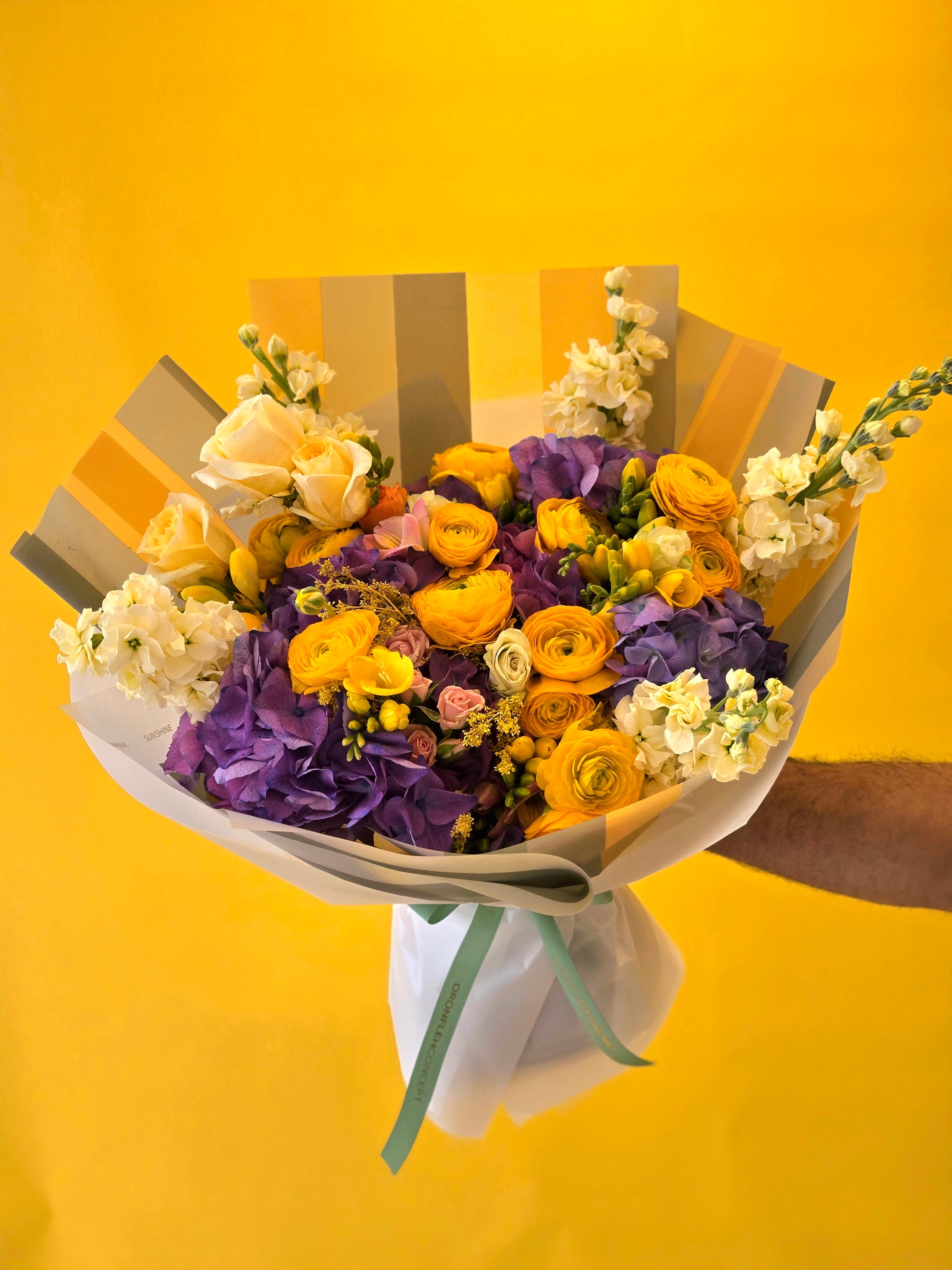 A bold and captivating bouquet where rich purples meet vibrant golden yellows, creating a striking contrast full of life and elegance. Designed with layered textures and fresh seasonal blooms, this arrangement radiates confidence, charm, and joyful sophistication—perfect for making a lasting impression.
