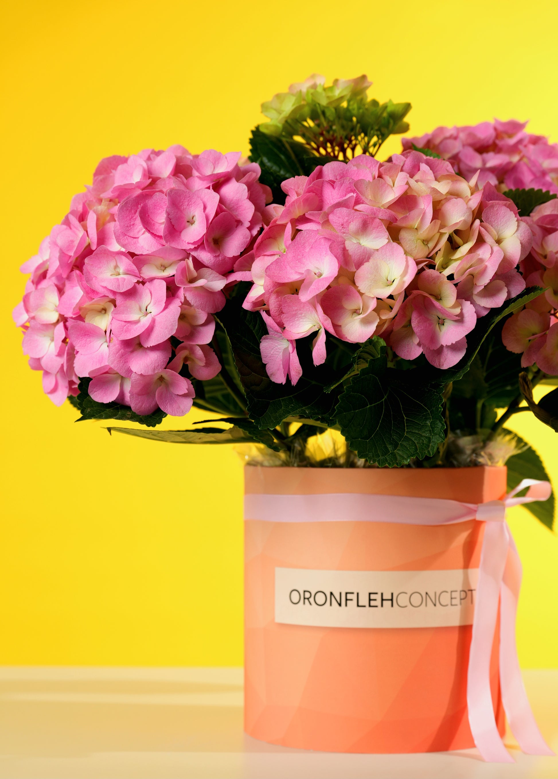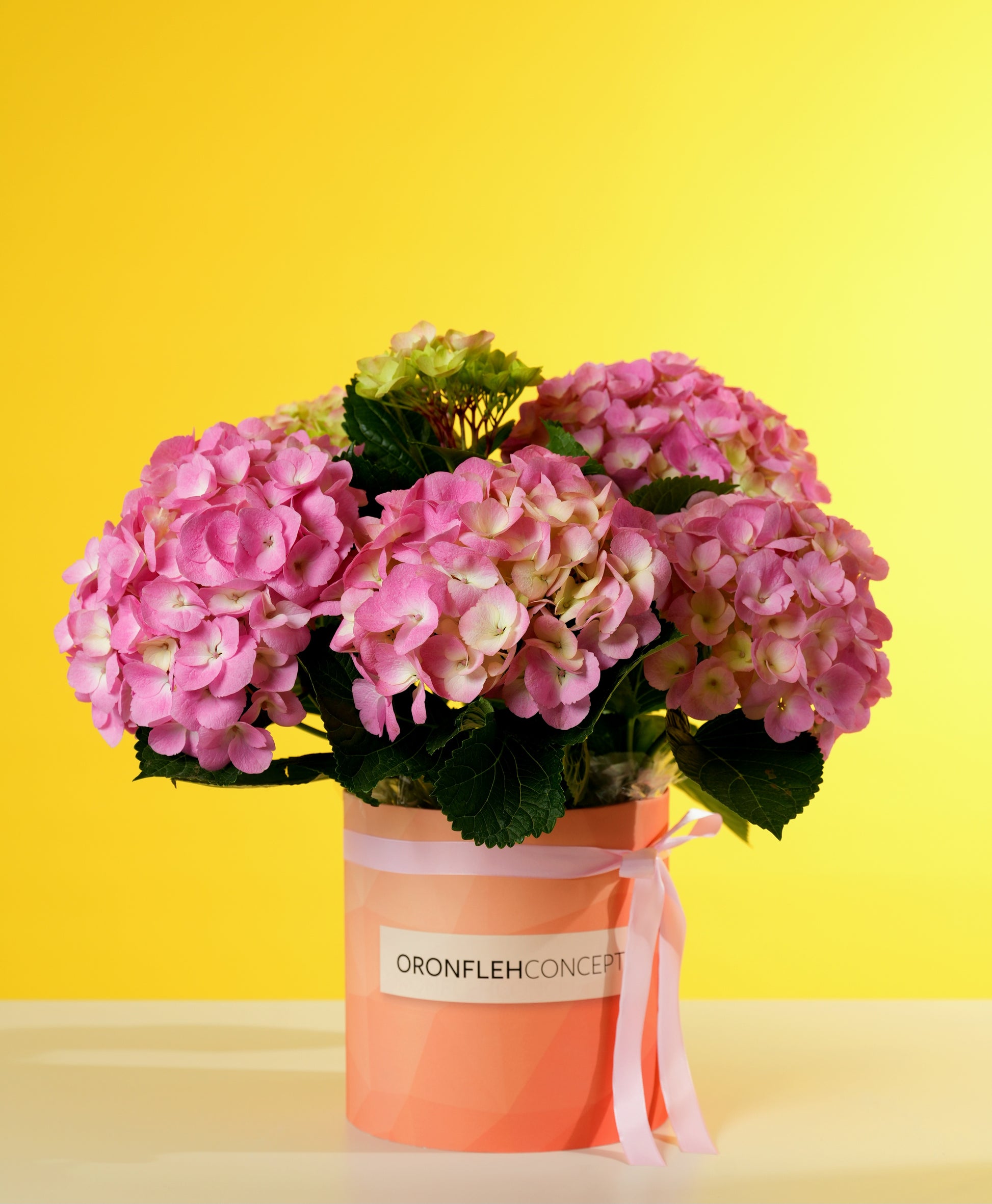 Give her the gift of timeless charm with this classic, voluminous display of premium hydrangeas. This arrangement is a celebration of soft textures and delicate colors, featuring luscious pink mophead hydrangeas with hints of cream and lime-green centers, complemented by their own deep, glossy foliage.