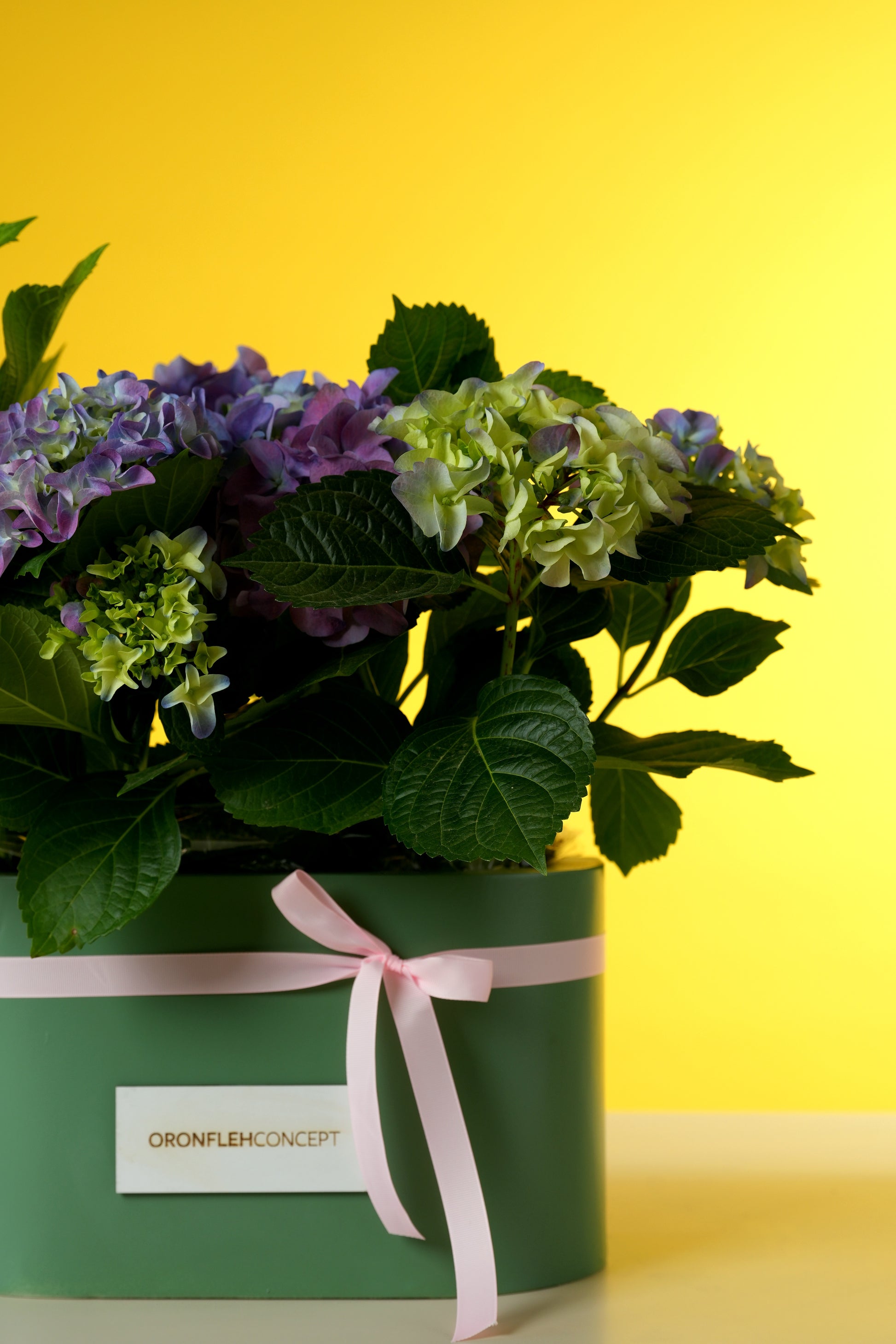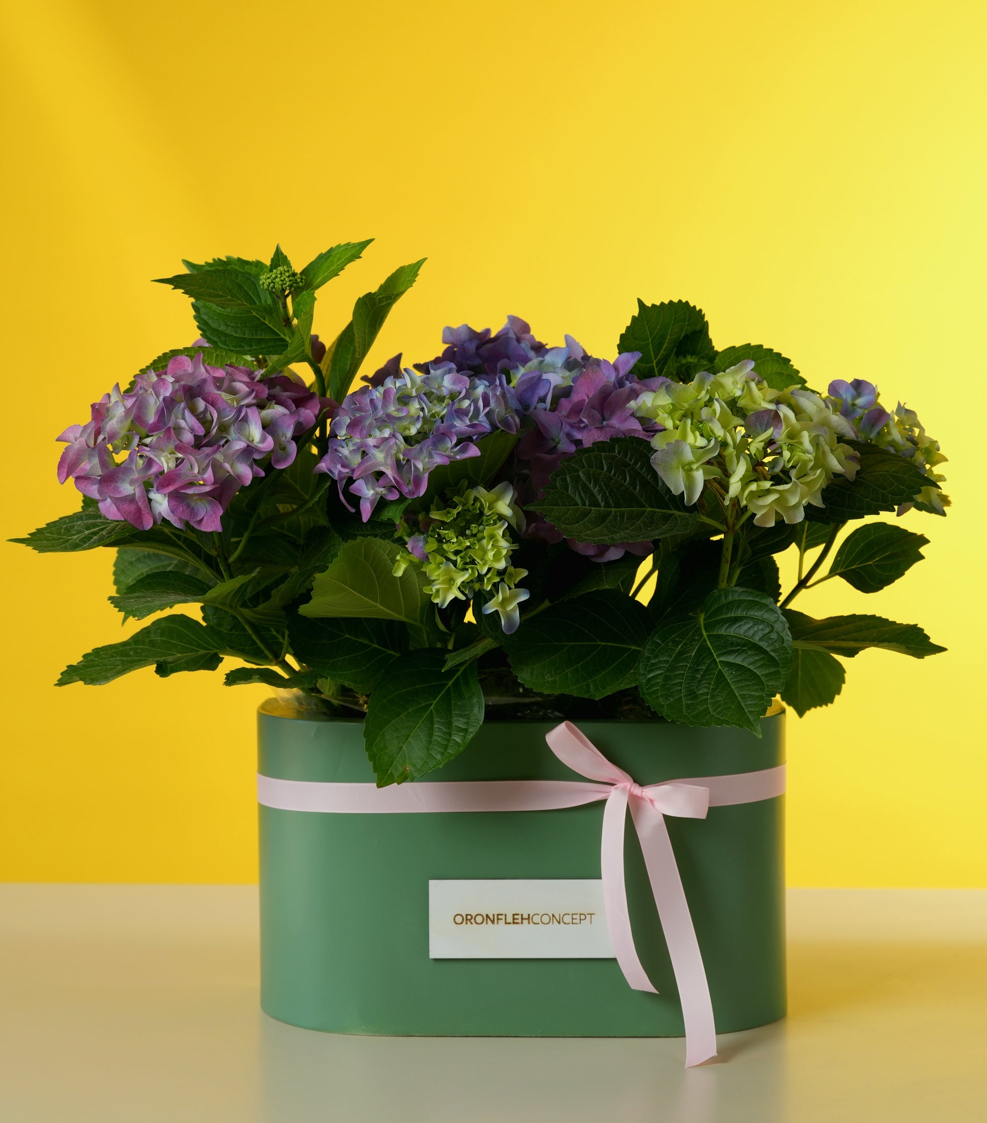 Offer her a refreshing take on traditional florals with this lush, garden-inspired hydrangea display. This arrangement features premium mophead hydrangeas in a sophisticated ombre of cool purples, soft lilacs, and fresh lime-greens, creating a serene and natural aesthetic.