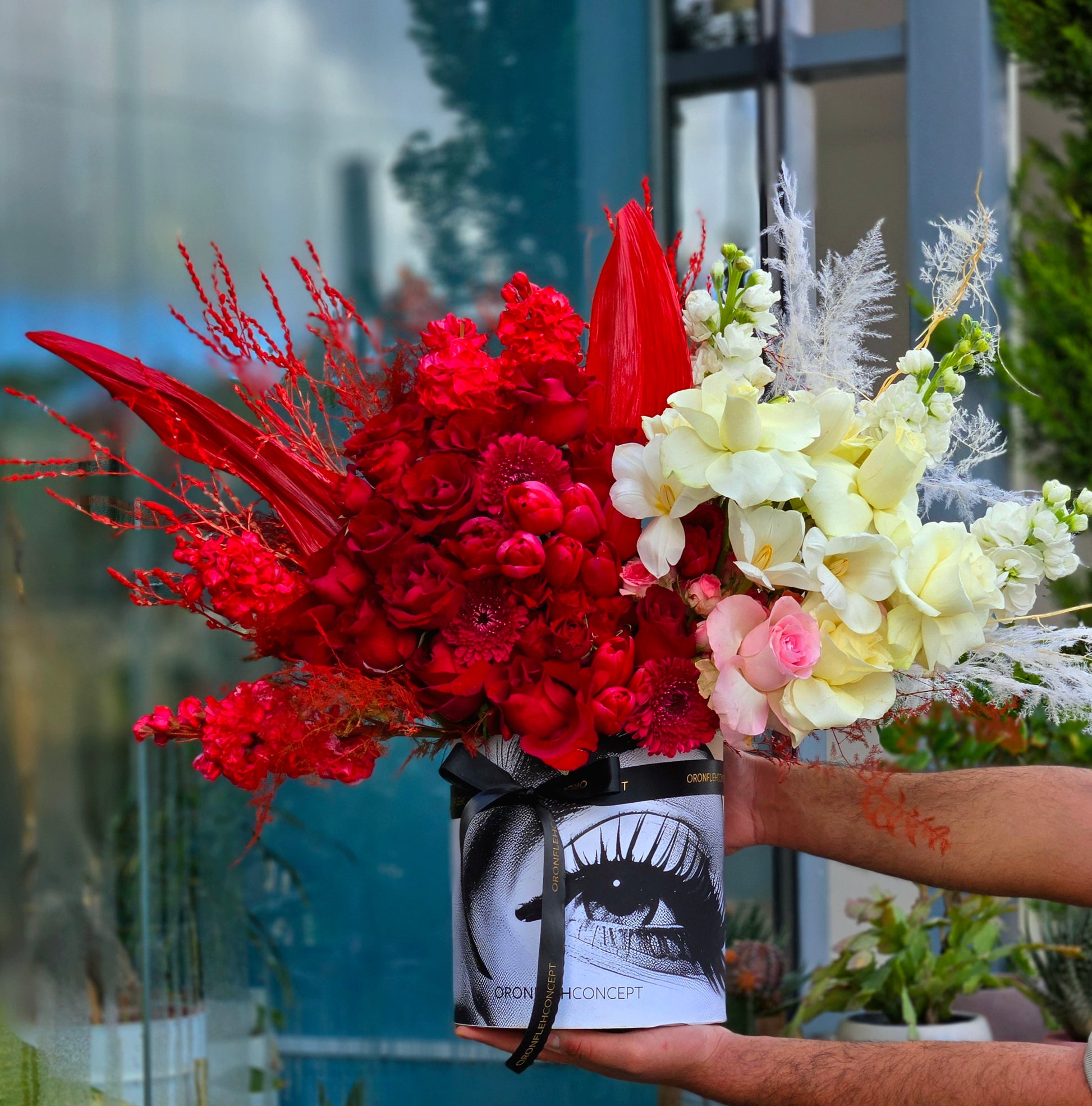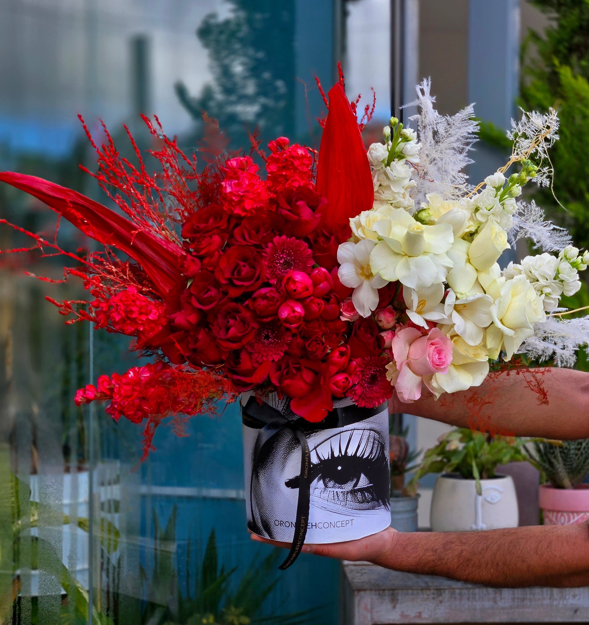 A bold harmony of deep crimson blooms and delicate ivory florals, sculpted with artistic textures to create a striking expression of passion and elegance.