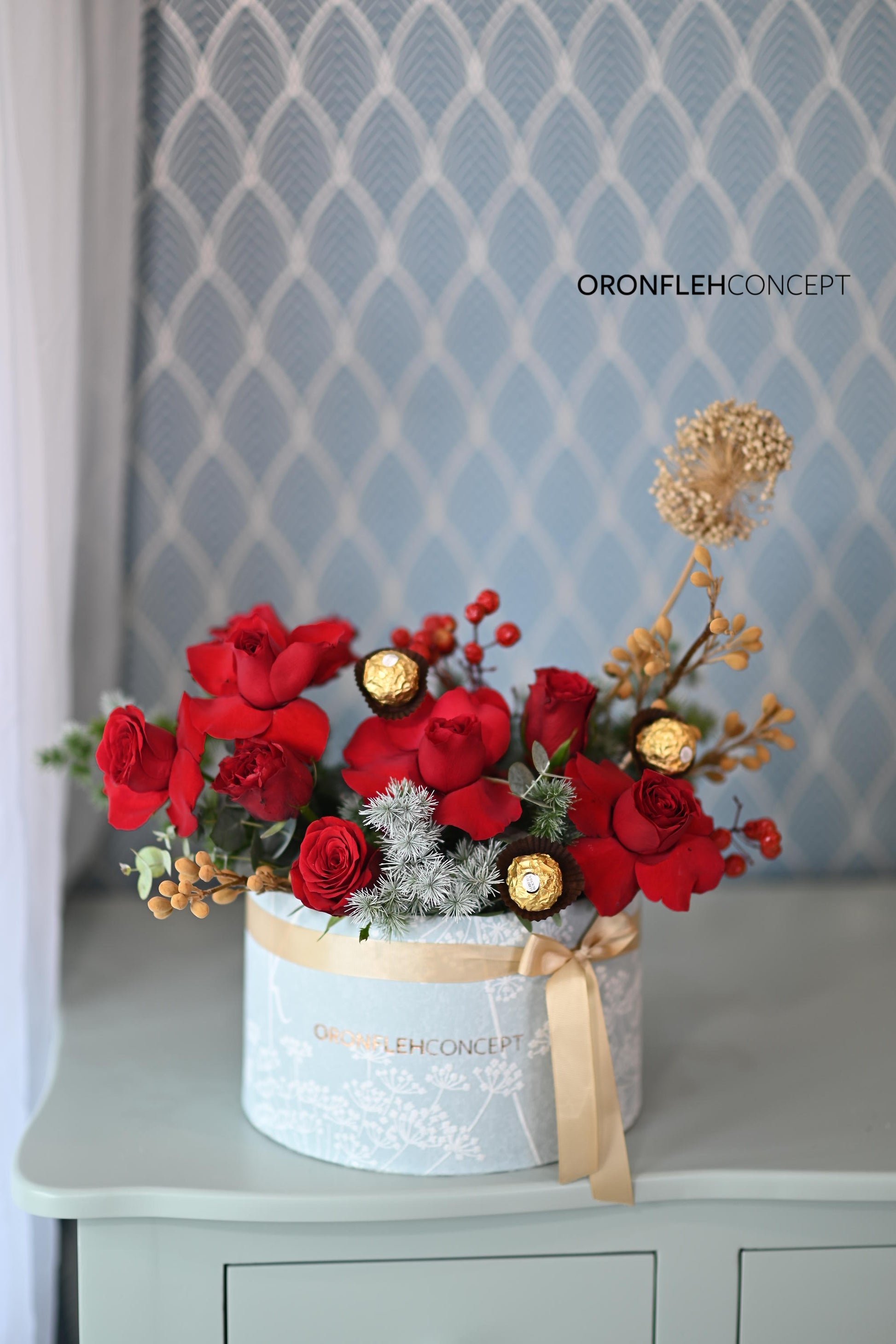 Special VALENTINE'S Oronfleh Concept box consisting of Red Roses, Greenery, Dried Flowers & Ferrero Chocolate.