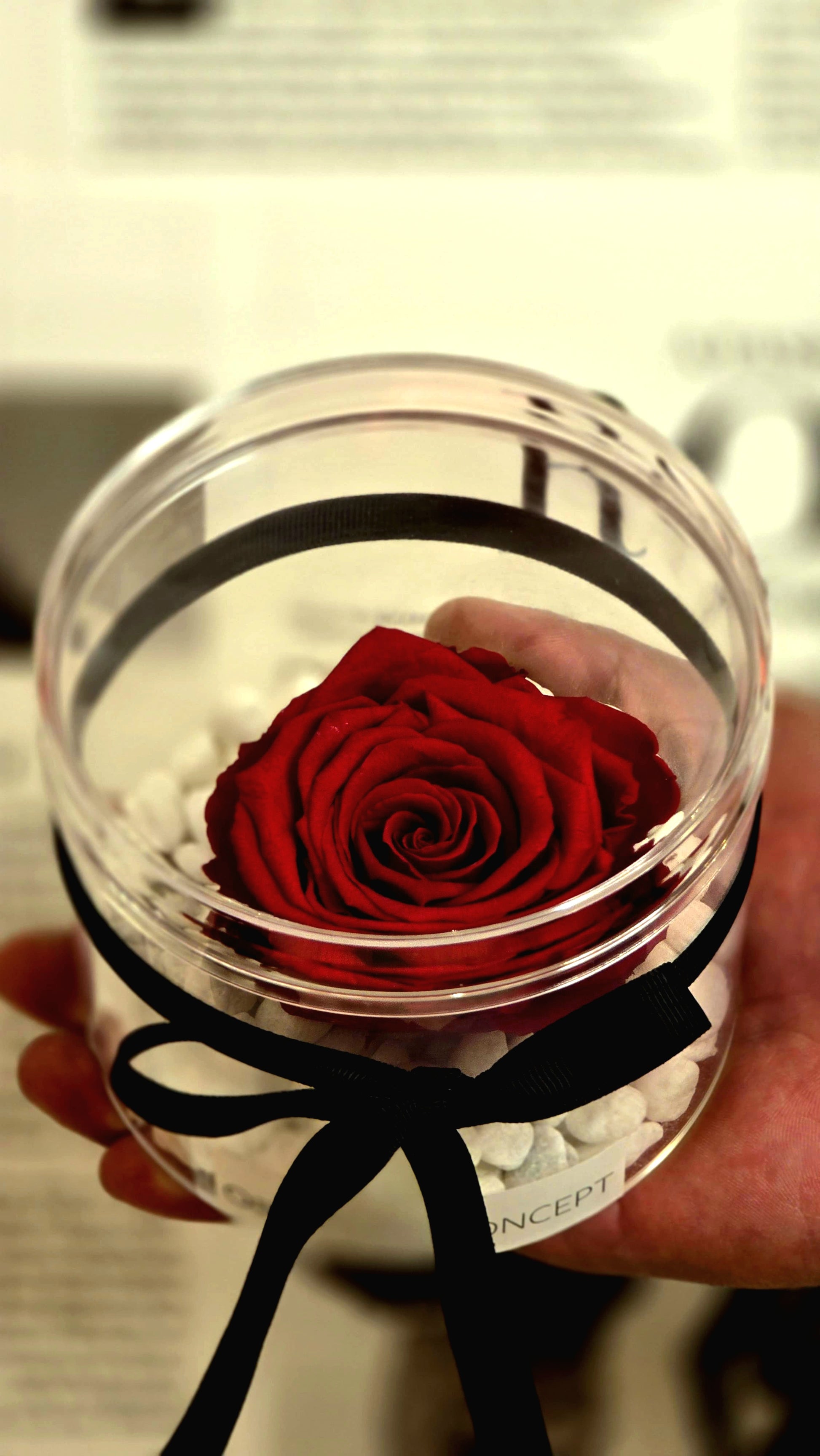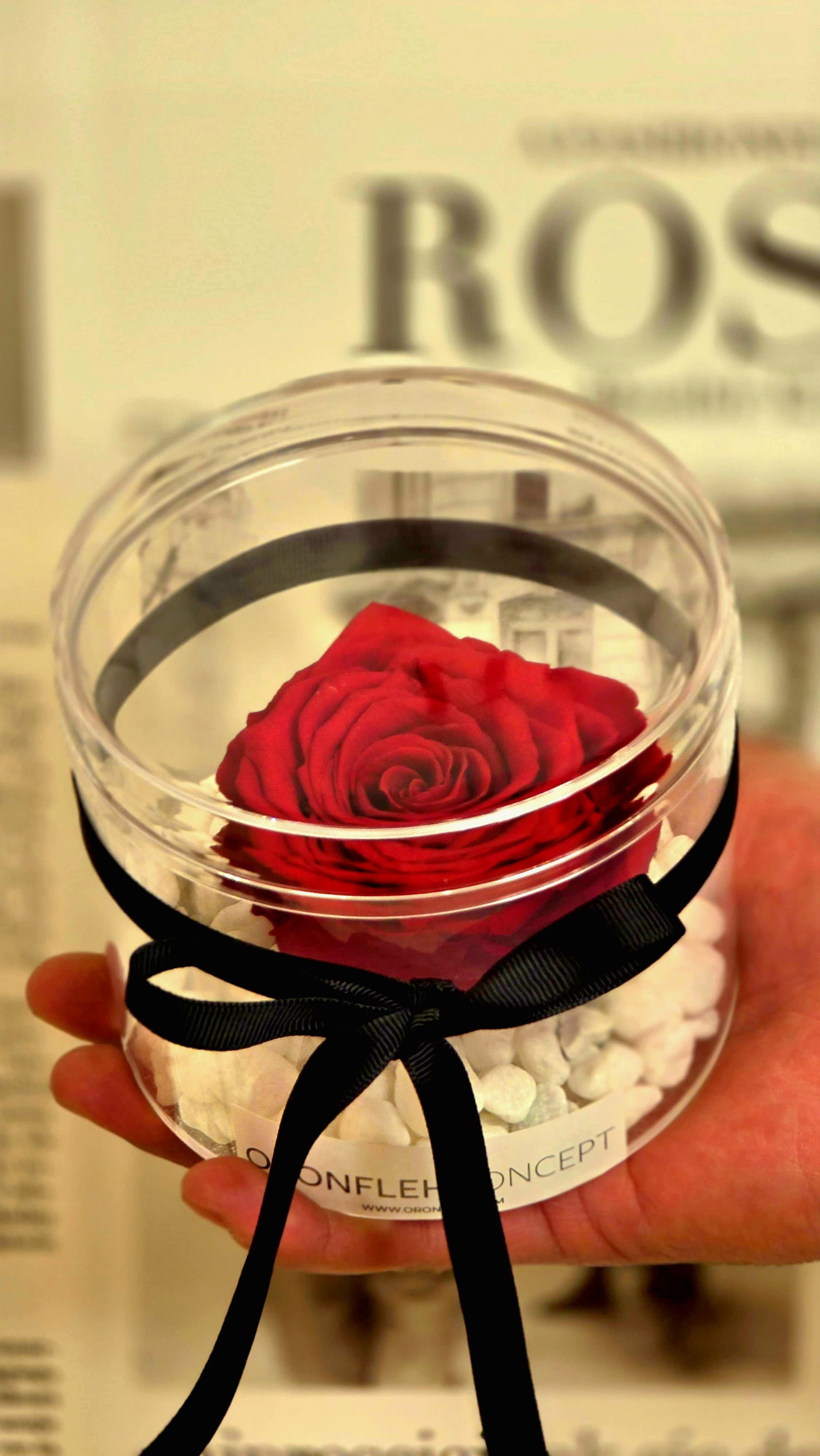 Each eternal rose is carefully preserved and placed in a crystal-clear dome, resting on soft white stones and finished with a sleek black ribbon — a symbol of elegance that never fades.