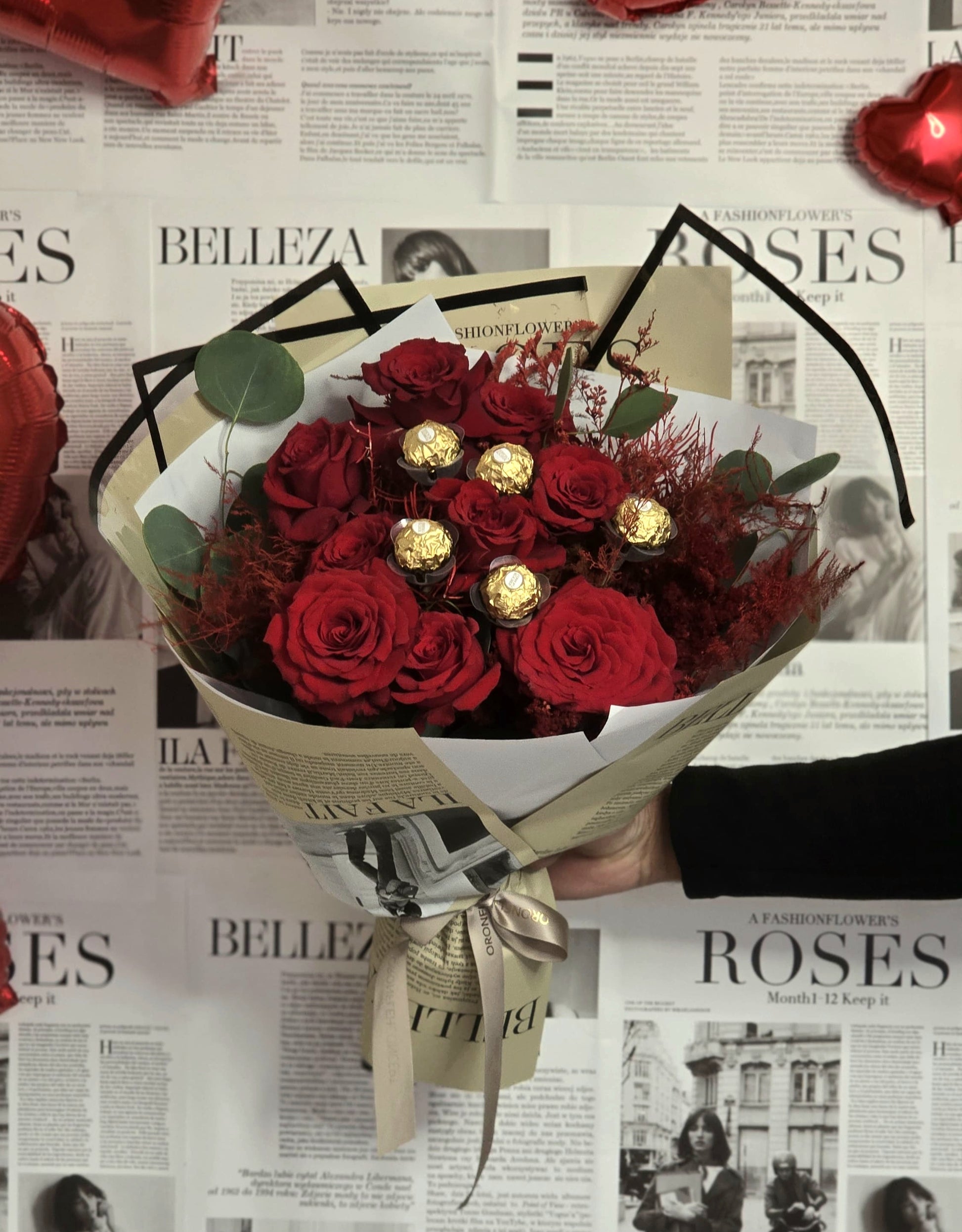 A bold Valentine’s bouquet of velvety red roses, accented with lush greenery and indulgent Ferrero Rocher chocolates. Wrapped in elegant newspaper-style paper, it’s a luxurious gesture of passion, romance, and sweet devotion. ❤️🌹🍫
