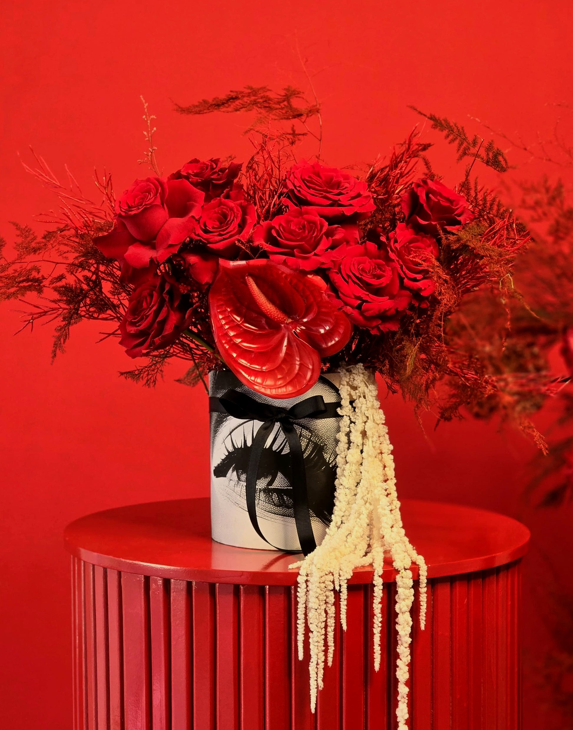 A bold and romantic statement arrangement featuring lush red roses, dramatic anthurium, and textured foliage, elegantly styled in a signature eye-print box with cascading accents. Designed to captivate at first glance—perfect for passionate gestures and unforgettable moments.