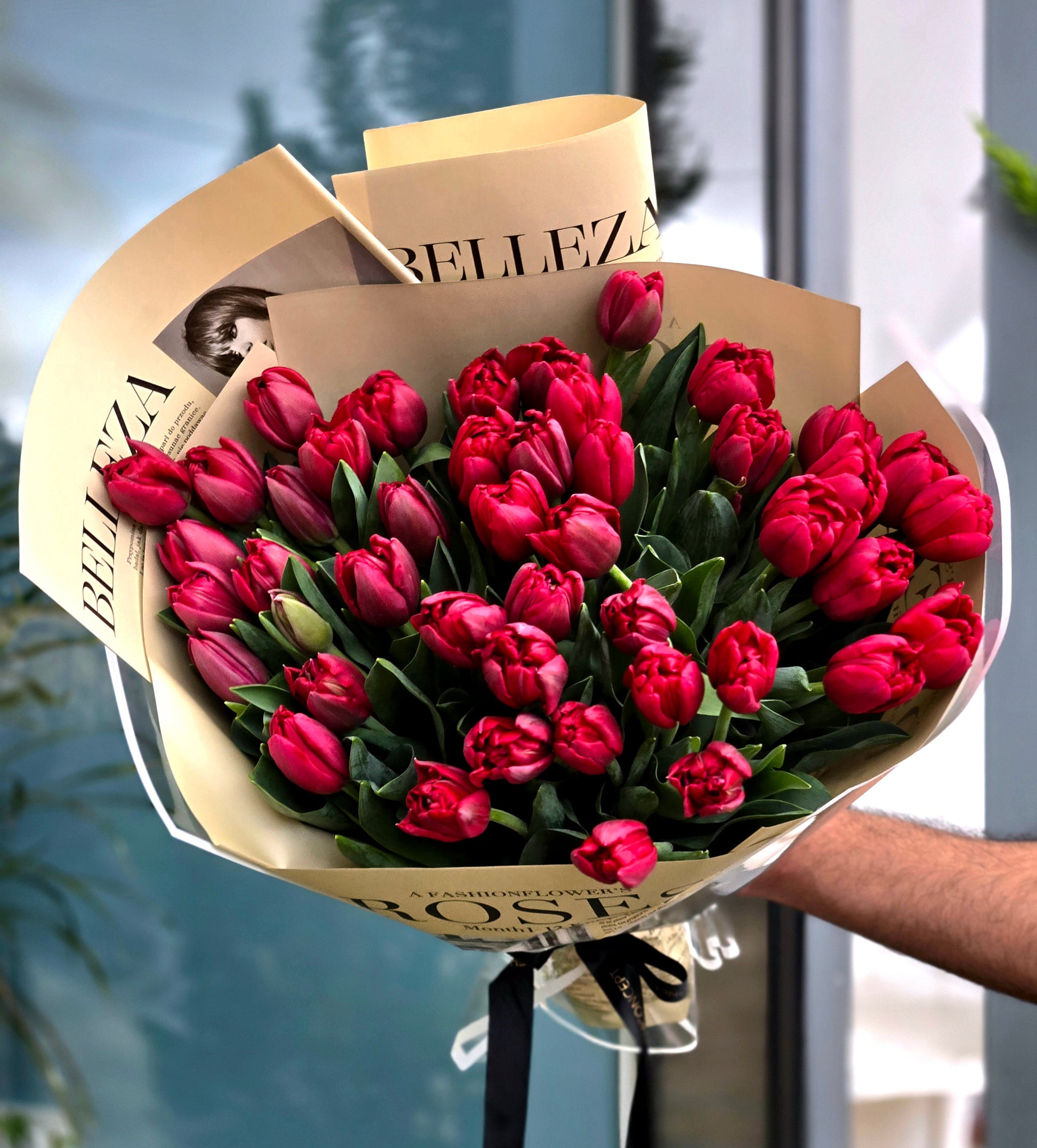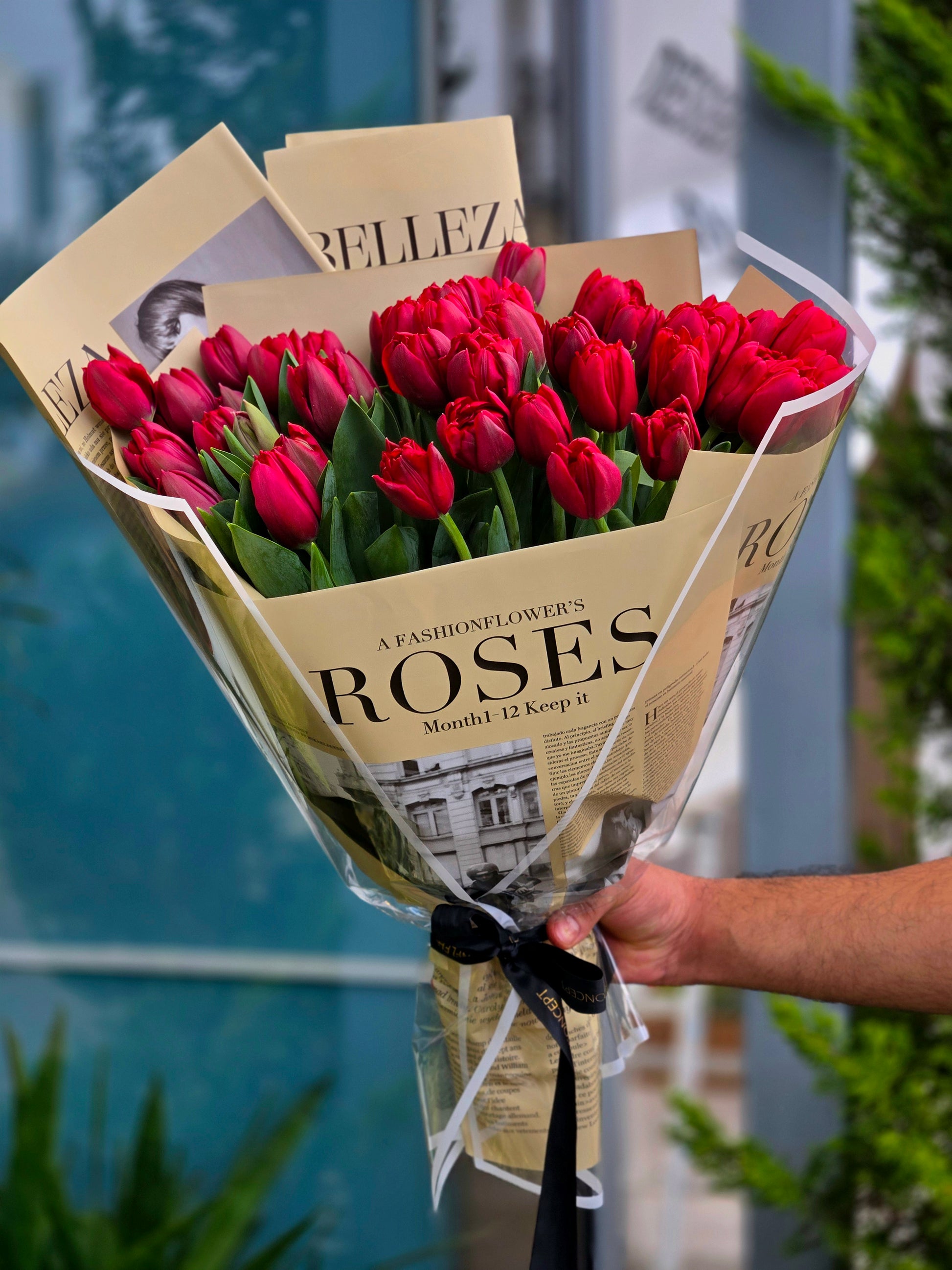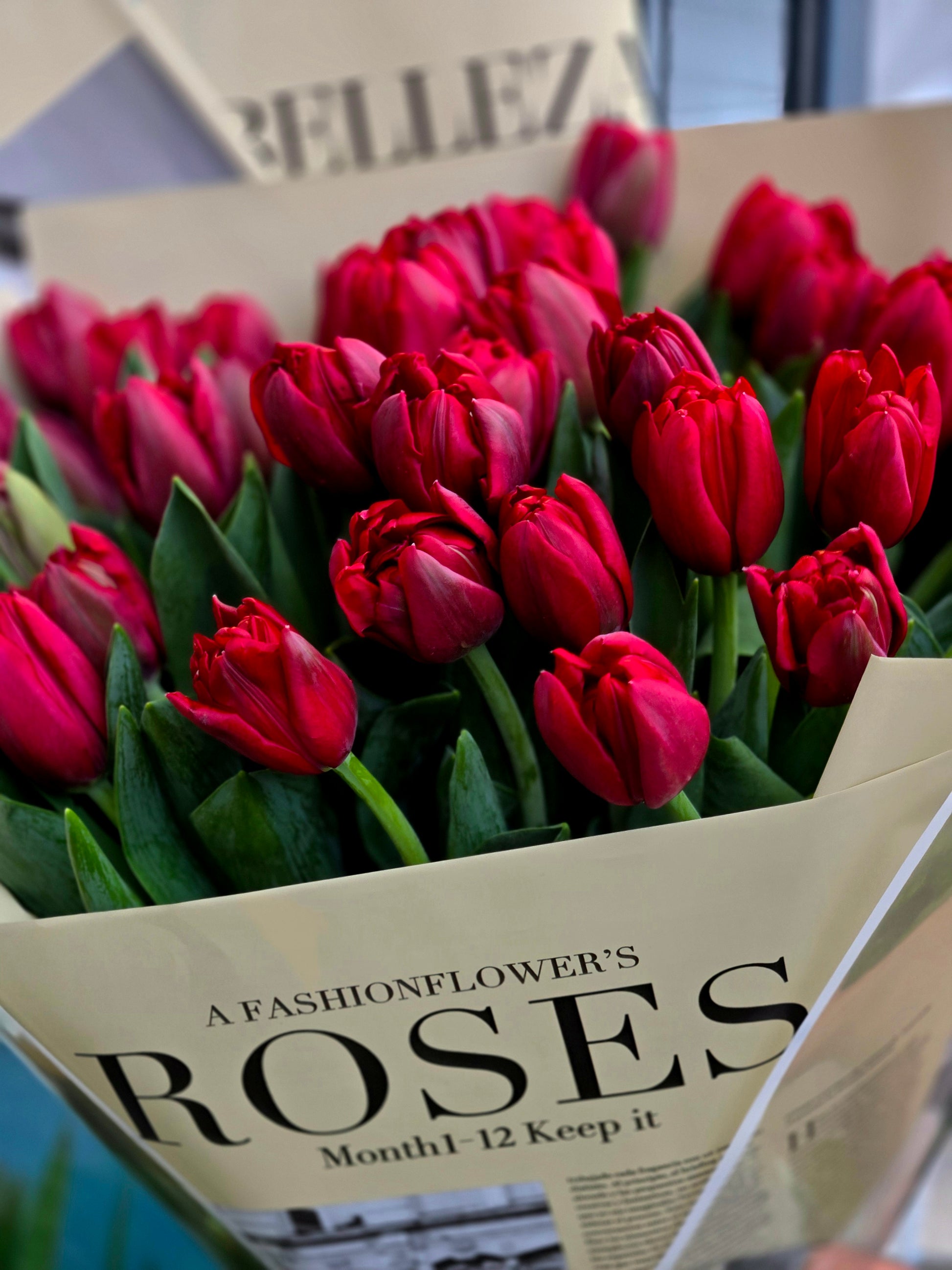 A chic Valentine’s bouquet featuring fresh red tulips wrapped in stylish, fashion-inspired paper for a modern romantic look. Bold, elegant, and full of passion, it’s the perfect statement gift to say “I love you” in the most sophisticated way. ❤️🌷✨