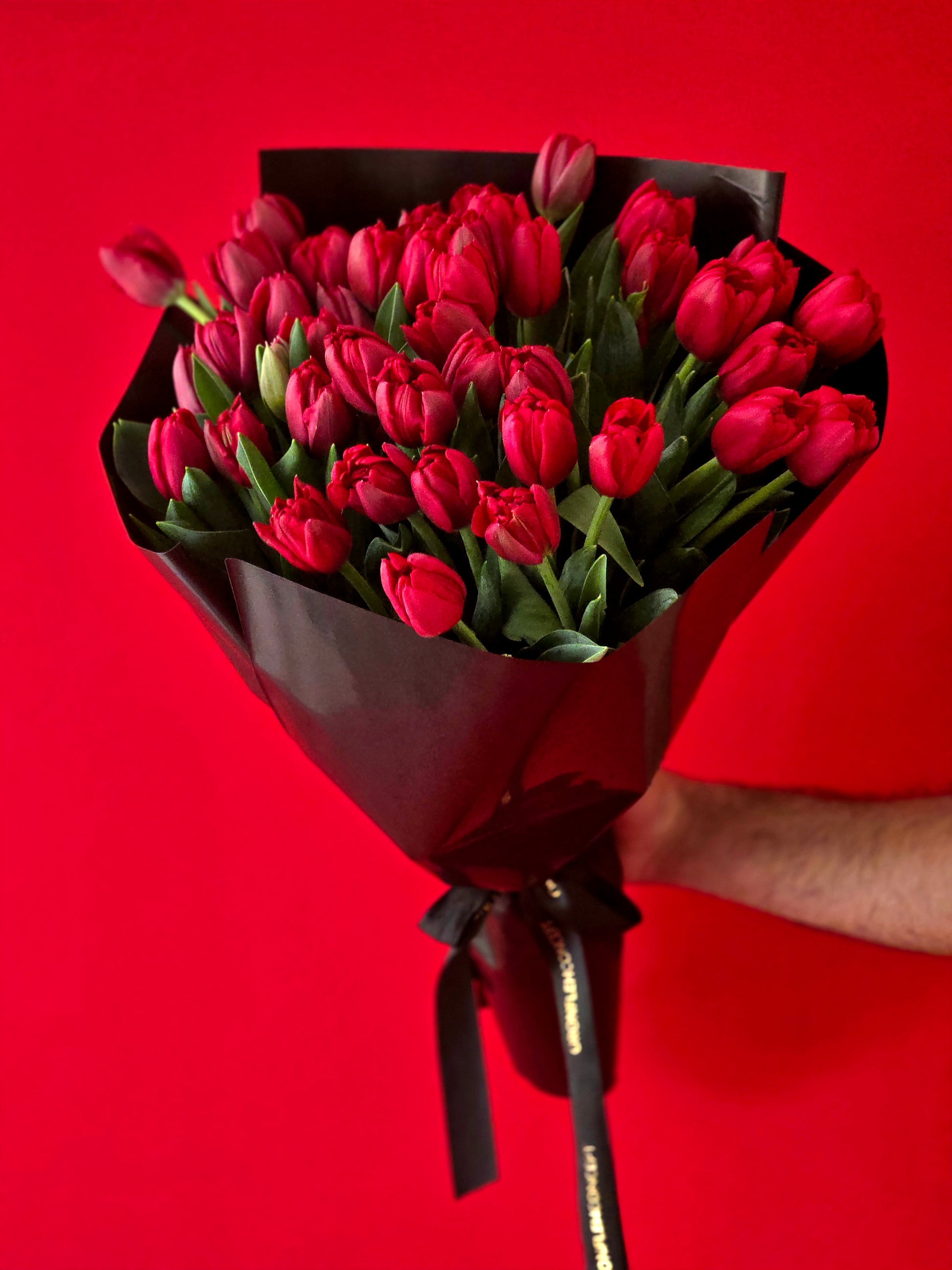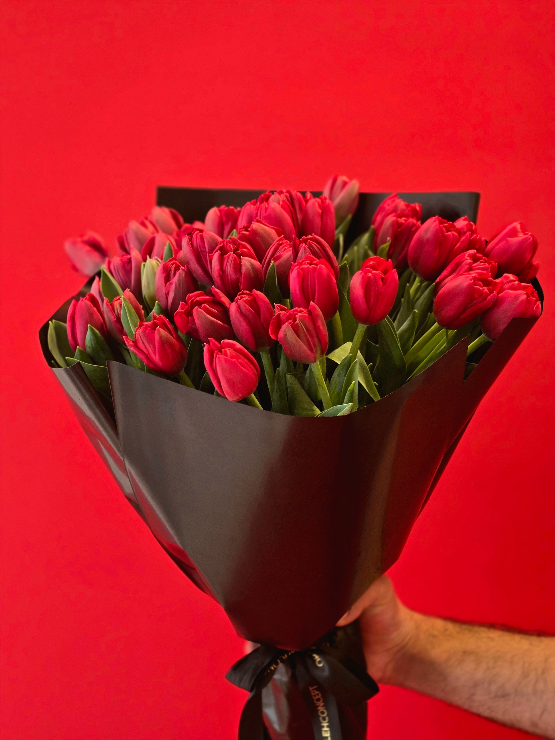 A bold and elegant bouquet of fresh red tulips, beautifully wrapped in sleek black packaging for a modern, sophisticated touch. Simple yet striking, this arrangement is the perfect way to express deep love and timeless romance. ❤️🌷