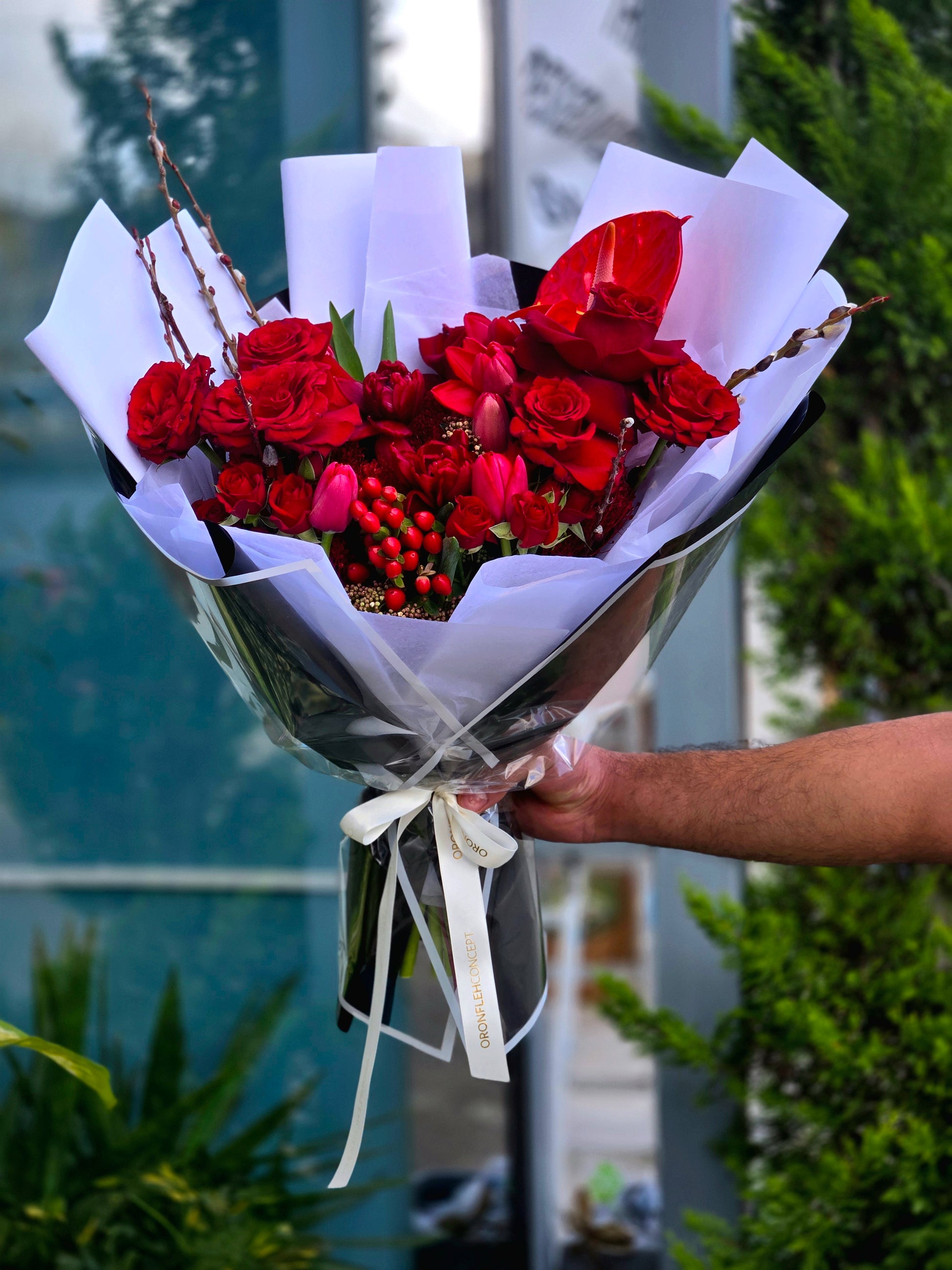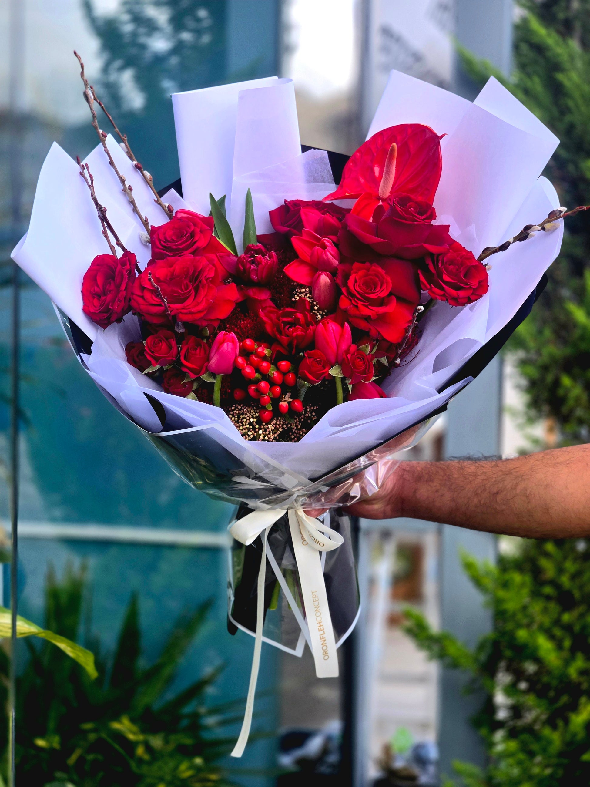 A bold and romantic bouquet featuring luxurious red roses, vibrant tulips, elegant anthurium, and seasonal accents, beautifully wrapped in crisp white and black layers. Finished with delicate berries and natural branches, this arrangement is a timeless expression of love and passion—perfect for making a grand impression.