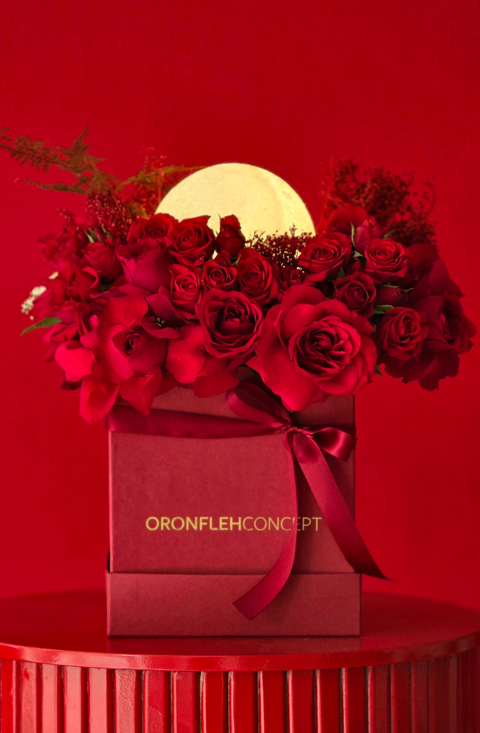 An enchanting box of premium red roses, elegantly arranged with a soft glowing moonlight detail for a magical touch.