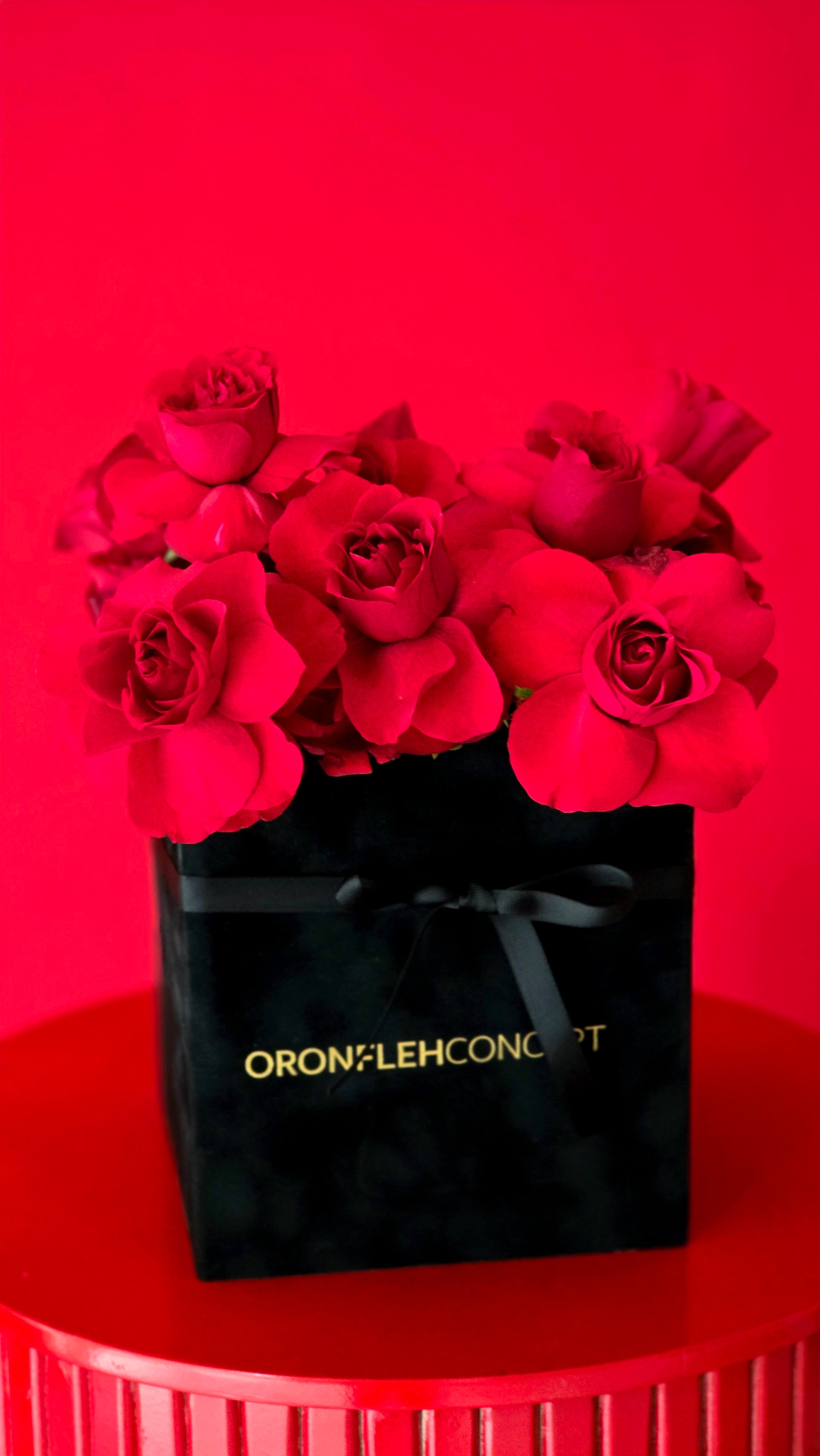 A luxurious arrangement of premium red roses elegantly set in a sleek black velvet box, finished with a delicate ribbon.