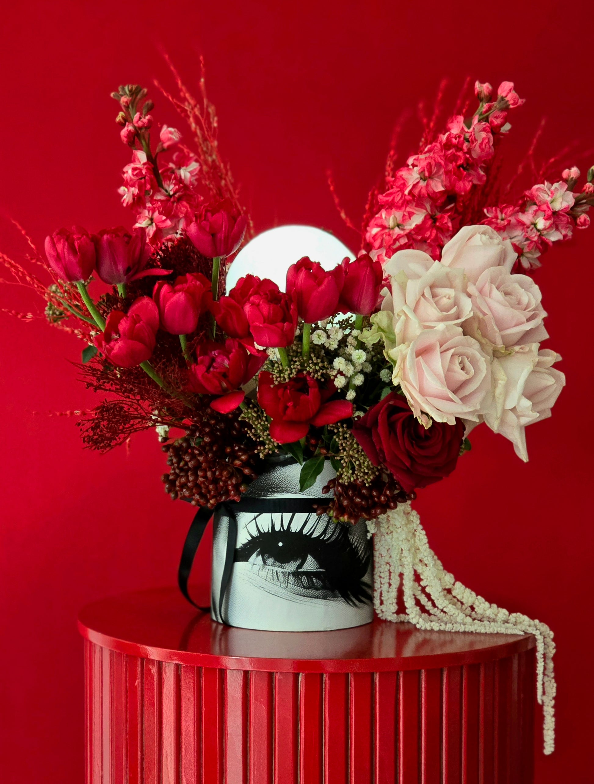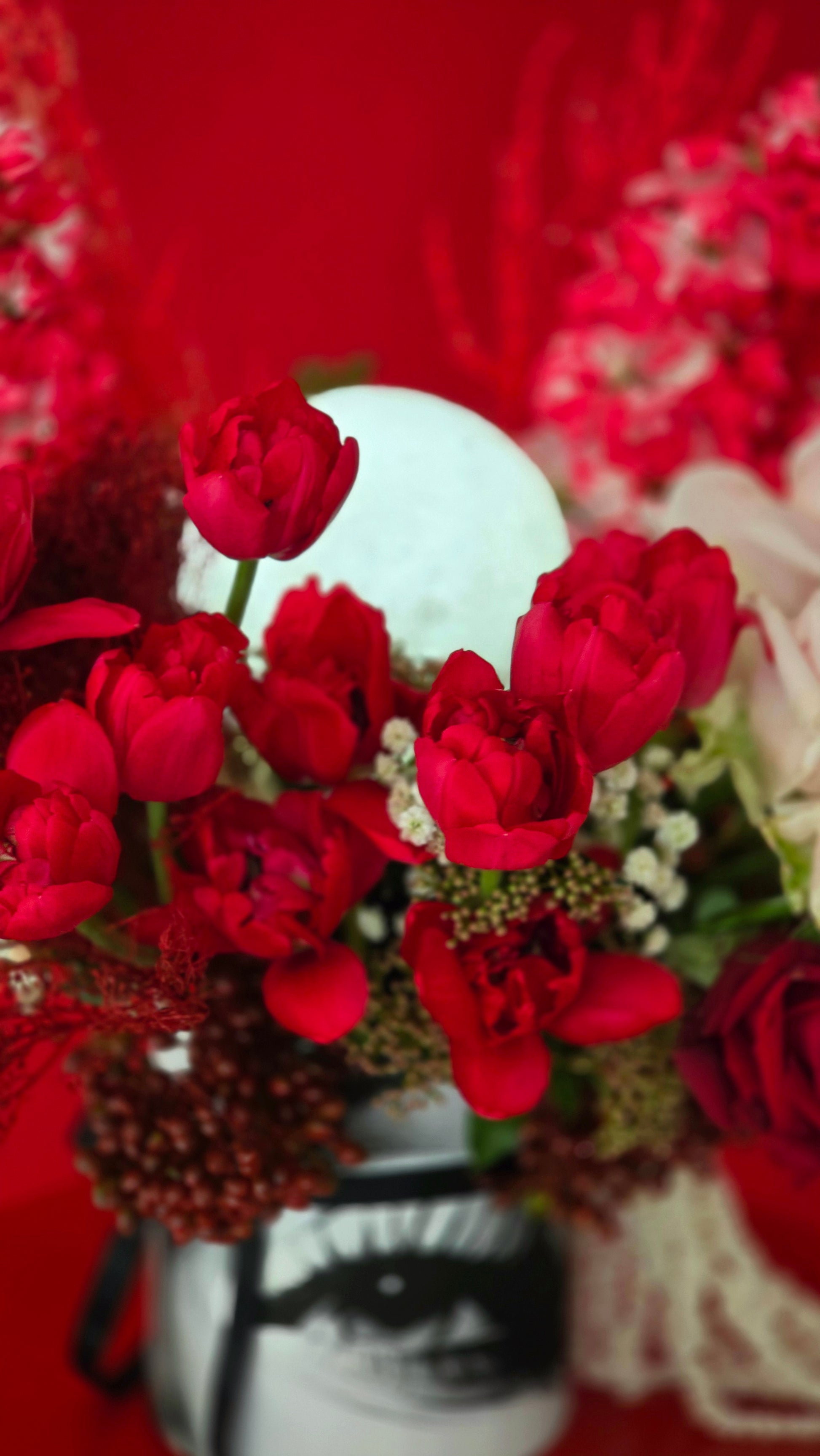 A striking blend of red tulips, passionate red roses, and soft ivory blooms, artistically arranged with rich textures and modern details.