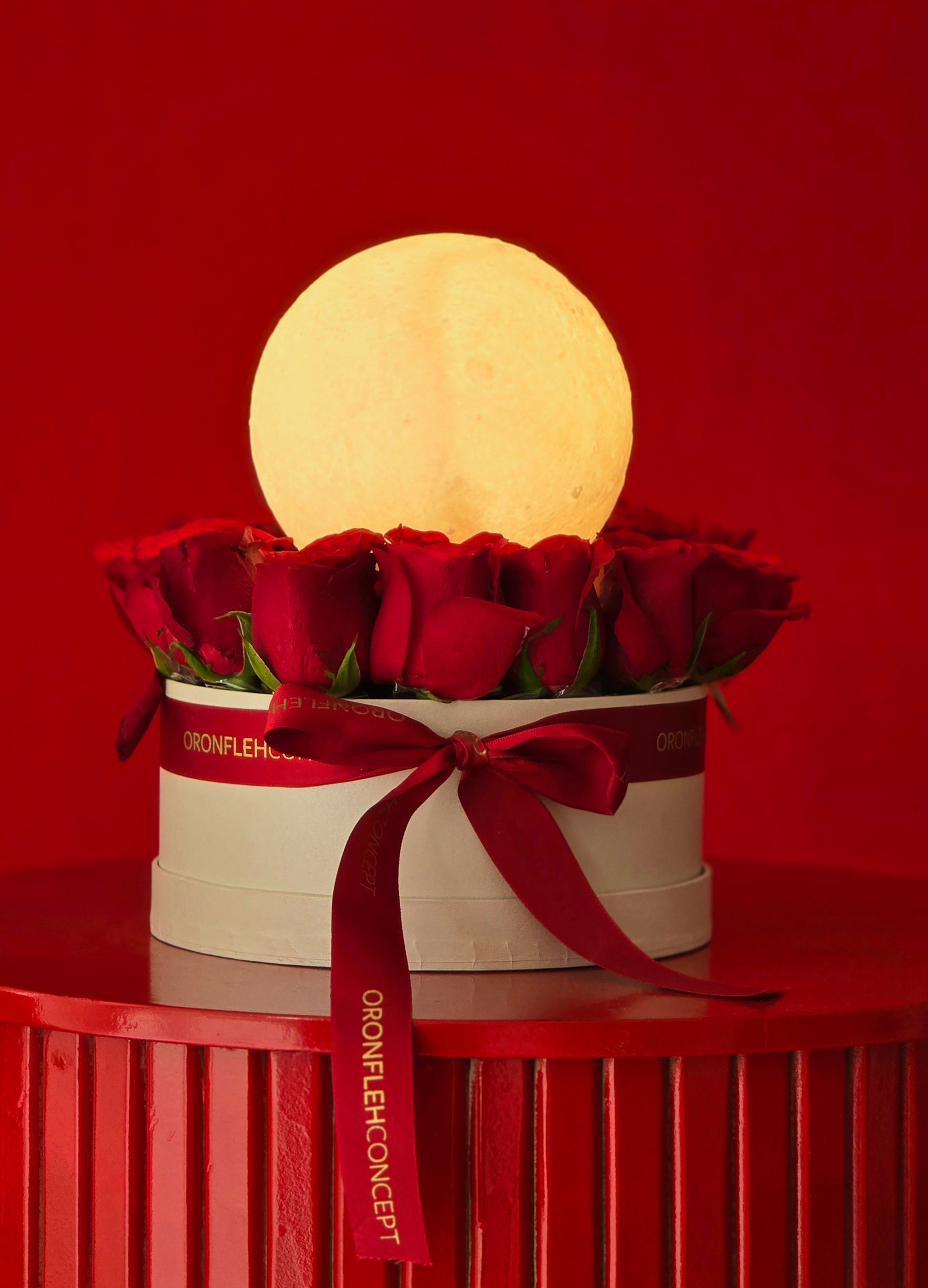 A captivating arrangement of premium red roses encircling a glowing moonlight sphere, beautifully presented in an elegant round box with a signature ribbon.
