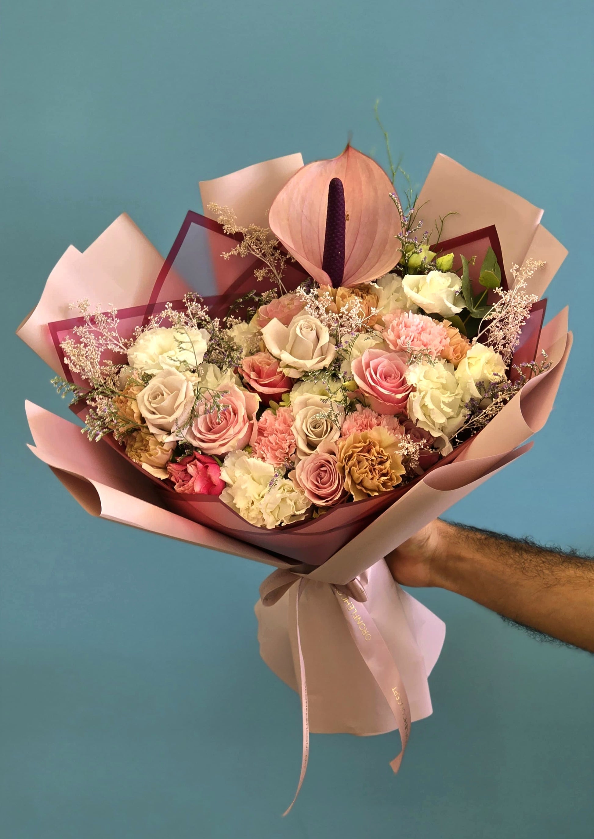 A stunning hand-tied bouquet that blends soft romance with modern elegance. Featuring a lush mix of roses in blush, ivory, and peach tones, accented with delicate carnations, hydrangeas, and a striking pink anthurium as the focal point, this arrangement captures both charm and sophistication.