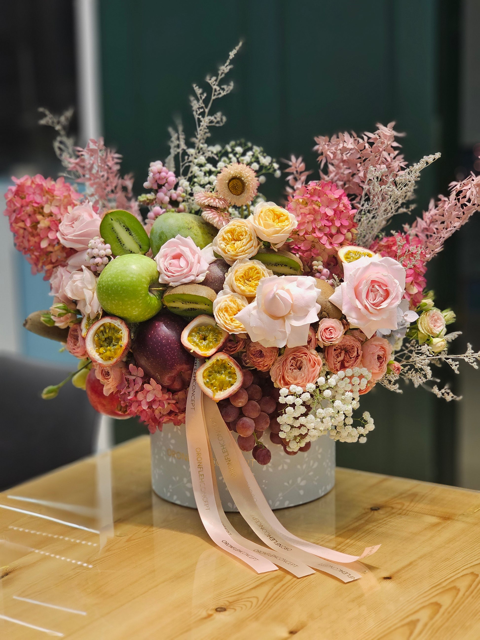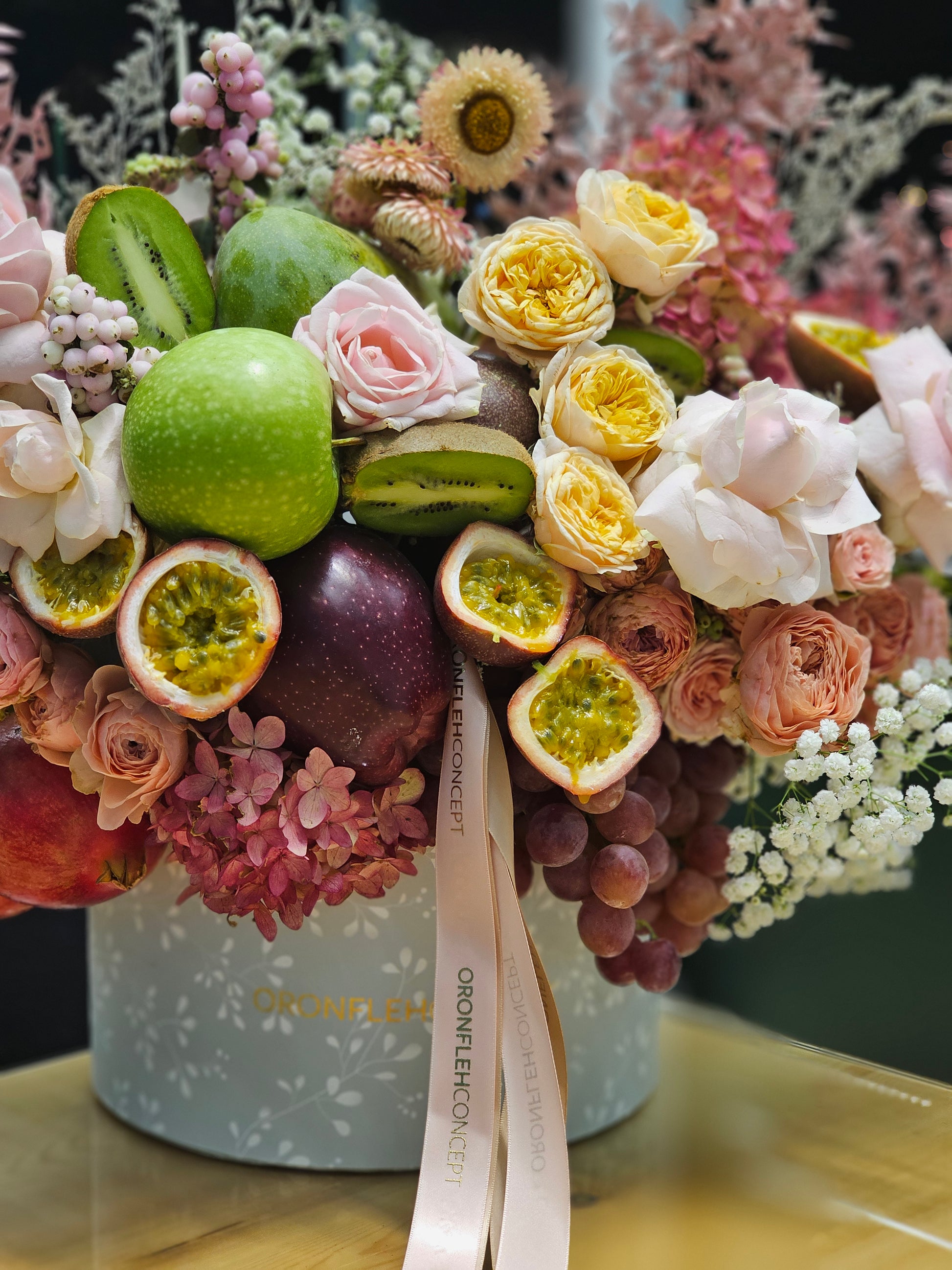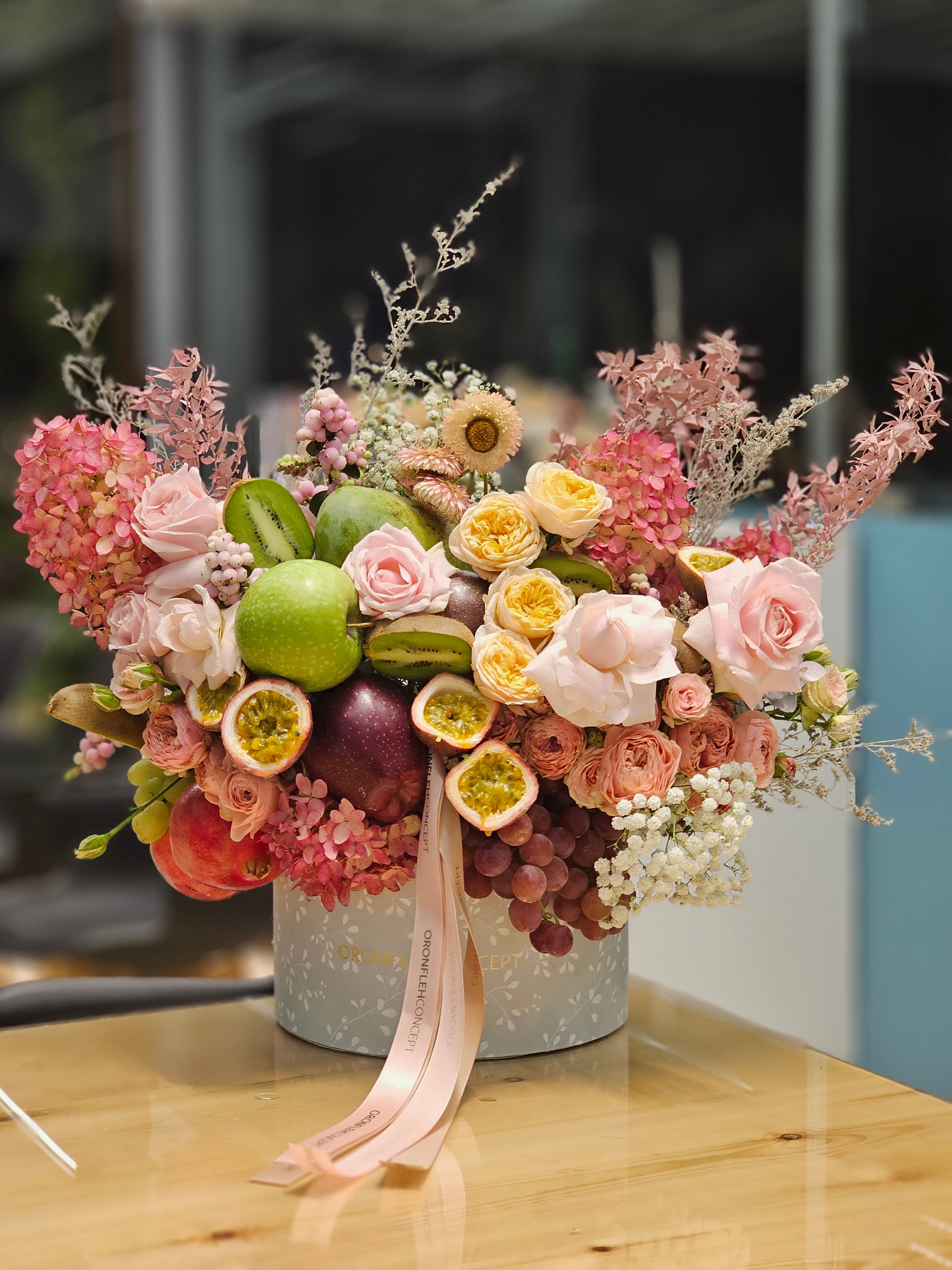 A special Colorful Flower Arrangement in our Oronfleh Concept box consisting of flowers & fruits.