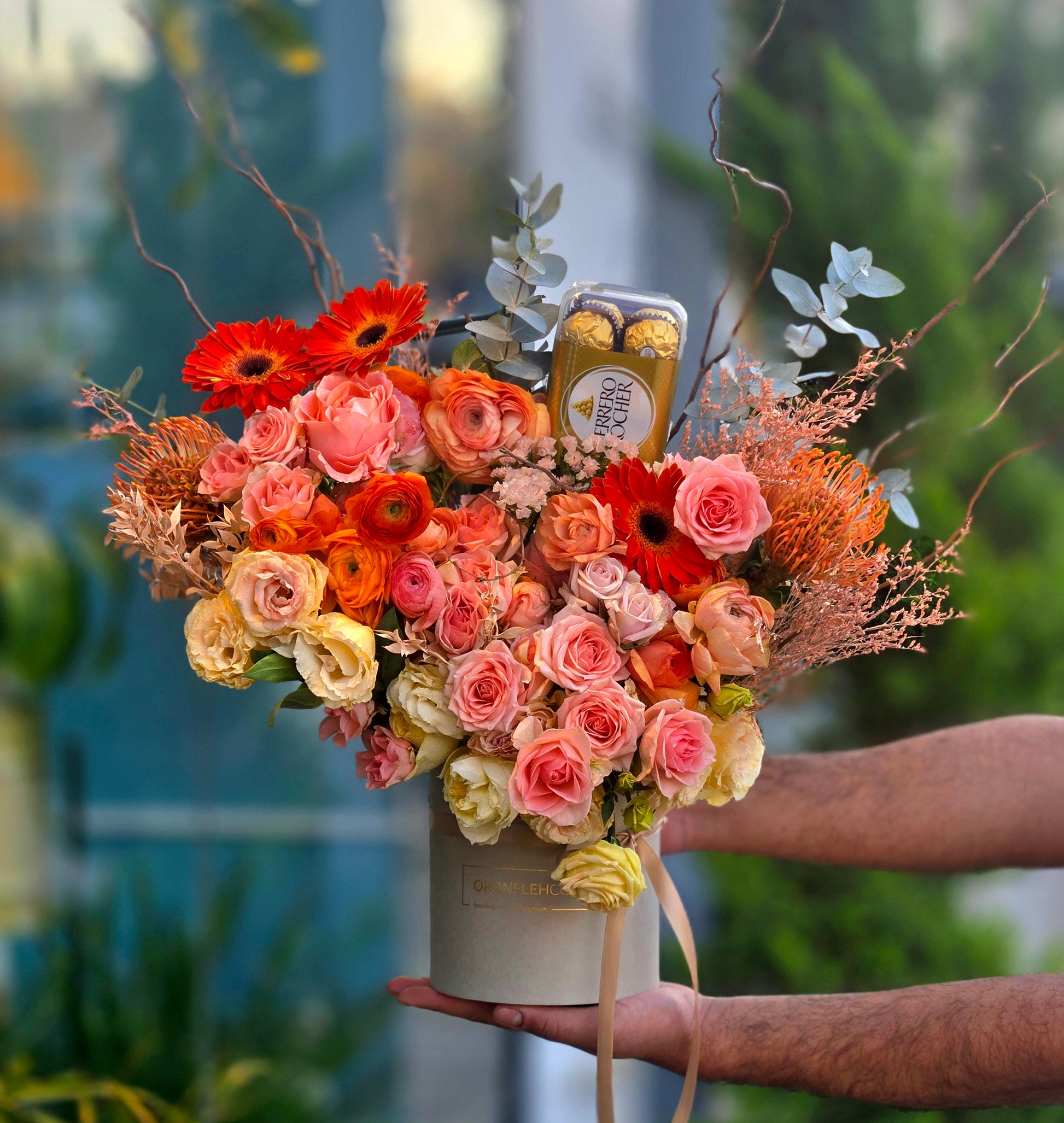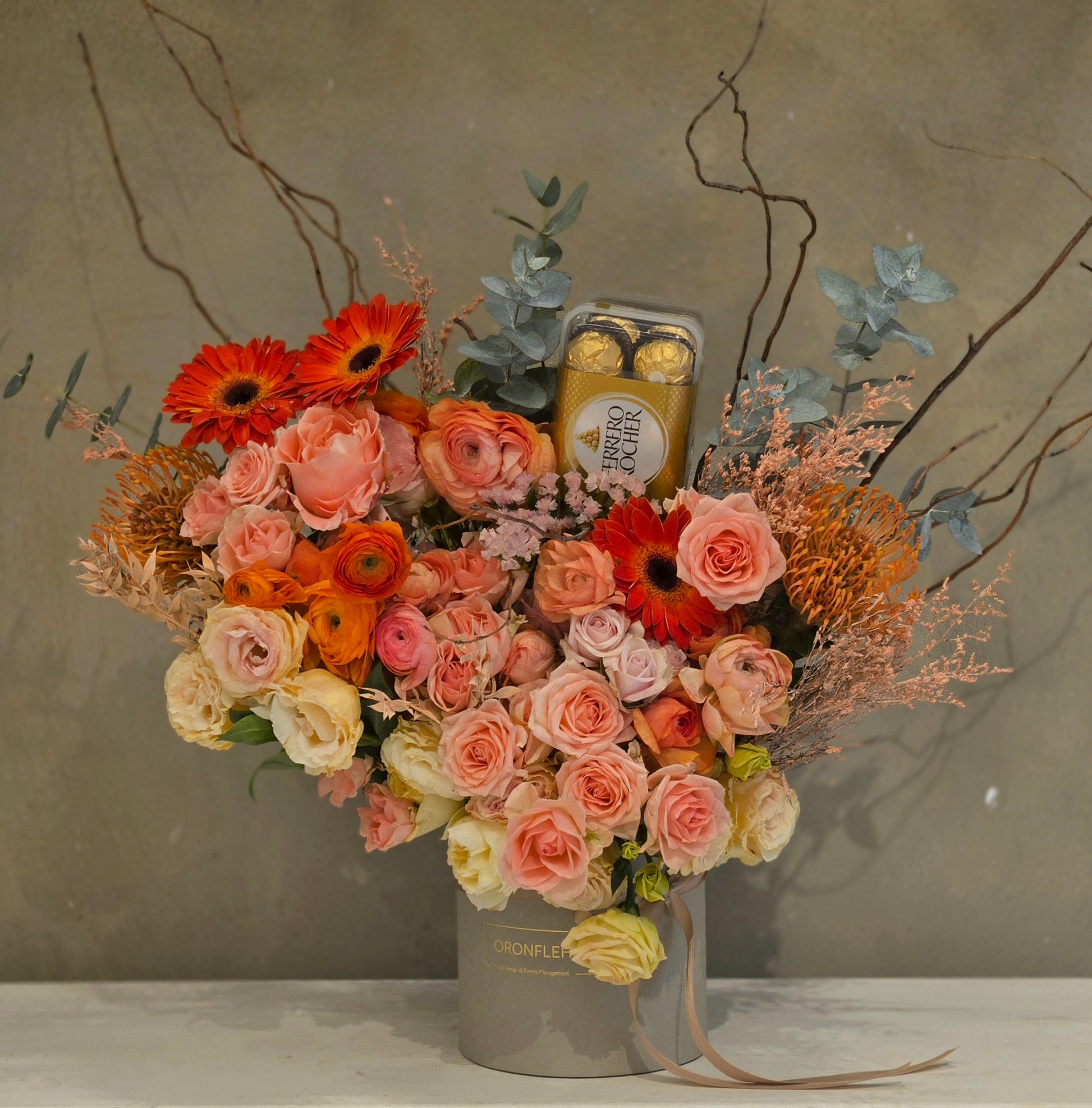 A warm and elegant arrangement blending soft blush roses, peach ranunculus, and vibrant gerberas, accented with eucalyptus and delicate dried elements. Finished with a touch of luxury through golden Ferrero Rocher chocolates, this design is perfect for heartfelt celebrations and refined gifting. ✨