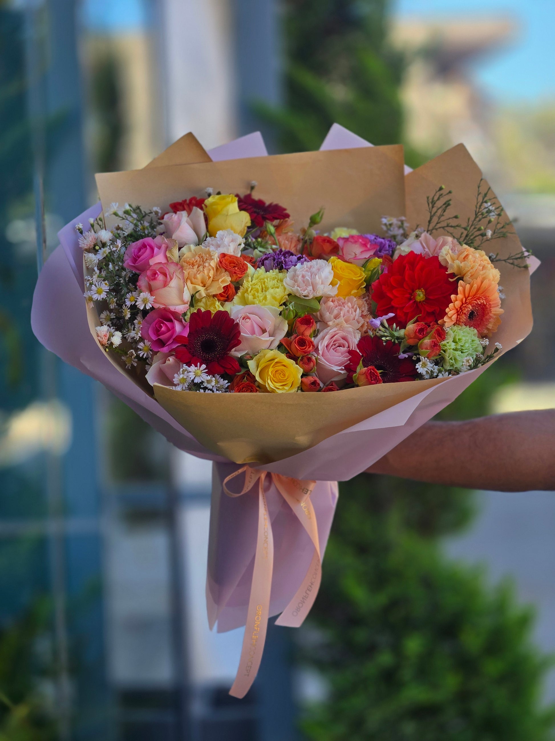 Bursting with vibrant colors and timeless elegance, our Radiant Harmony Bouquet is a joyful celebration of life’s most beautiful moments. This lush hand-tied arrangement features a stunning mix of roses, gerberas, carnations, dahlias, spray roses, and seasonal blooms in a harmonious palette of red, pink, yellow, peach, and lavender tones.
