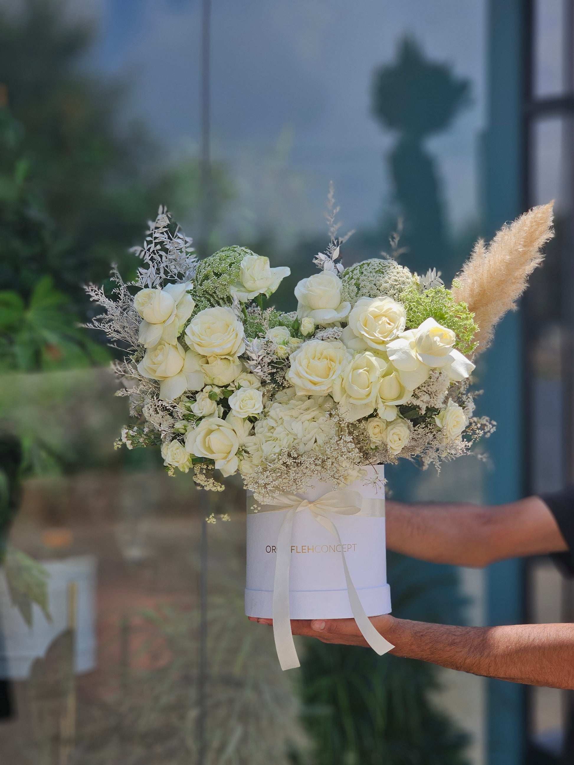 White Flower Arrangement in our Oronfleh Concept box consisting of Roses, Baby Roses, limonium, Viburnum & Pampas Grass.