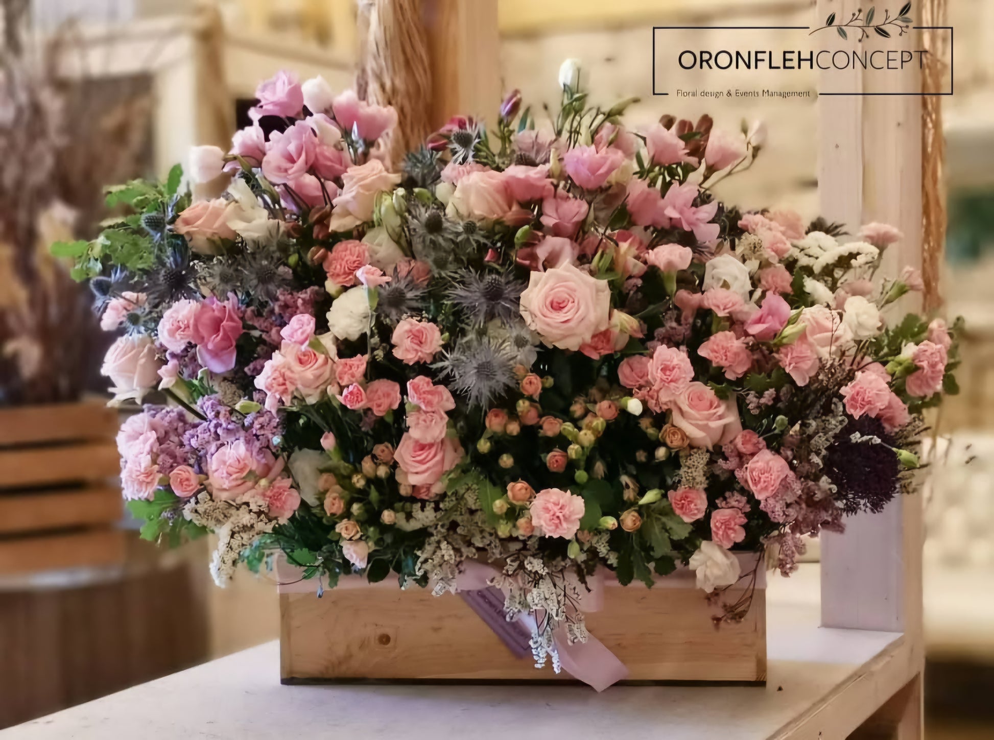 Colorful Flower Arrangement in our Oronfleh wooden box consisting of Roses, Baby Roses, English Rose, Ruscus & eucalyptus .