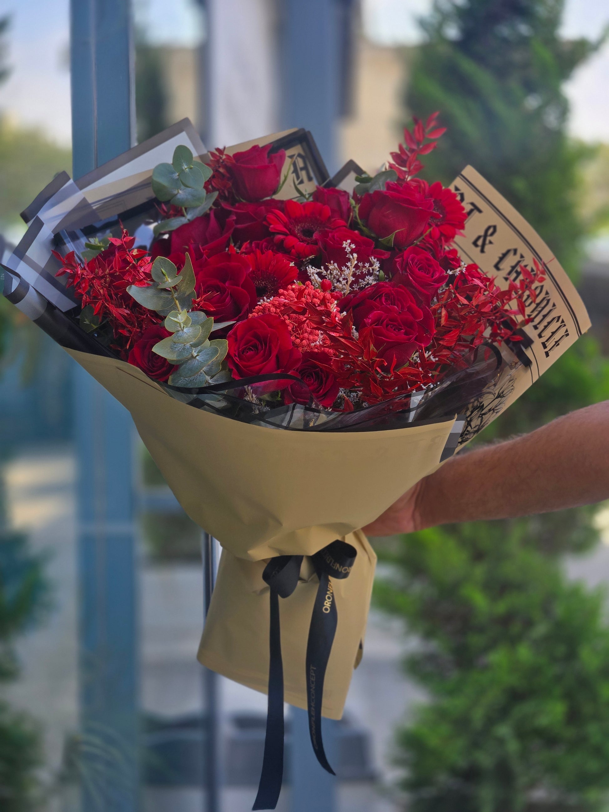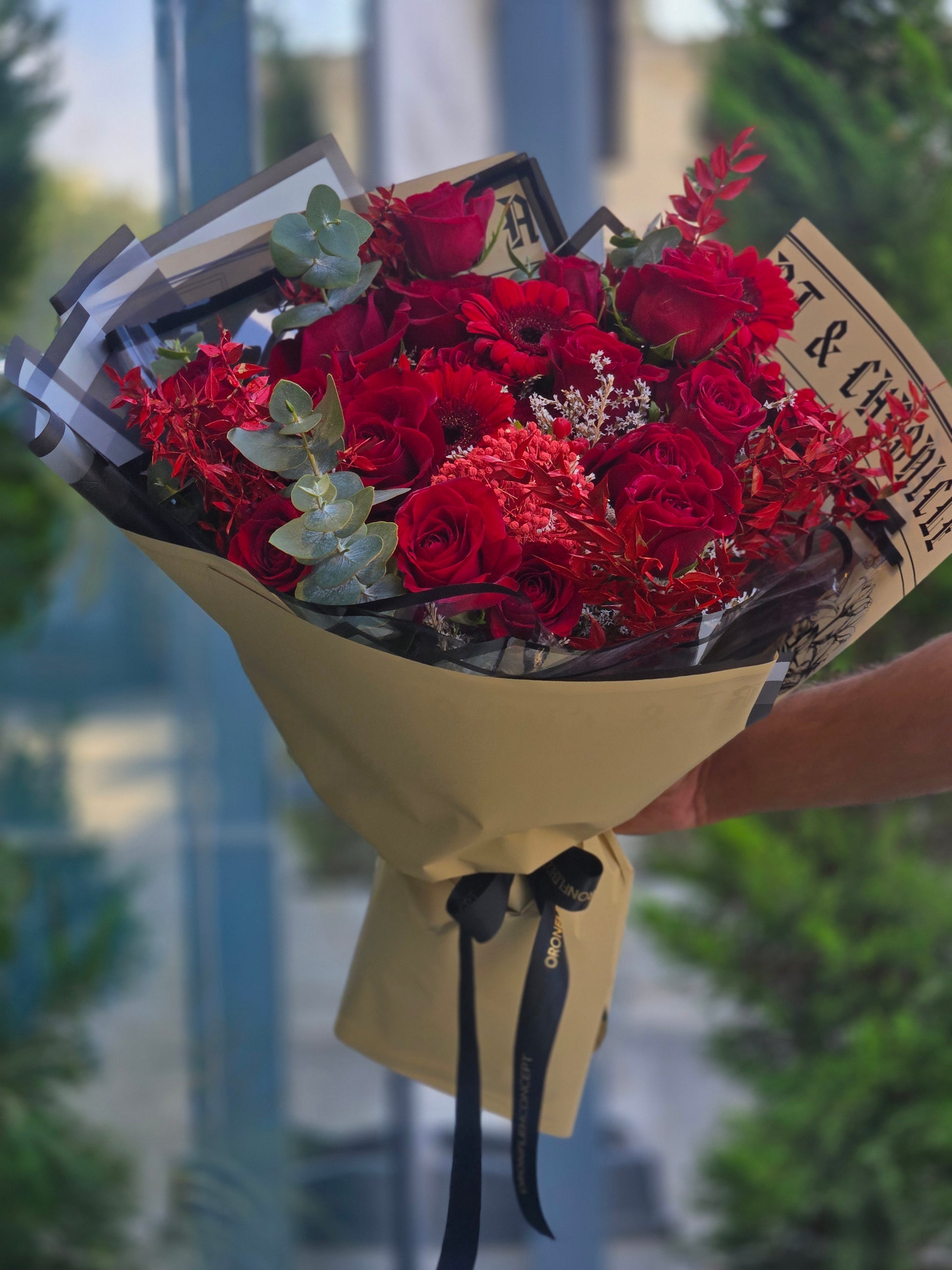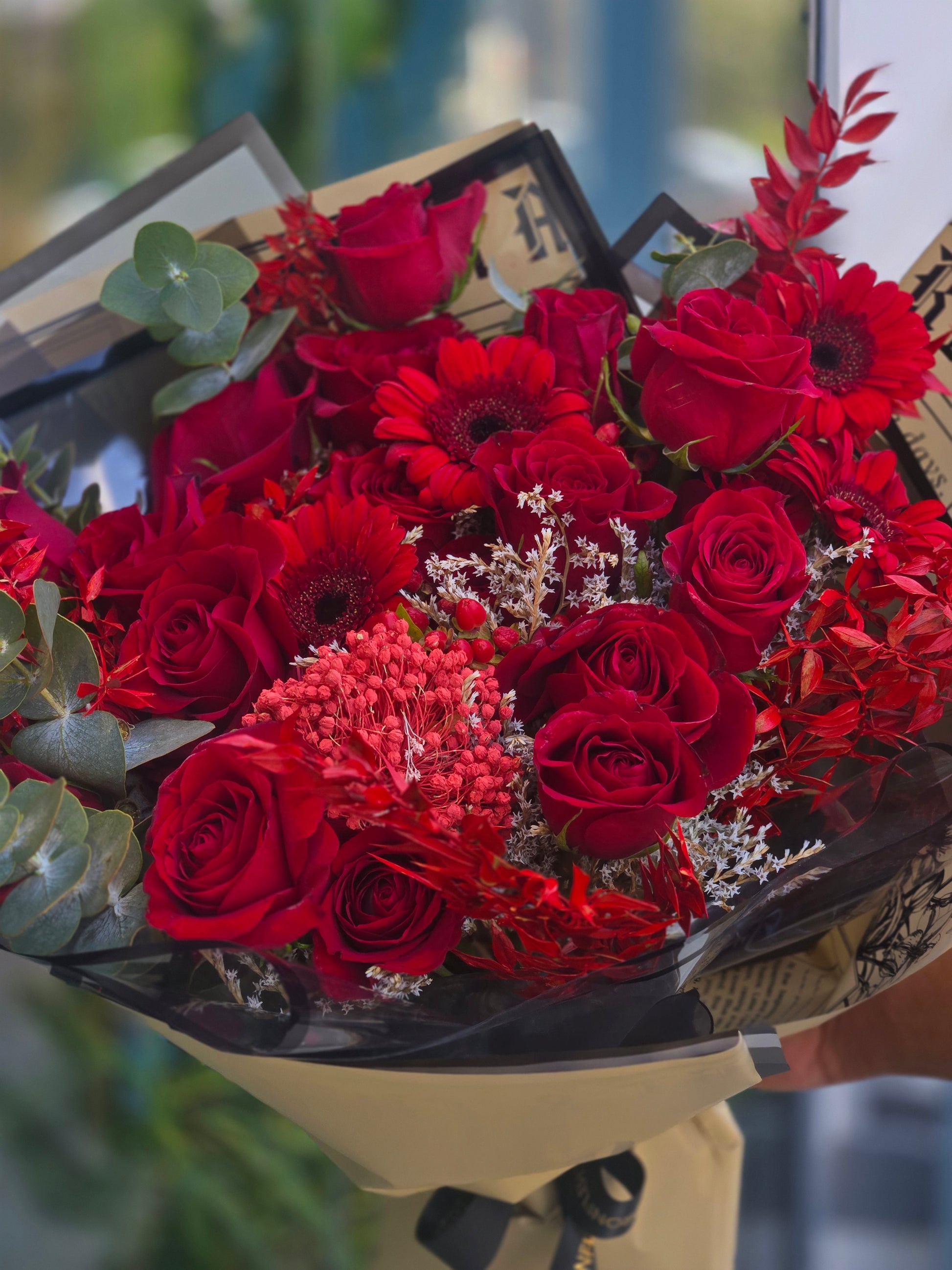 A stunning arrangement of vibrant red blooms, carefully crafted to capture passion, elegance, and timeless romance. This bouquet is perfect for expressing love, celebrating special moments, or adding a bold touch of beauty to any space. Its lush, fresh flowers are artfully arranged to create a striking statement piece that leaves a lasting impression.