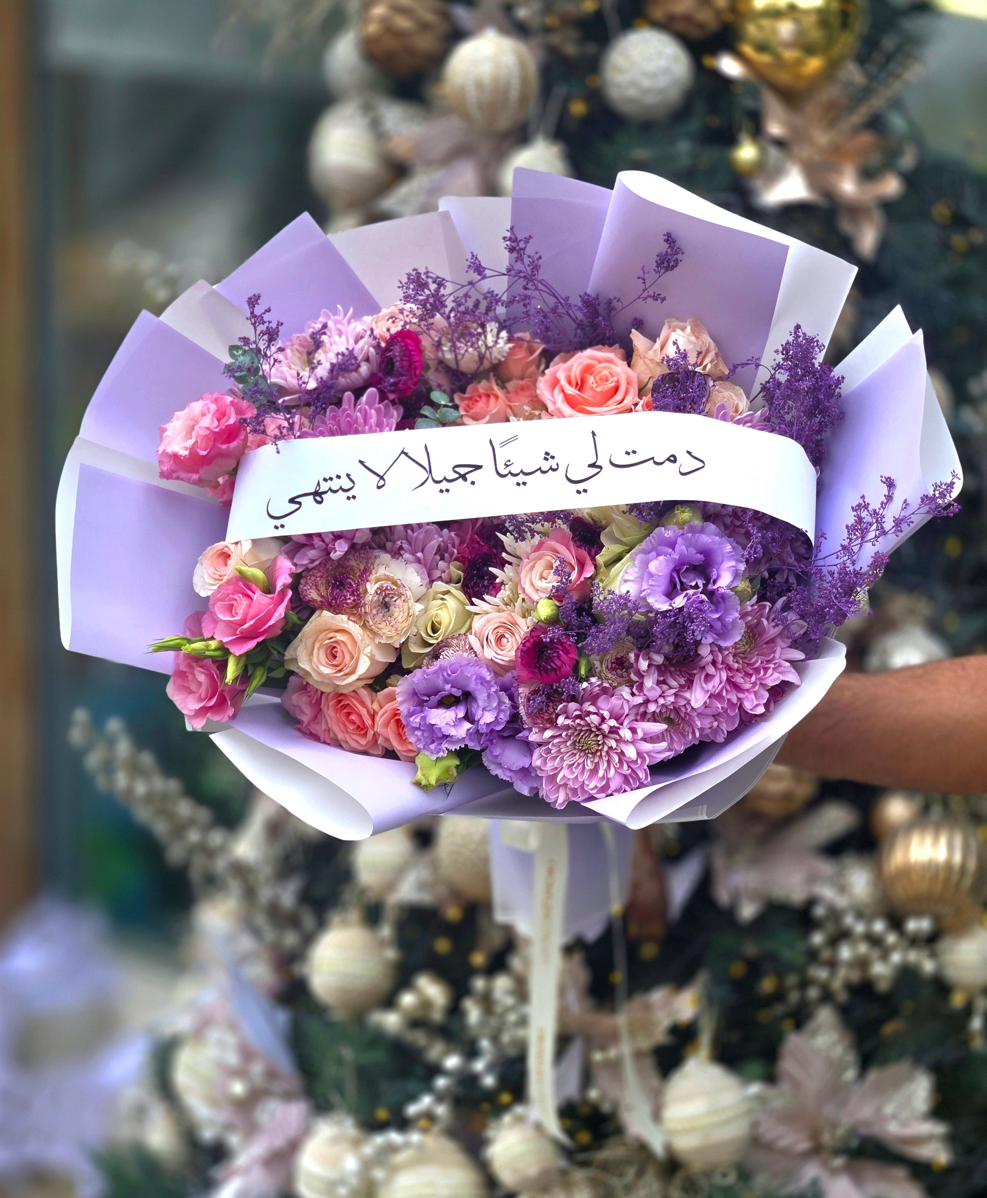 A graceful harmony of lilac, blush, and soft peach blooms, this bouquet speaks of timeless beauty and gentle romance—an elegant expression of feelings that never fade.