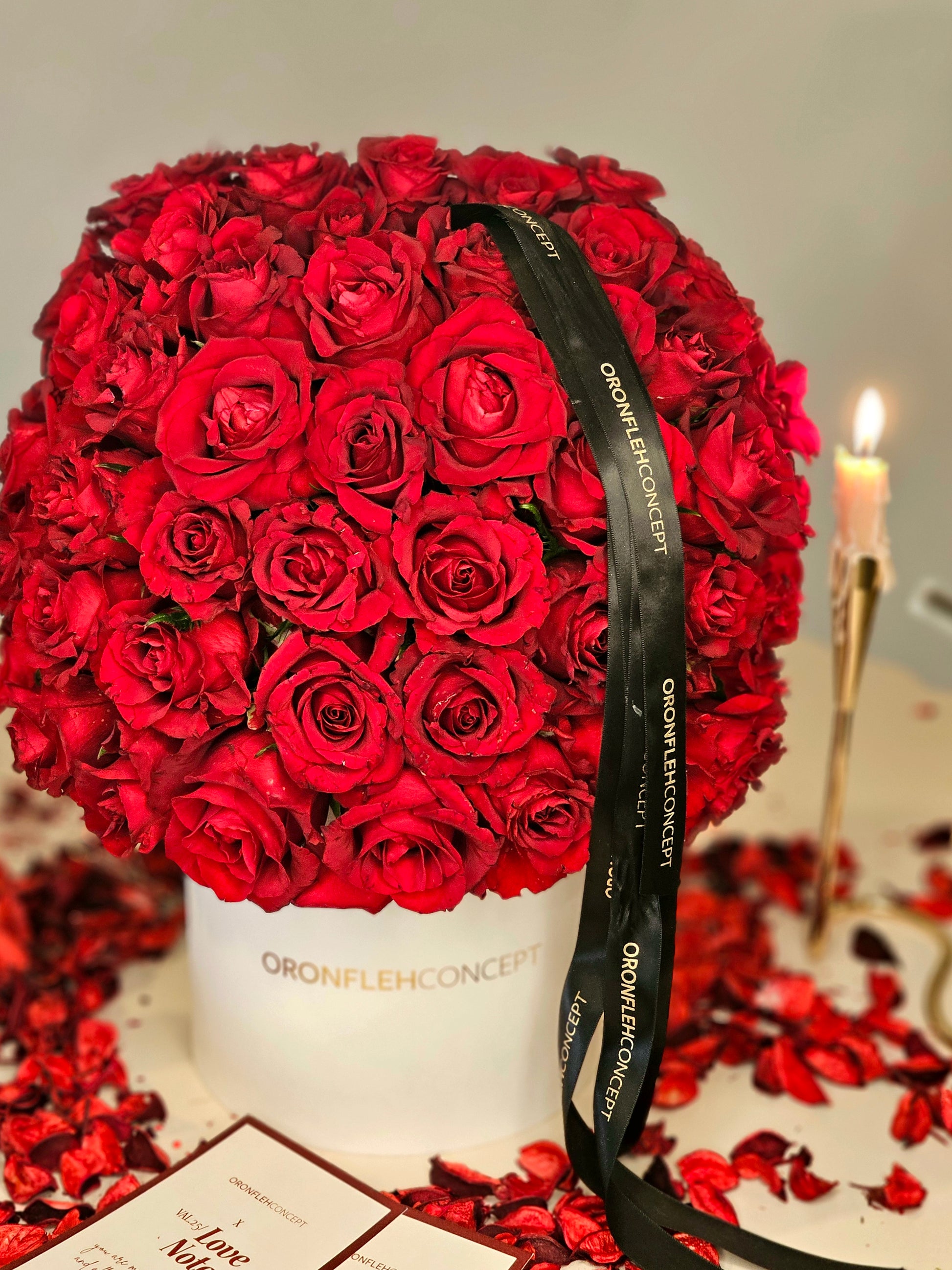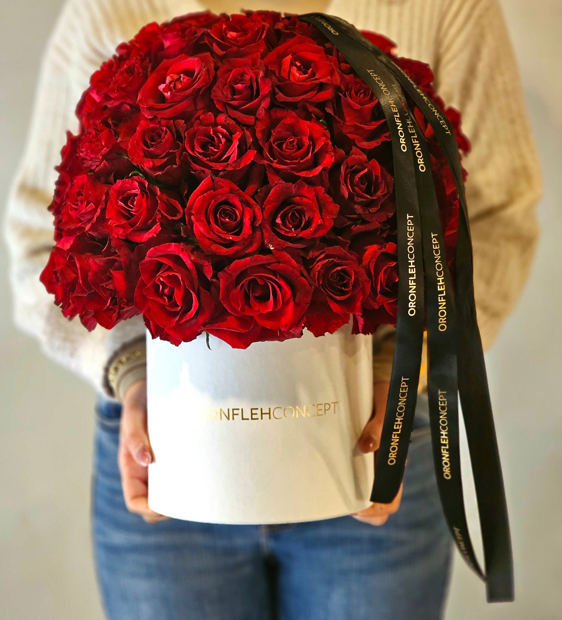 A full Round Roses arrangement in a our Oronfleh Concept white Box