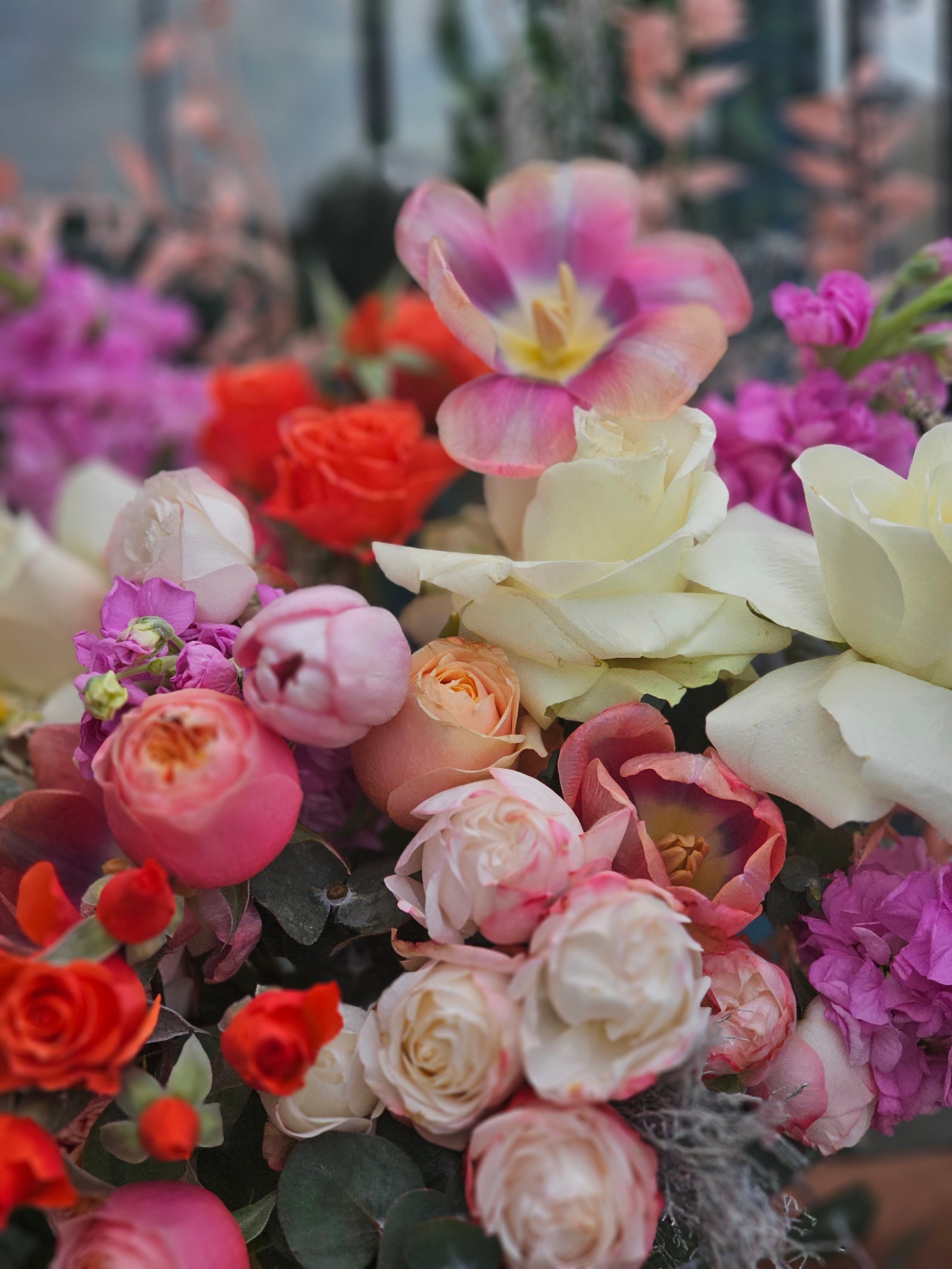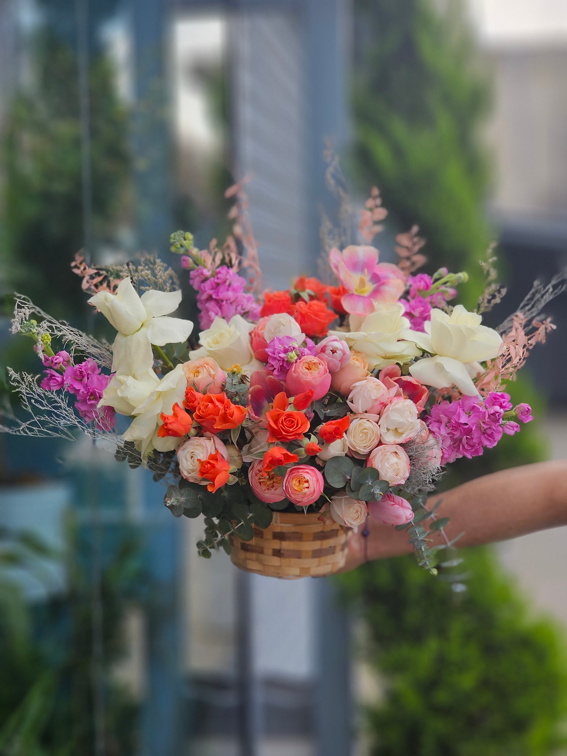 Colorful Flower Arrangement consisting of Roses, Baby Roses, English Rose, Wallflower & eucalyptus .