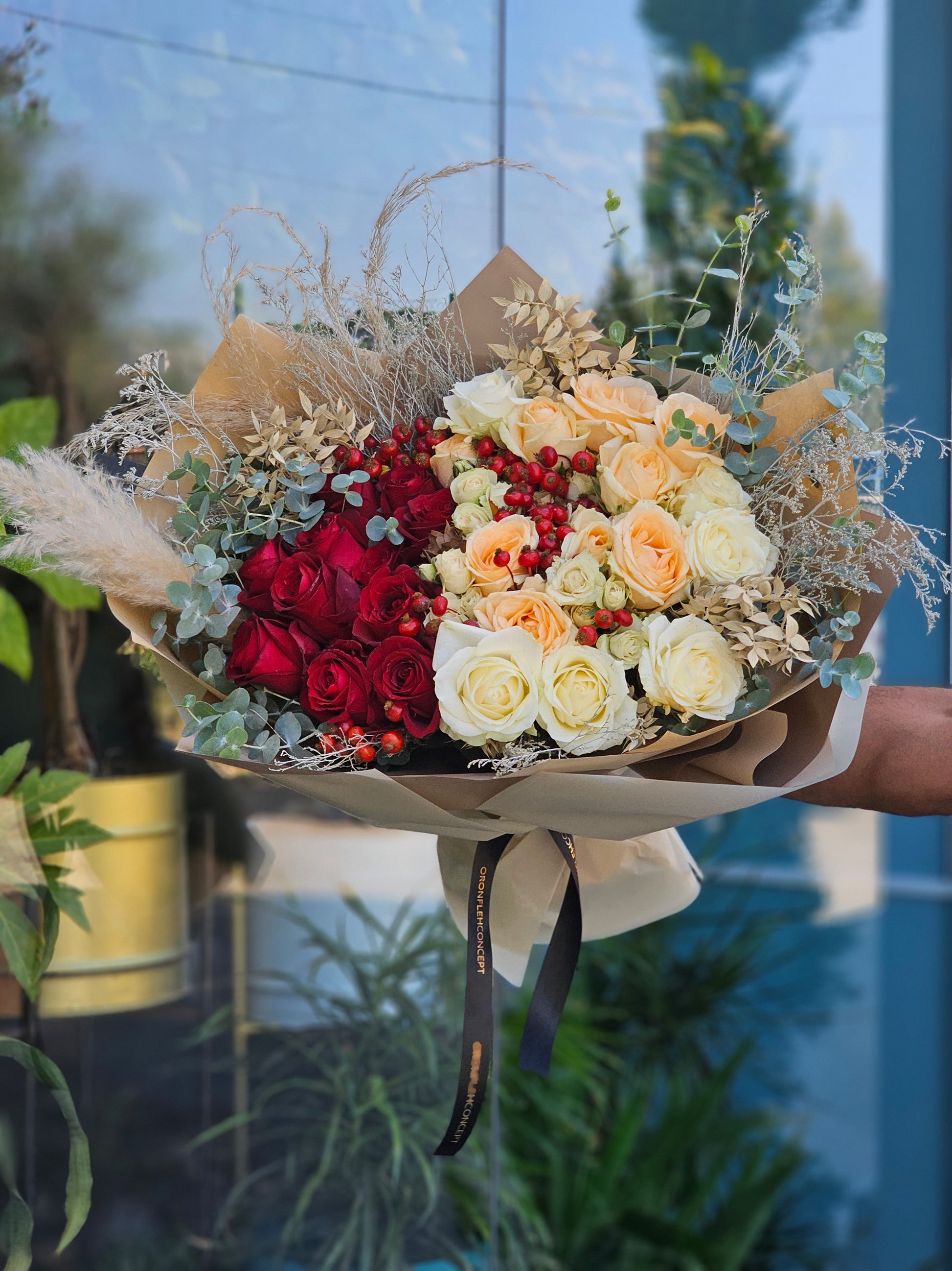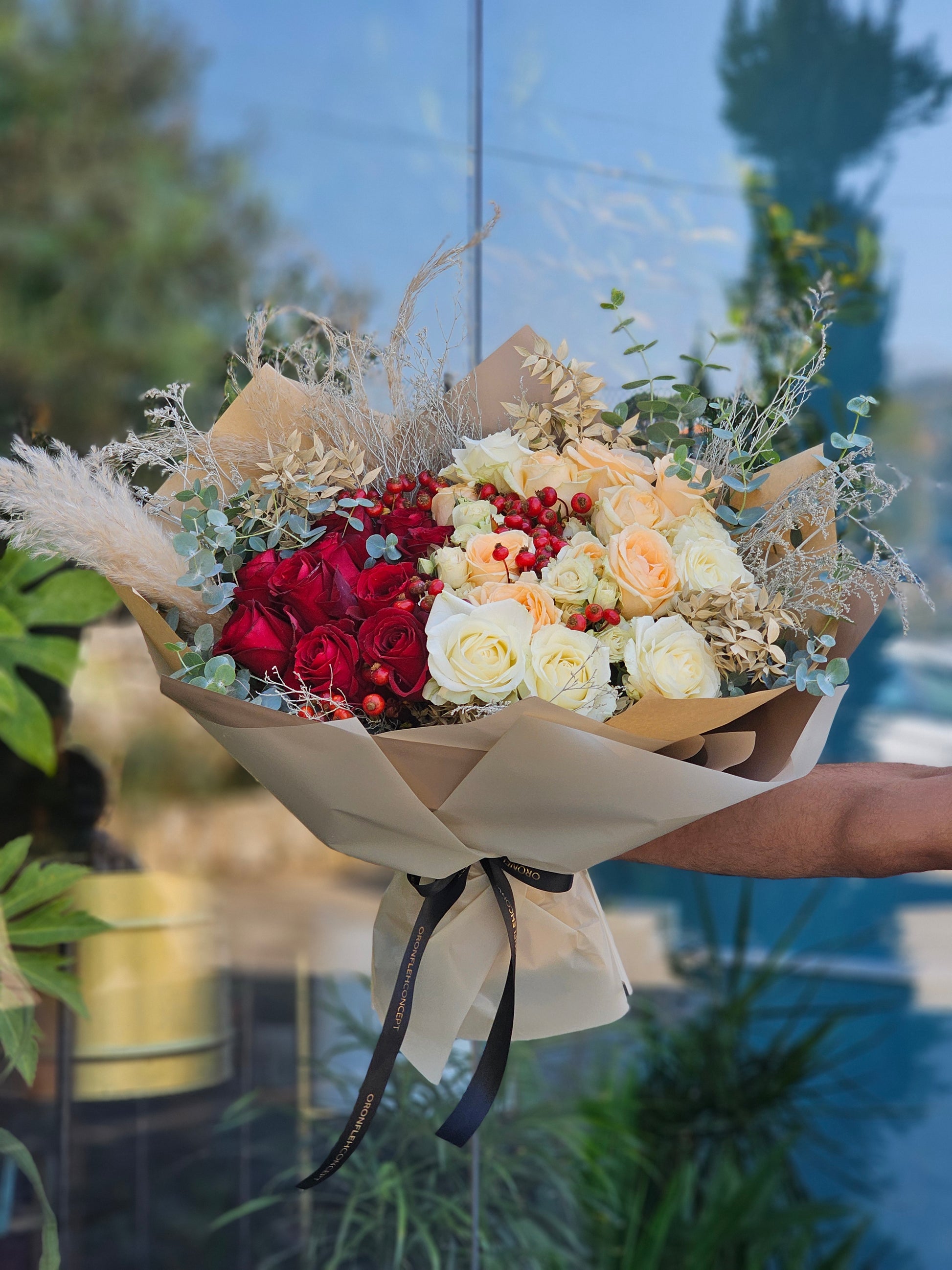 A special Red & salmon flower Bouquet expressing million Reason for love.