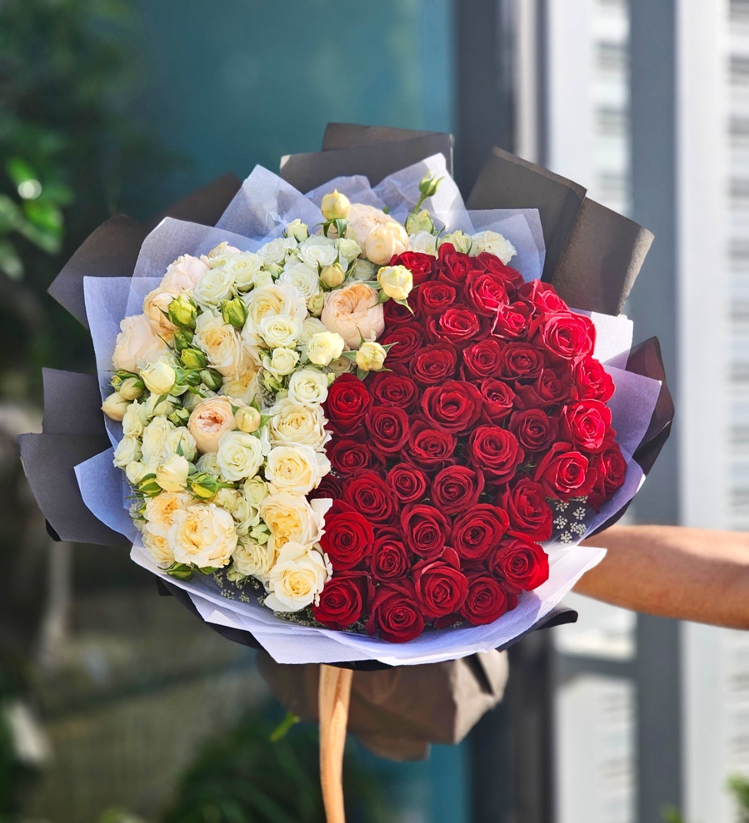 A SPECIAL Red & WHITE BOUQUET in a Luxurious glass vase consisting of Red Roses, White Roses, English Roses.