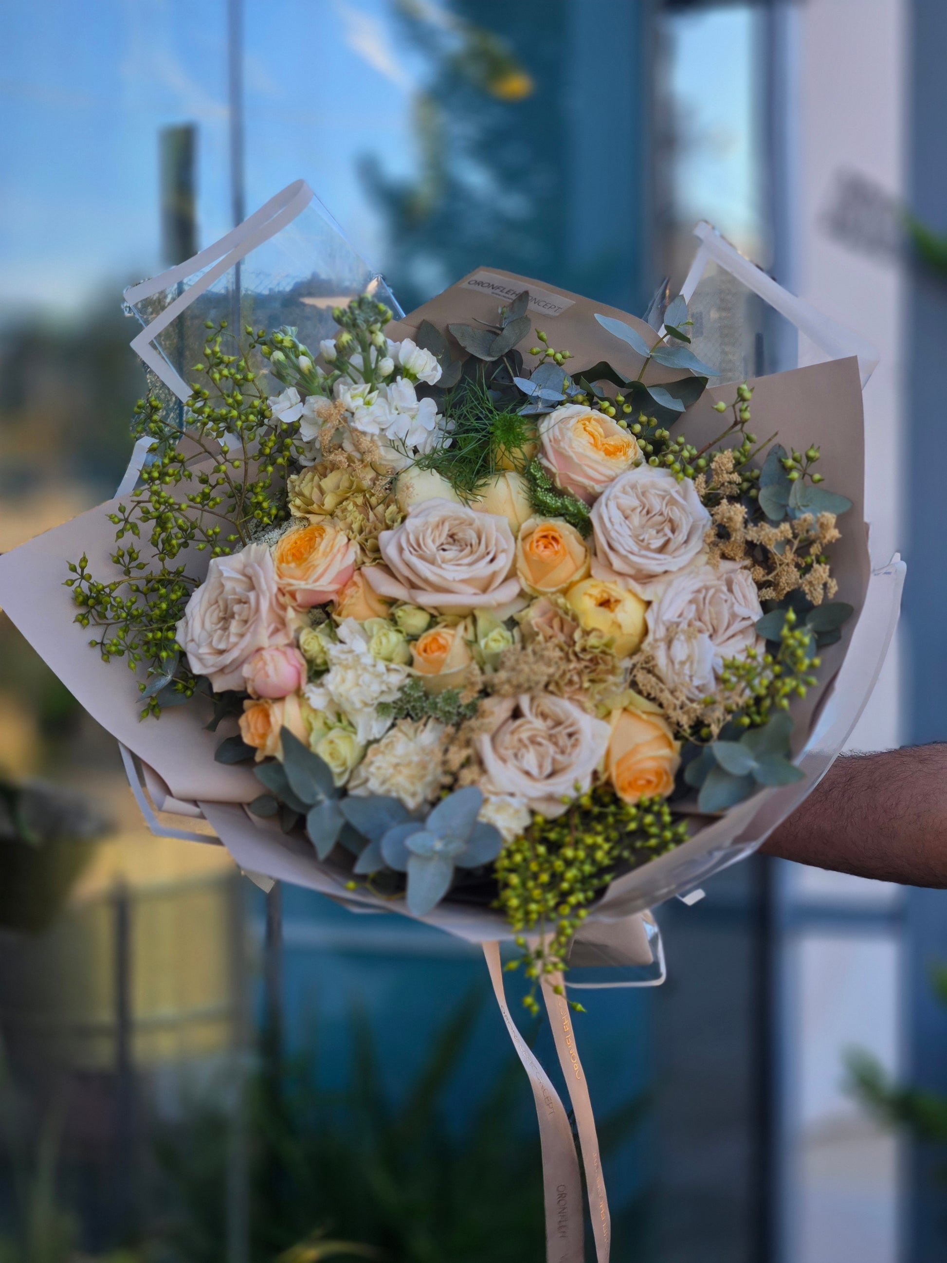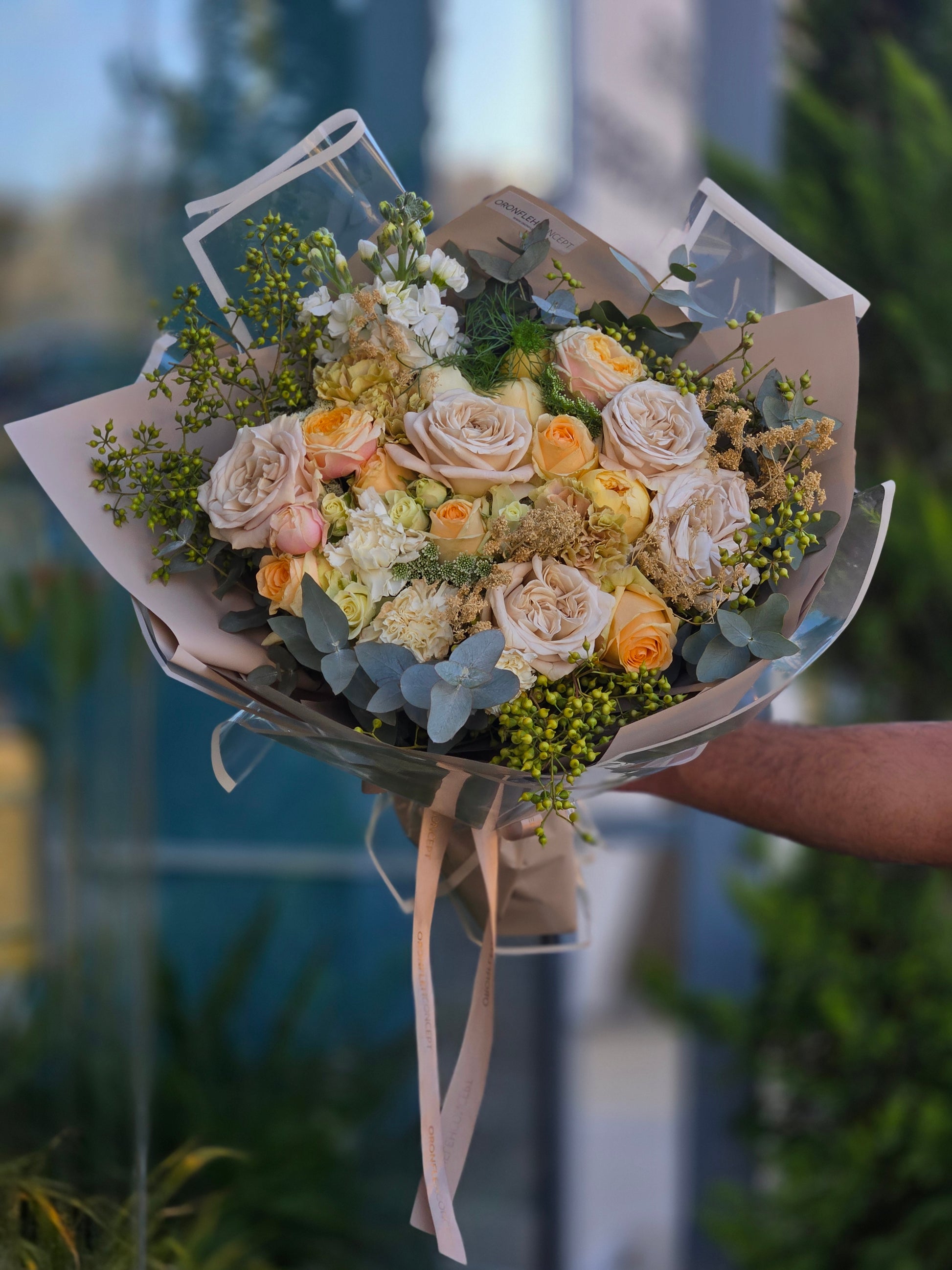 A refined bouquet blending soft ivory, peach, and champagne tones with fresh greenery, creating an elegant and timeless arrangement perfect for warm, heartfelt celebrations.