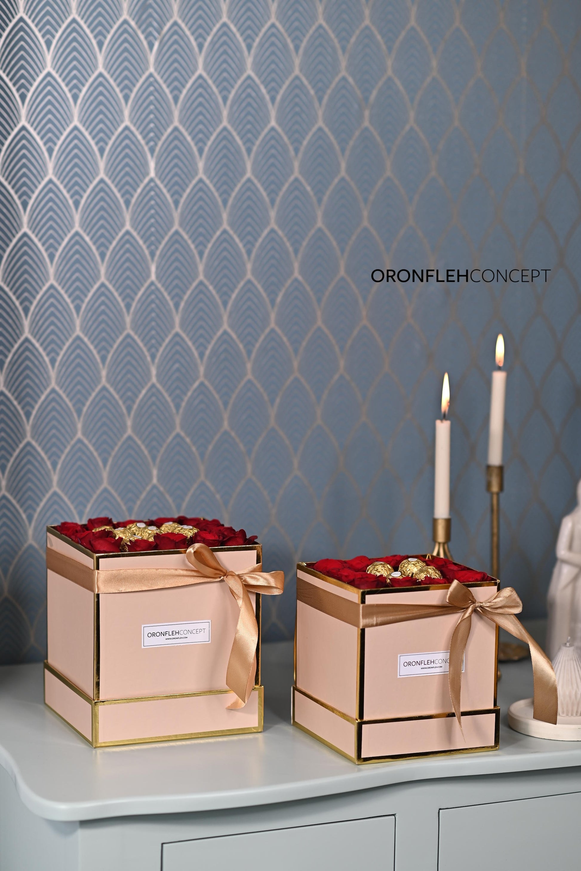 Special VALENTINE'S Oronfleh Concept salmon pink box consisting of Red Roses & Ferrero Chocolate.