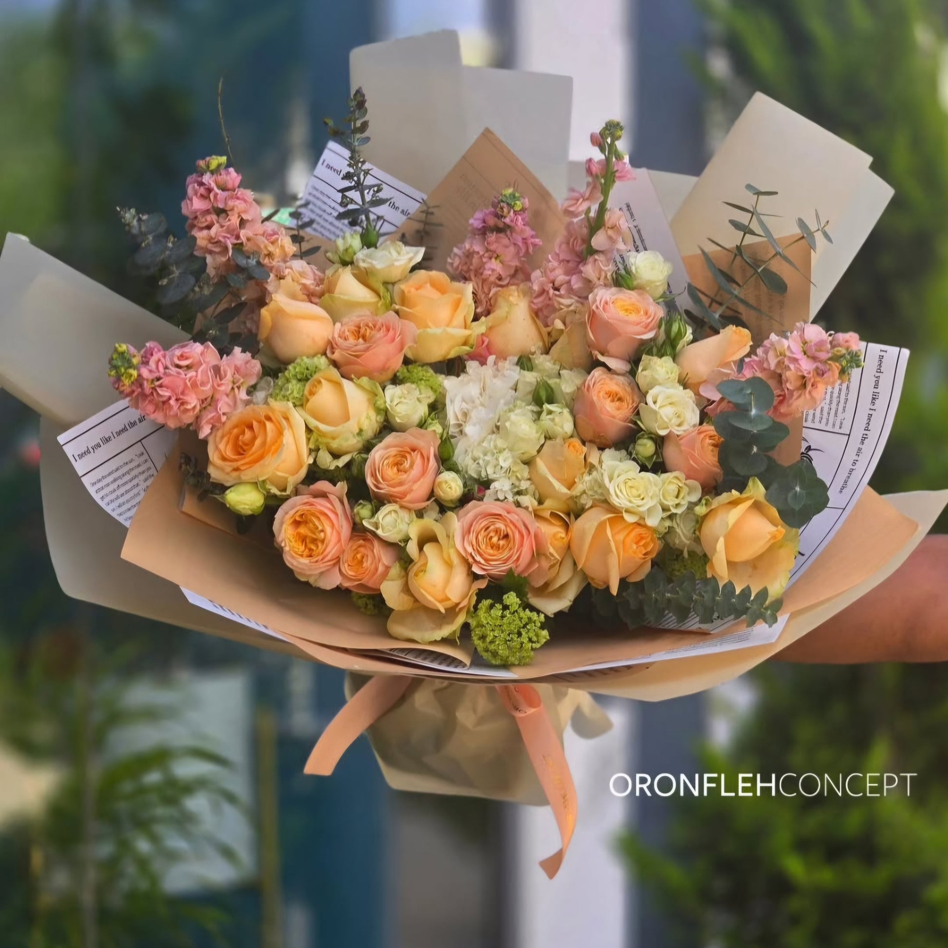A soft harmony of peach and blush roses, delicate blooms, and fresh greenery, Peach Whisper captures warmth, elegance, and gentle romance—perfect for celebrating heartfelt moments with timeless charm 🌸