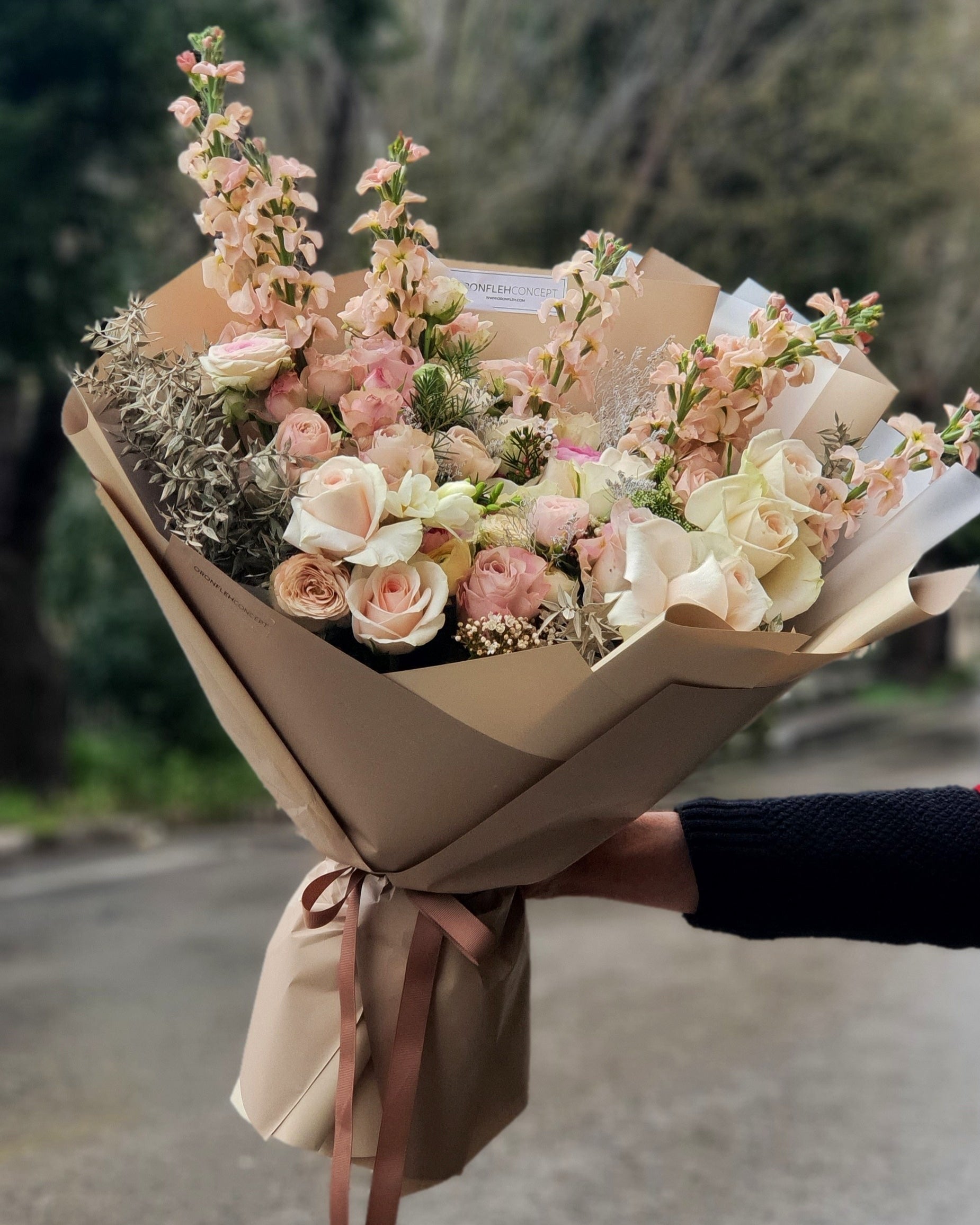 A fresh bouquet consisting of Light pink Roses, Baby Roses, Wallflower, Dried flowers , Wox Flowers & Ruscus