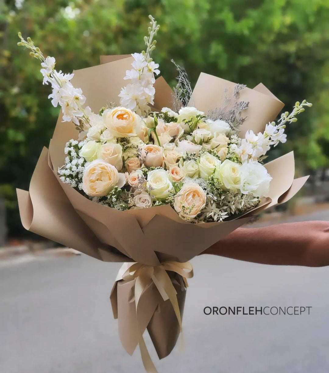 Nude flower bouquet consisting of Roses, English Roses, Baby Roses, Wallflower, limonium & Ruscus.