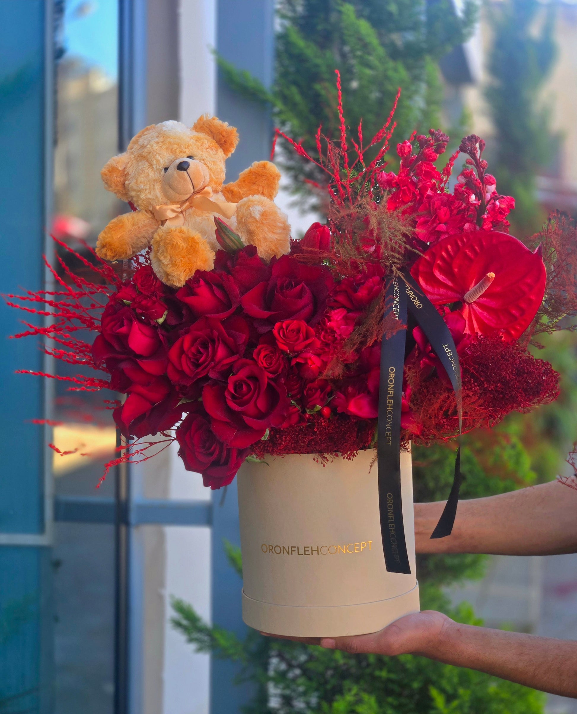 A romantic luxury box overflowing with rich red roses and elegant seasonal blooms, crowned with a charming teddy bear for a sweet, heartfelt touch. Scarlet Hug is the perfect gift to express deep love, warmth, and unforgettable affection.