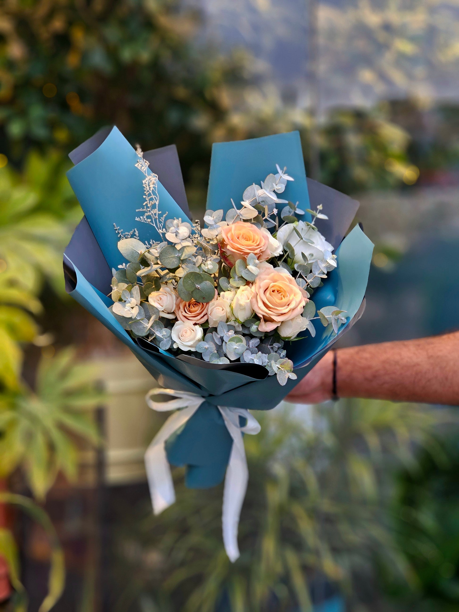 A small fresh bouquet consisting of Peach Roses, Baby Roses & eucalyptus .