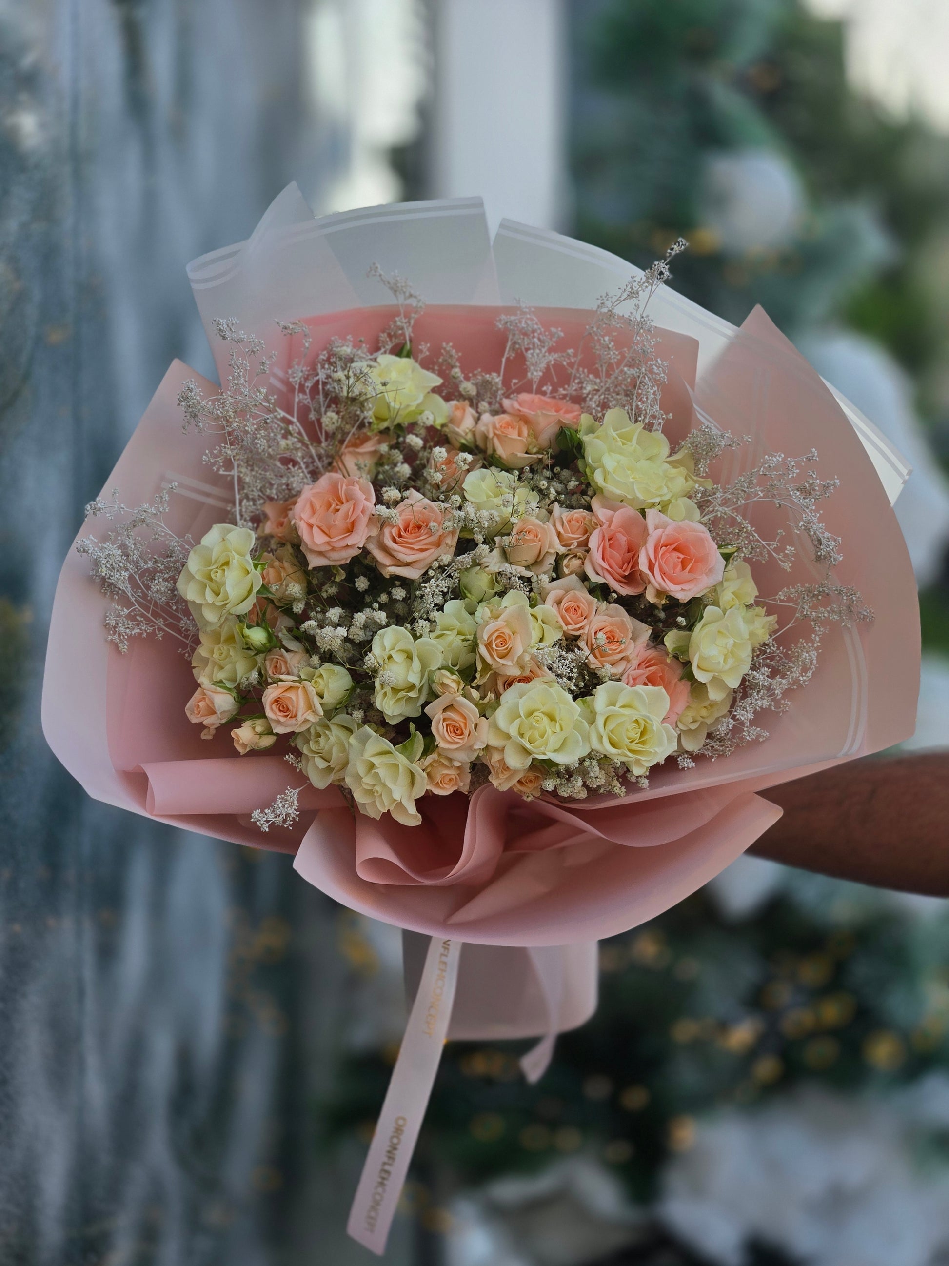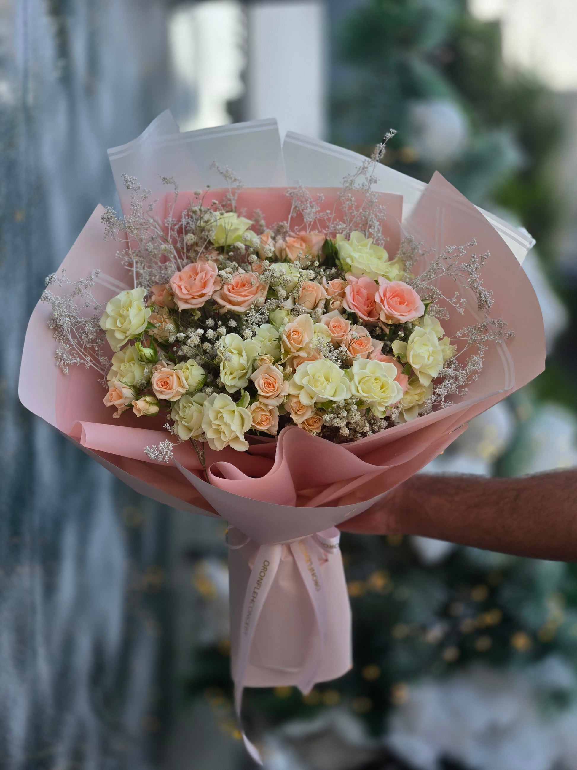 A dreamy blend of soft peach and creamy white roses, delicately arranged with baby’s breath and wrapped in blush pink for a romantic, timeless touch. Perfect for celebrations, heartfelt gifts, or simply brightening someone’s day.